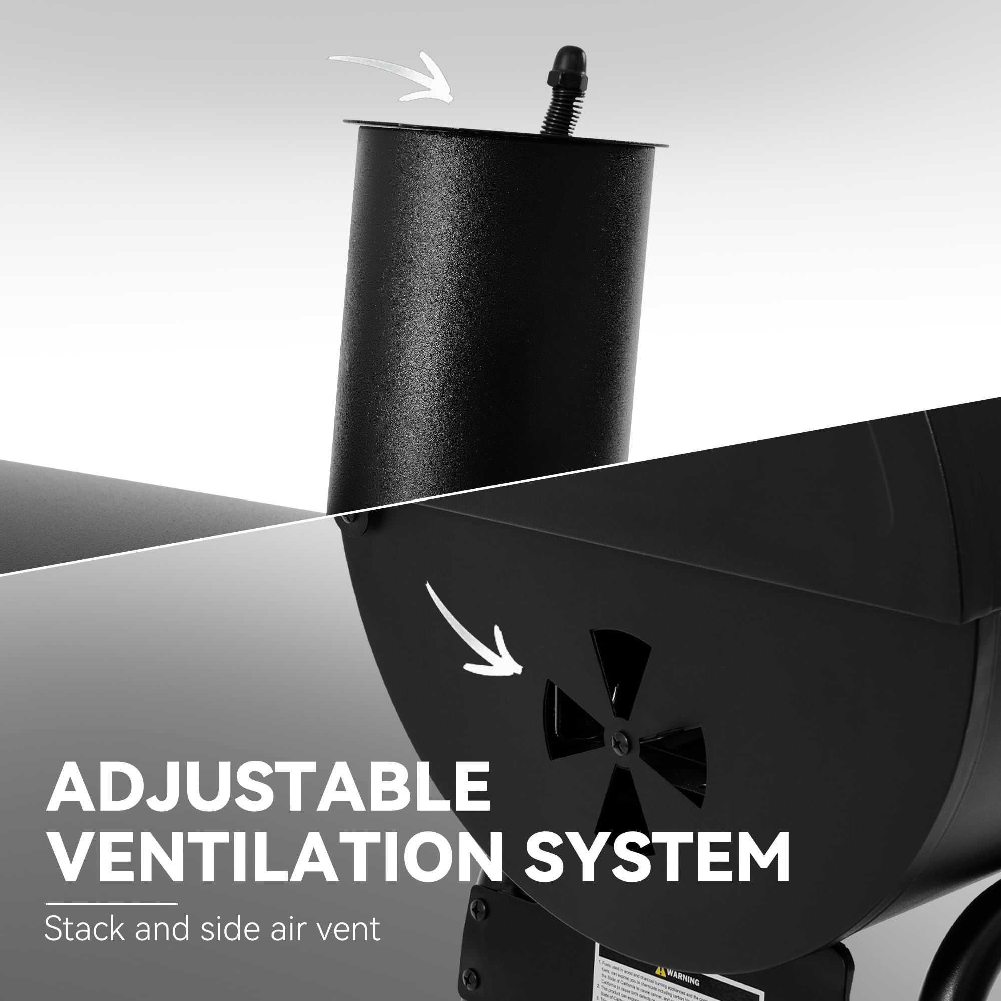 Easy Heat Control: Take charge of your grilling! Close the side air vent fully to cut off oxygen and extinguish coals when done. Plus, adjust the smoke stack for extra heat tweaks. Whether searing steaks or slow-cooking burgers, you'll get the heat just right