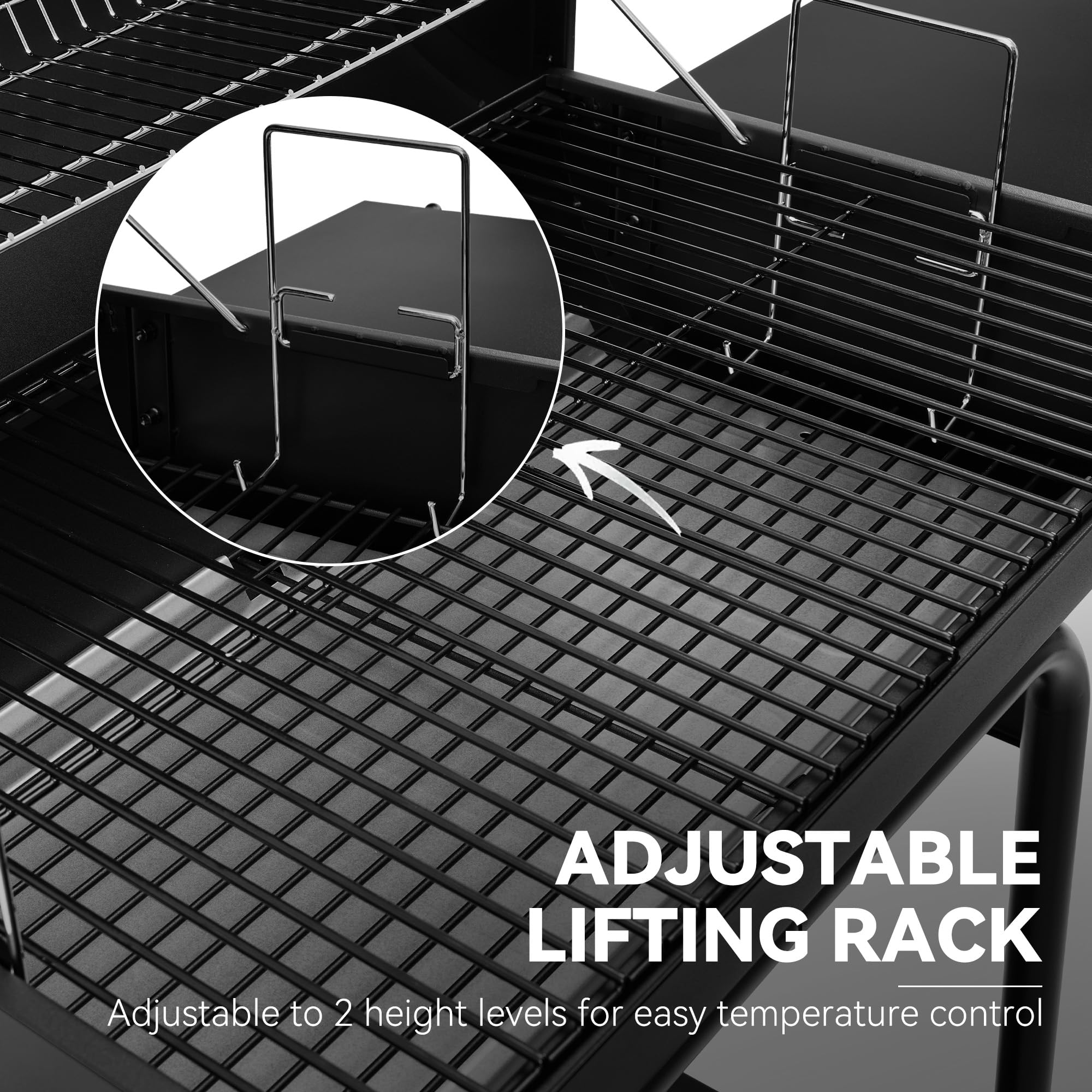 Adjustable Lifting Rack: The 2-level height-adjustable grill charcoal pan provides enhanced control over cooking temperatures by adjusting the distance between the food and the heat source
