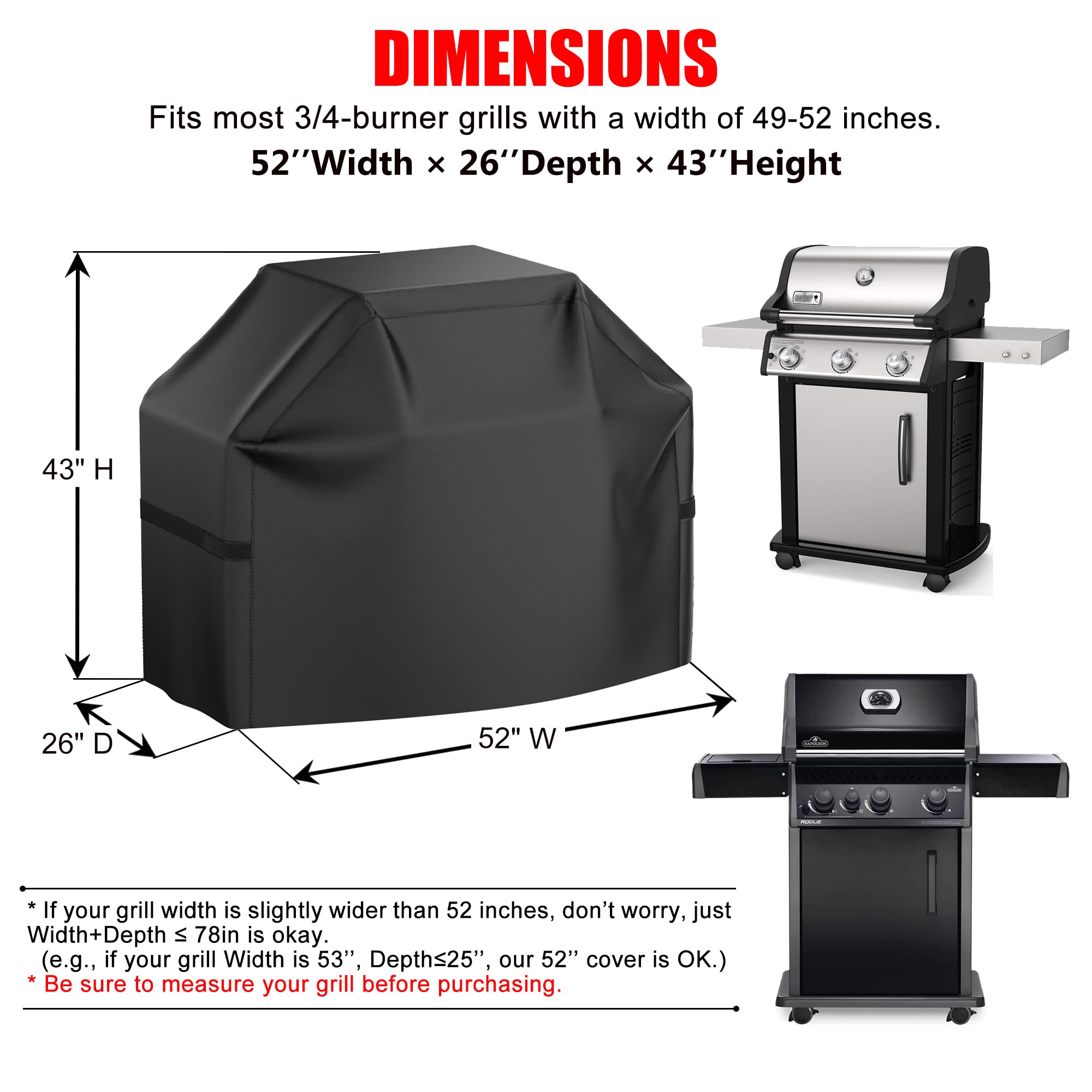 [Dimensions] W x D x H: 52'' x 26'' x 43'', fits most 3-burner or 4-burner grills up to 52'' wide. If your grill width is slightly wider than 52 inches (within 54'), it's okay as long as the width plus depth is less than or equal to 78 inches. The choice of grill cover depends on the size of your grill, please make sure to measure your grill before purchasing. If you are unsure which size of bbq cover is suitable for your grill, please contact us with the size of your grill.