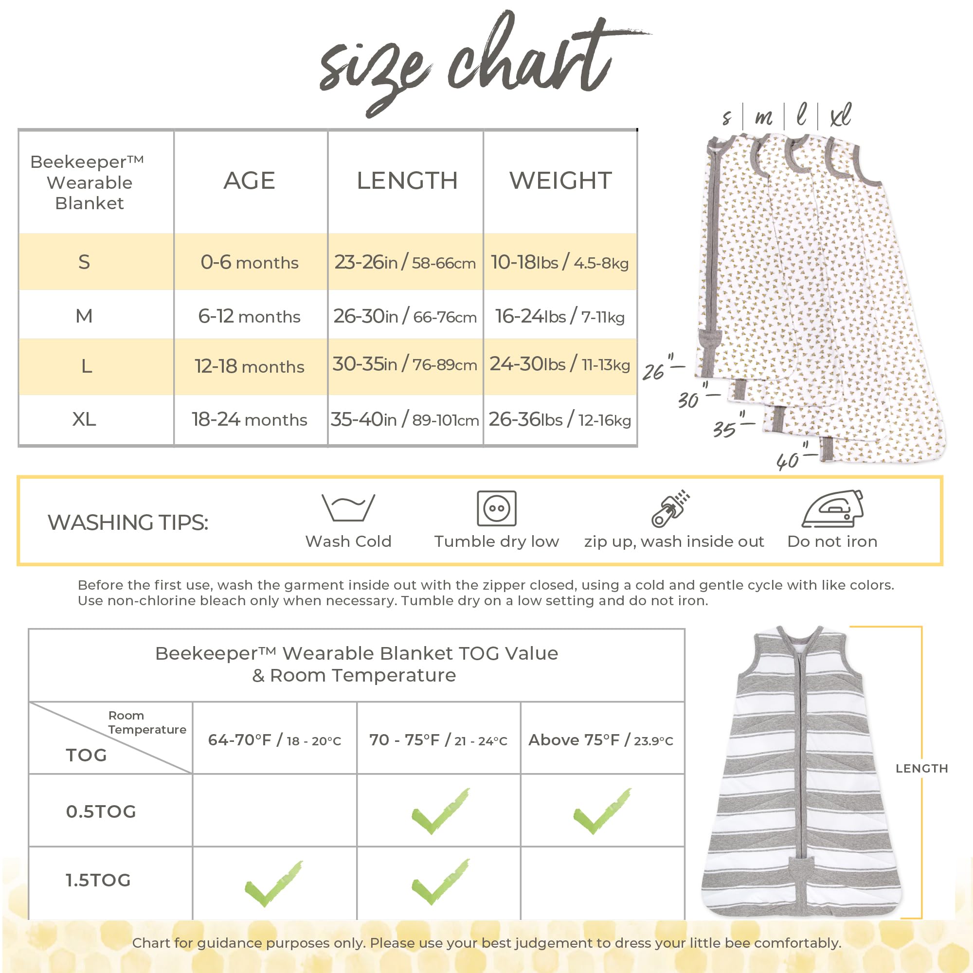 Easy to Use and Wash: The zipper closure makes this baby beekeeper easy to use. The zipper opens from the bottom for effortless late-night diaper changes. These beekeepers are easy to care for. Cold machine wash under a gentle cycle. Then, tumble dry low.