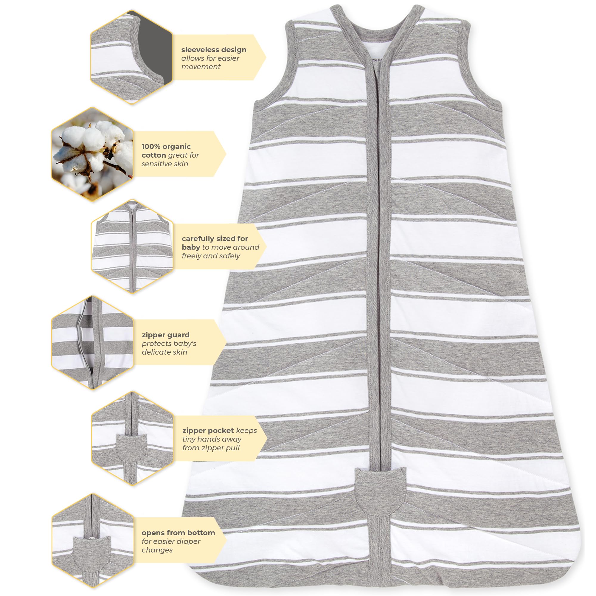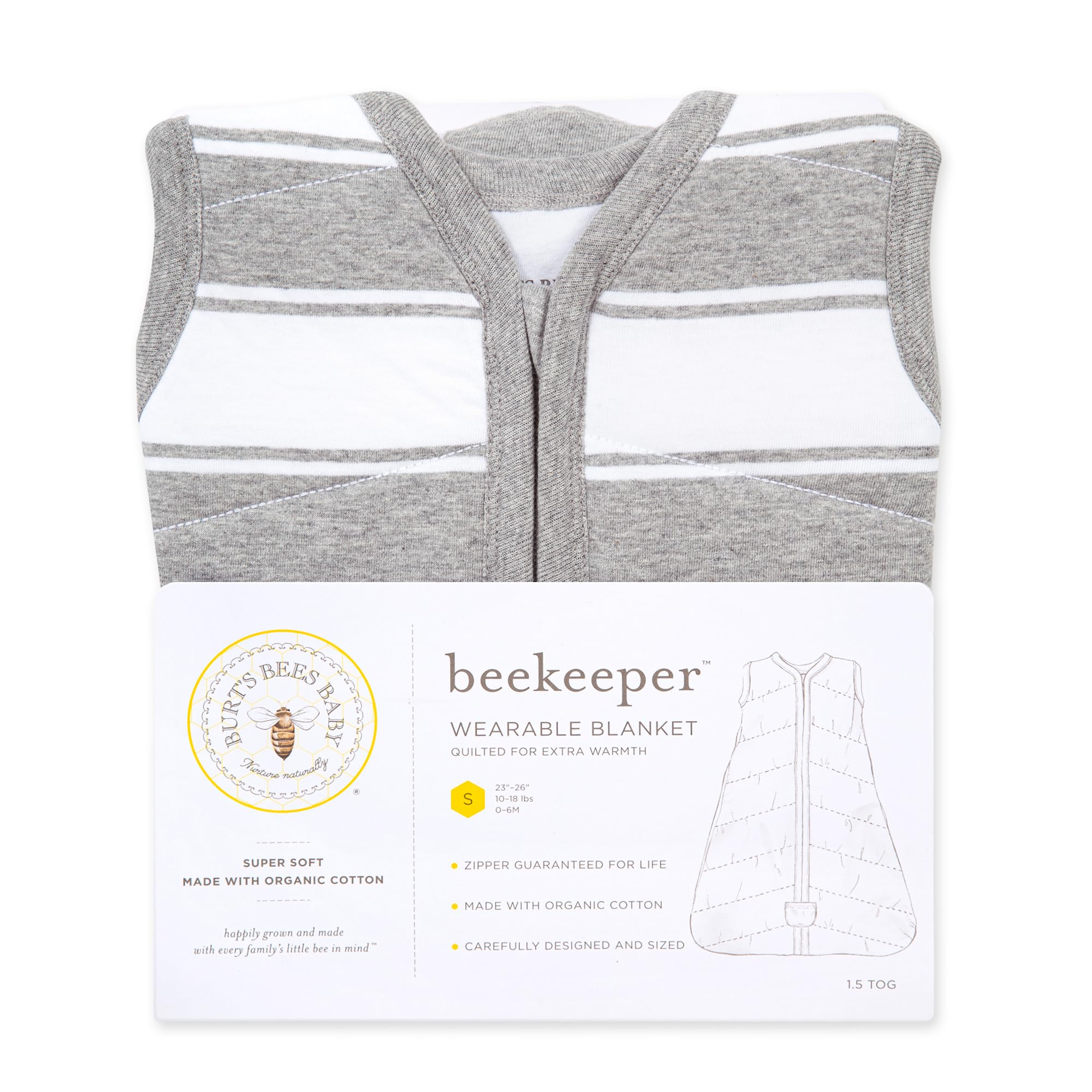 Description Burt's Bees Baby Organic Cotton Wearable Blanket. Designed to replace loose blankets in the crib, certified by CU 831717, 2024. Manufactured according to GOTS standards. Our Beekeeper wearable blanket keeps your little bee cozy, warm, and secure throughout the night. Made from 100% organic cotton. Keep your baby warm and secure with this best wearable blanket, crafted from 100% organic cotton for breathable, gentle comfort. Designed as a safe alternative to loose bedding, this infant wearable blanket promotes restful sleep while meeting top safety standards. Whether you choose the lightweight 0.5 TOG for mild nights or the cozy 1.5 TOG for cold weather, it’s the perfect baby wearable blanket winter option. With a bottom zipper for easy diaper changes and a snug fit that allows natural movement, this wearable blanket baby combines convenience with peace of mind making it a must have for every nursery. Burt’s Bees Baby wearable blanket offers cozy comfort for infants. A top choice for winter, this baby wearable blanket ensures safe sleep with soft, breathable organic cotton.