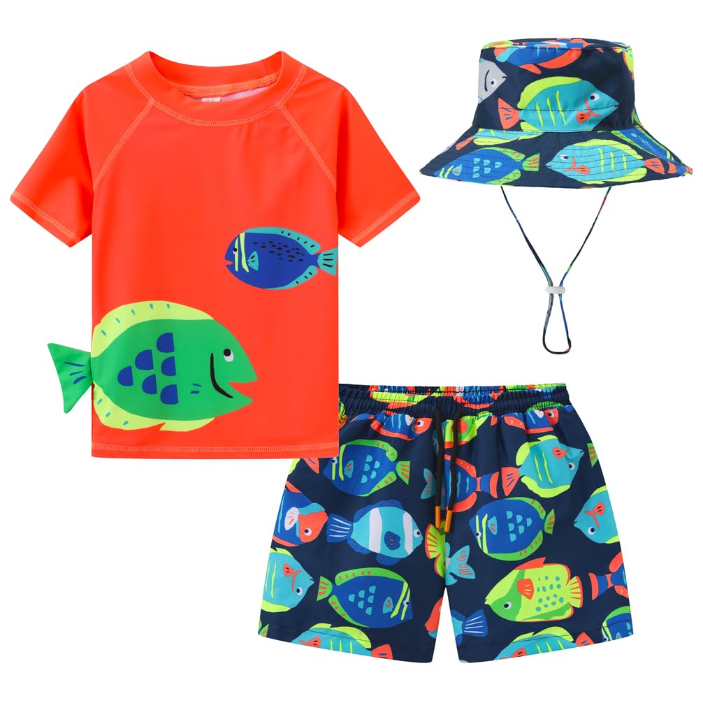 Description HDOBHIO Toddlers and Baby Boys' Swimsuit Trunk and Rashguard Set with Sun Hat UPF 50+ Rashguard, swim trunks & Sun Hat all have UPF 50+ sun protection Quick-drying fabric Sun Hat: The baby sun hat is equipped with high-quality UPF 50+ sun protection polyester and a wide brim, skin-friendly and comfortable, keeping your lovely baby cool, dry and ventilated in bright sunshine. The head strap and chin strap on the baby boy hats are adjustable to easily create the best fit possible, showing off their nifty and lovely while providing comfort. Rash Guards: Features long sleeves, crew neck and graphic design at front. Swimsuit Trunk: Features pull-on gentle elasticized waistband with functional drawstring and mesh lining for easy on/off, side vents at hem and allover print. Baby Boy Swimsuit Rash Guard Features High quality and SPF/UPF 50+ fabric protection against UVA/UVB rays to prevent sunburn.