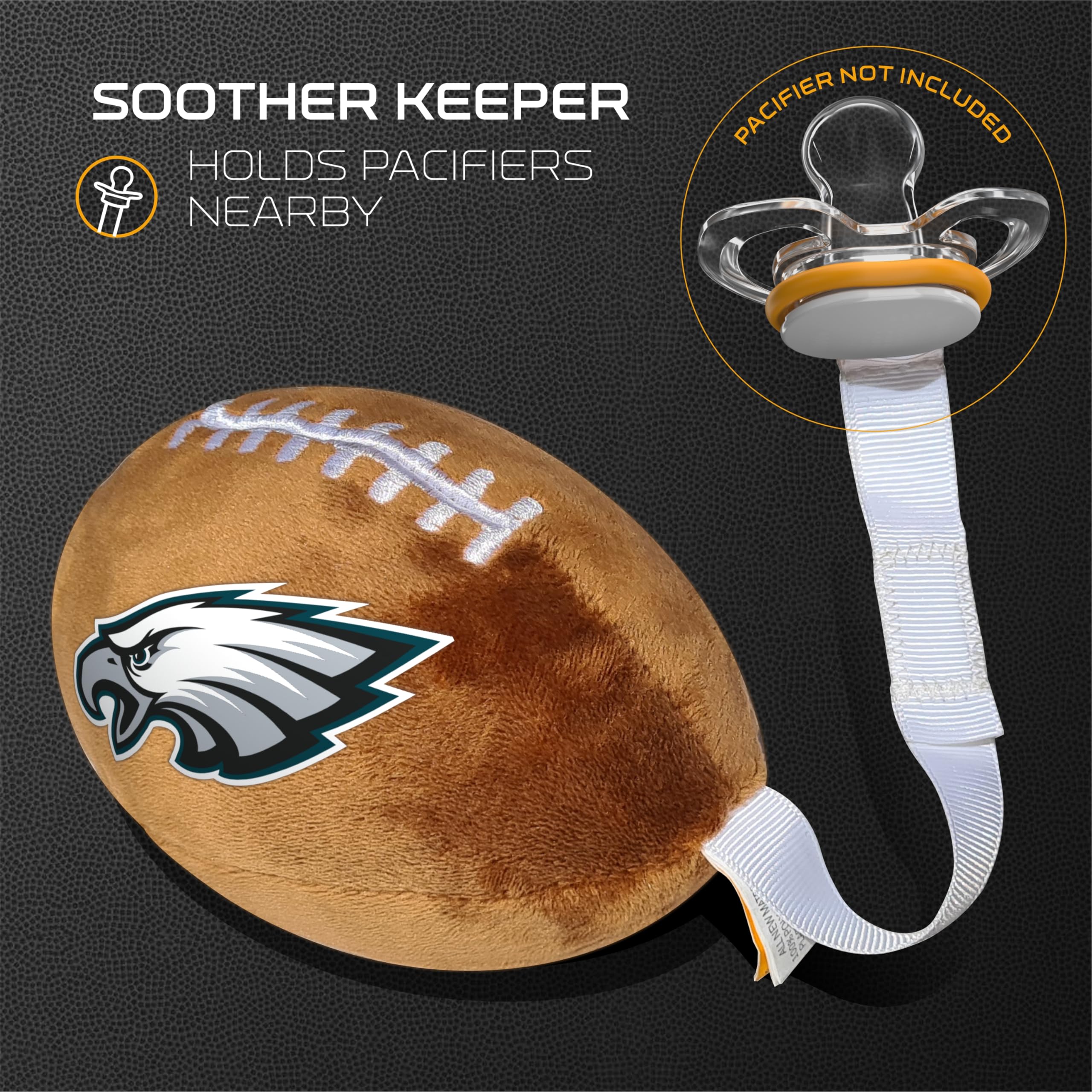 E-A-G-L-E-S Eagles! Official NFL Licensed product β Play like the pros with this soft and safe plush football pacifier holder β perfect baby gift for young fans to show team pride with comfort, style, and spirit! All 32 NFL teams are available.