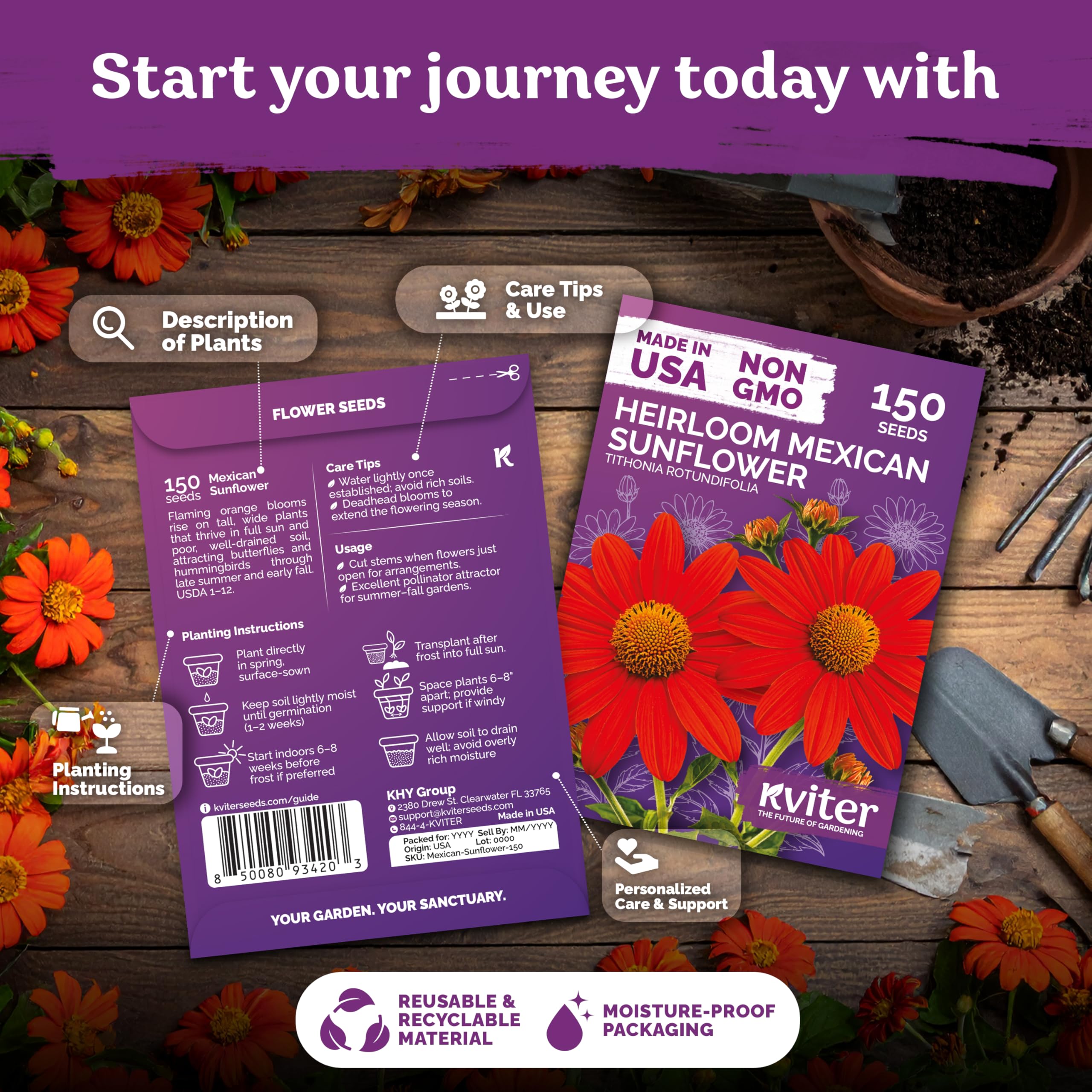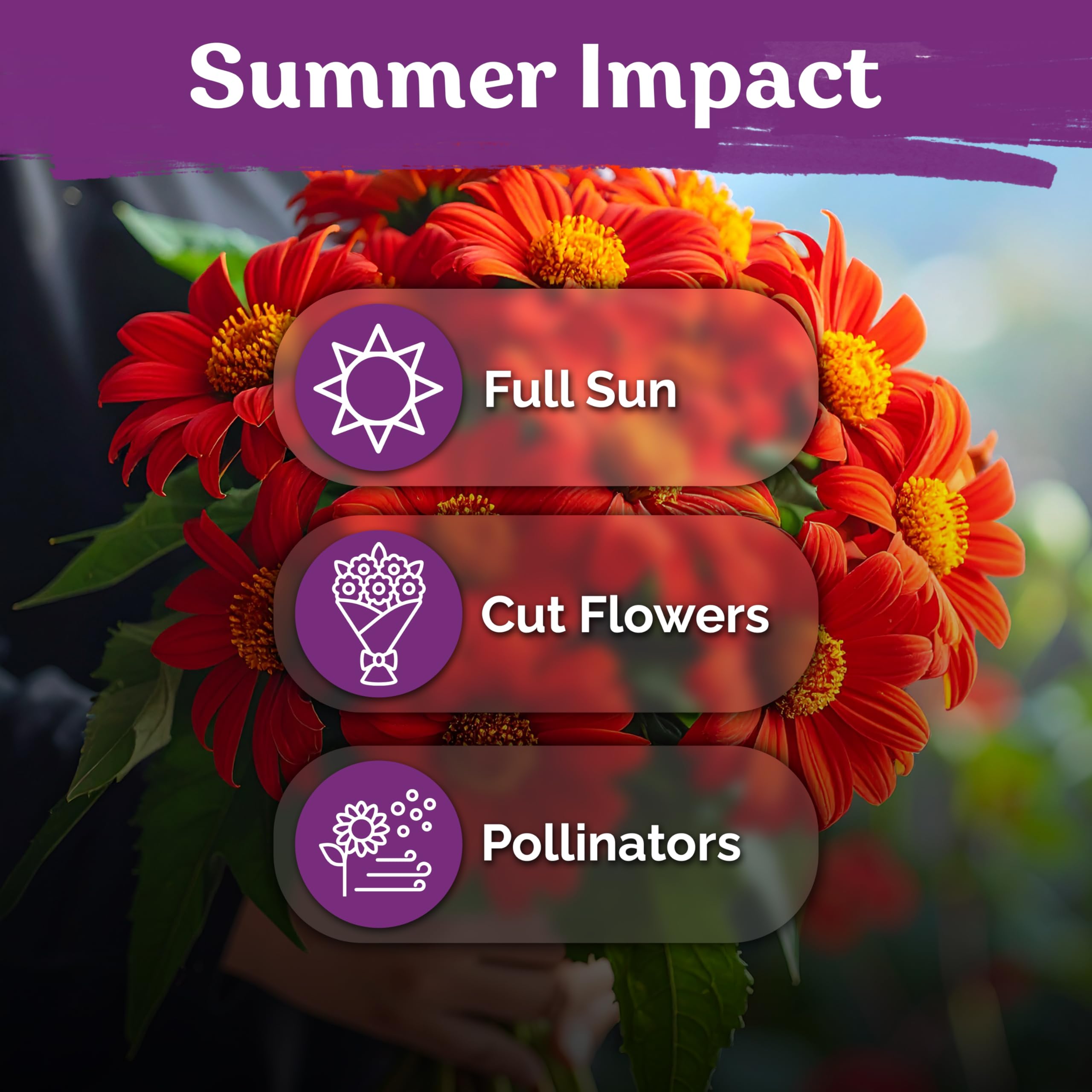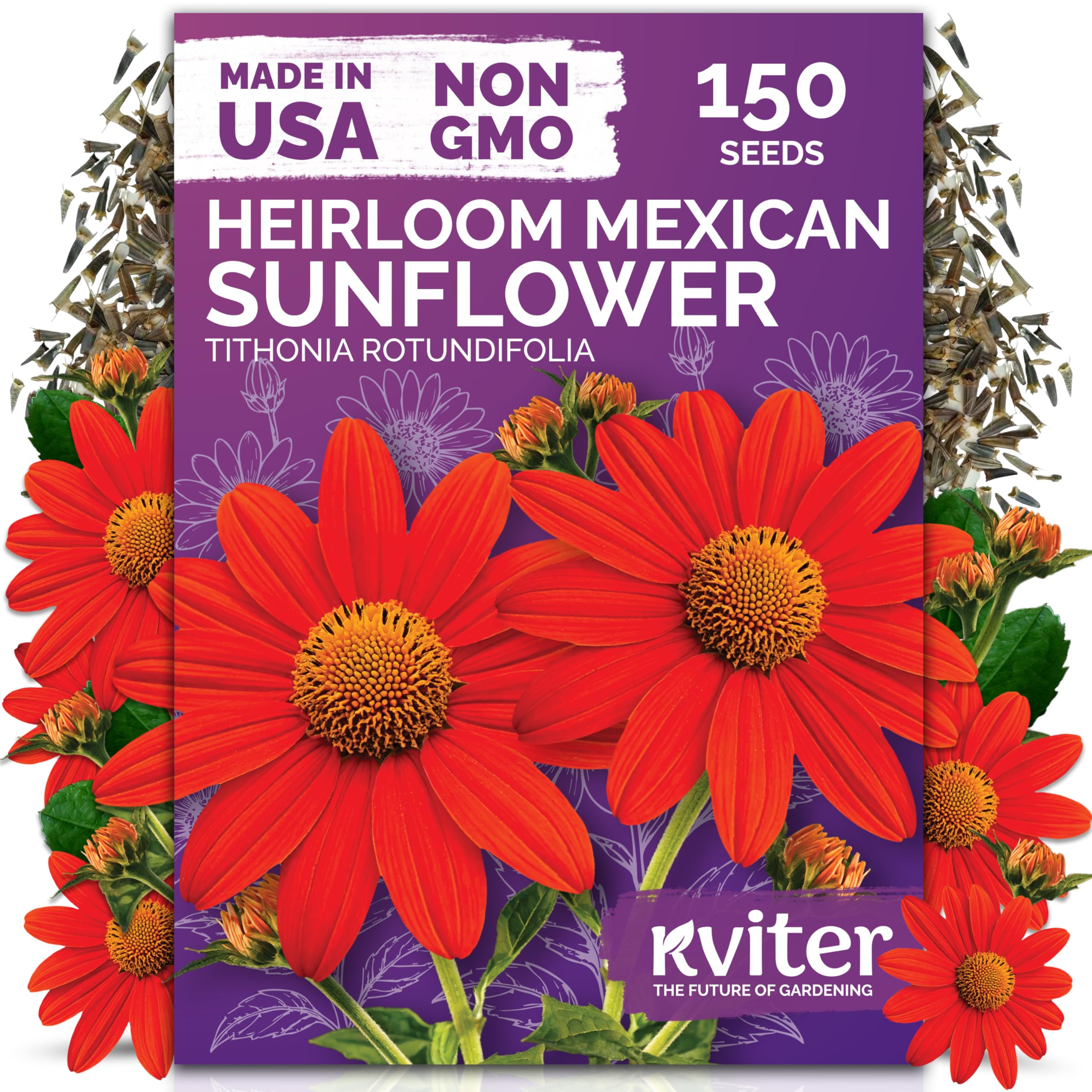 Tall Vigorous Growth: Mexican sunflowers grow into strong upright plants reaching up to 60 inches tall in full sun flower gardens across USDA zones 1–12. Super easy to grow seeds for planting flowers.