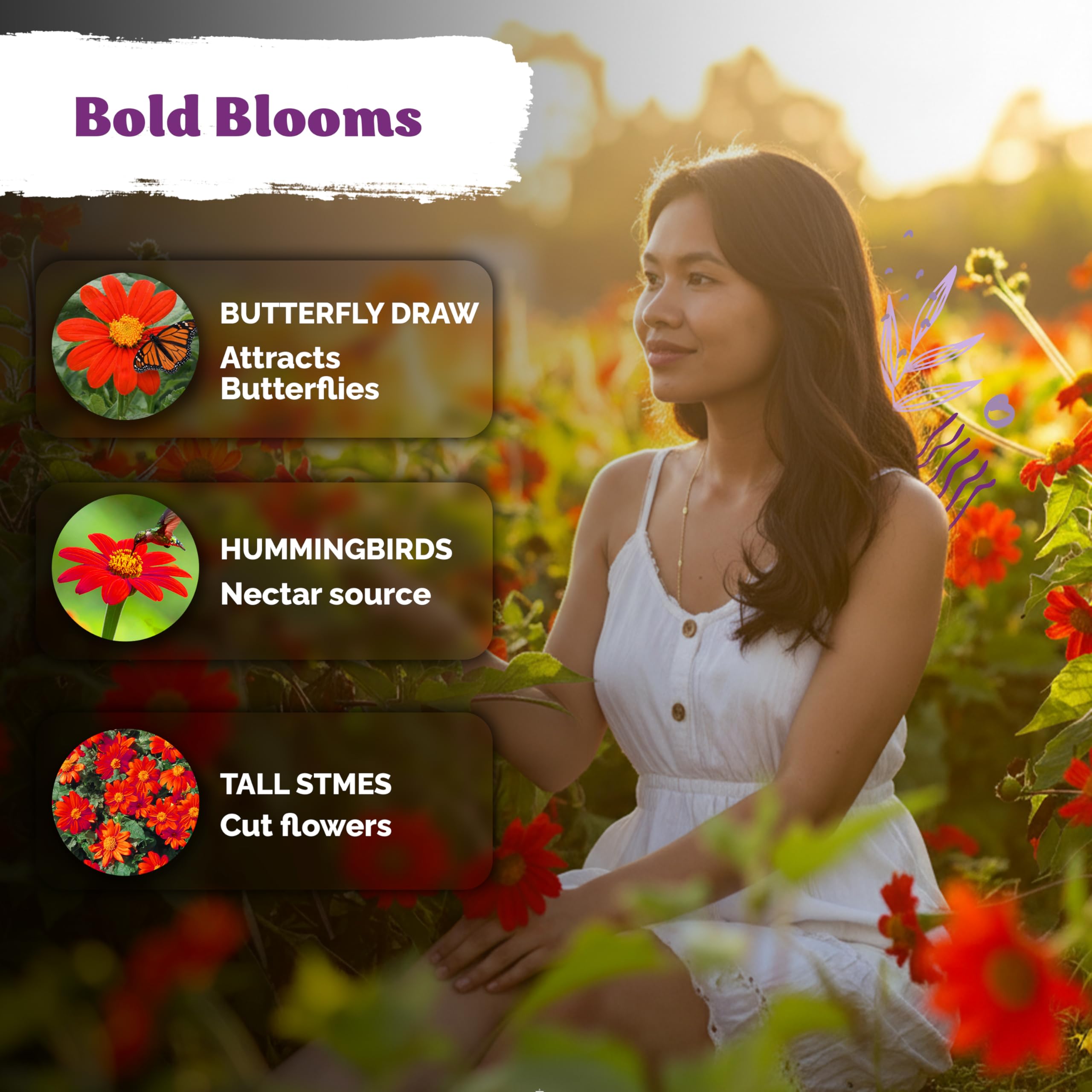 Pollinator Magnet: Mexican torch sunflower seeds attract butterflies and hummingbirds in large numbers, making these orange sunflowers a top choice for annual flower seeds and wildlife friendly gardens.