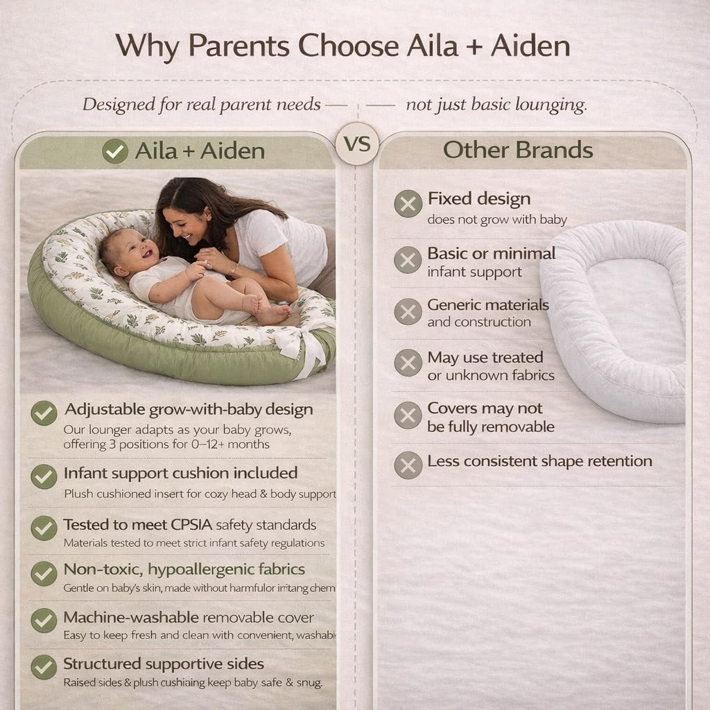 Gentle Comfort for Your Baby – Designed with ultra-soft 100% organic cotton and breathable materials, the Aila + Aiden baby lounger offers a cozy space for daytime use, tummy time, diaper changes, and bonding moments.