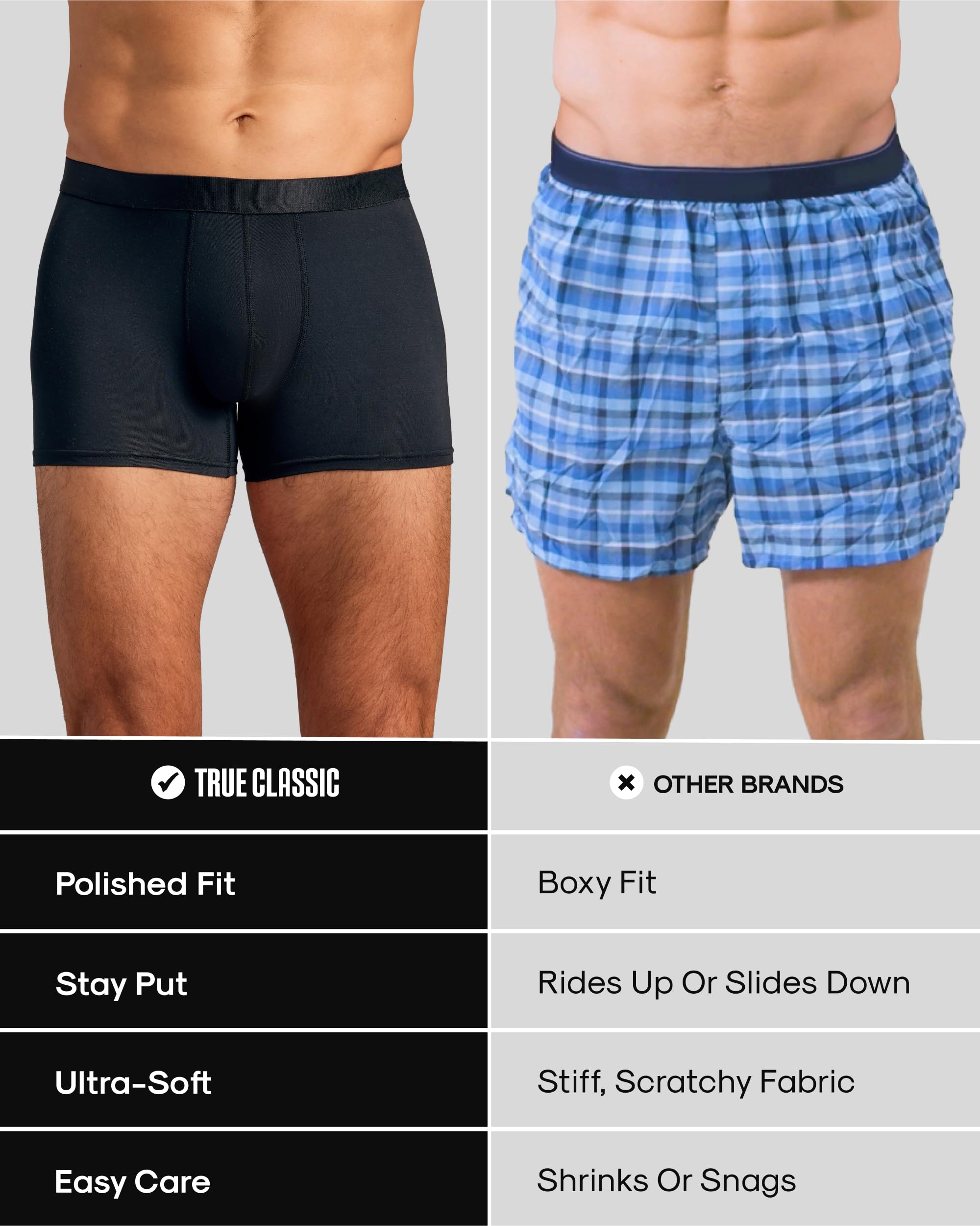 YOUR LENGTH, YOUR STYLE: Choose 6โ inseam for extended coverage (boxer brief) or 4โ inseam for a modern trunk. Our logo menโs boxer briefs feature the True Classic waistband. Our mens boxers come in Black, Carbon, and Navy, sizes S-3XL.