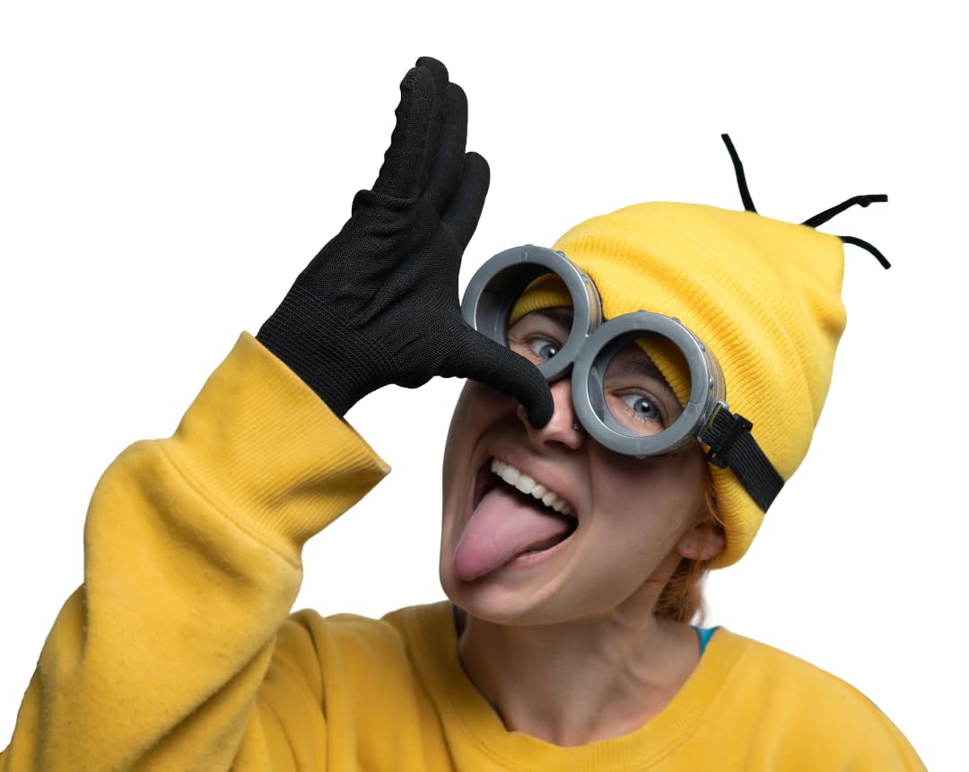 Costume Set for Women and Men, One Size, Unisex Includes Three Pieces, a Yellow Beanie Hat, Silver Rimmed Goggles, Glasses and Black Gloves