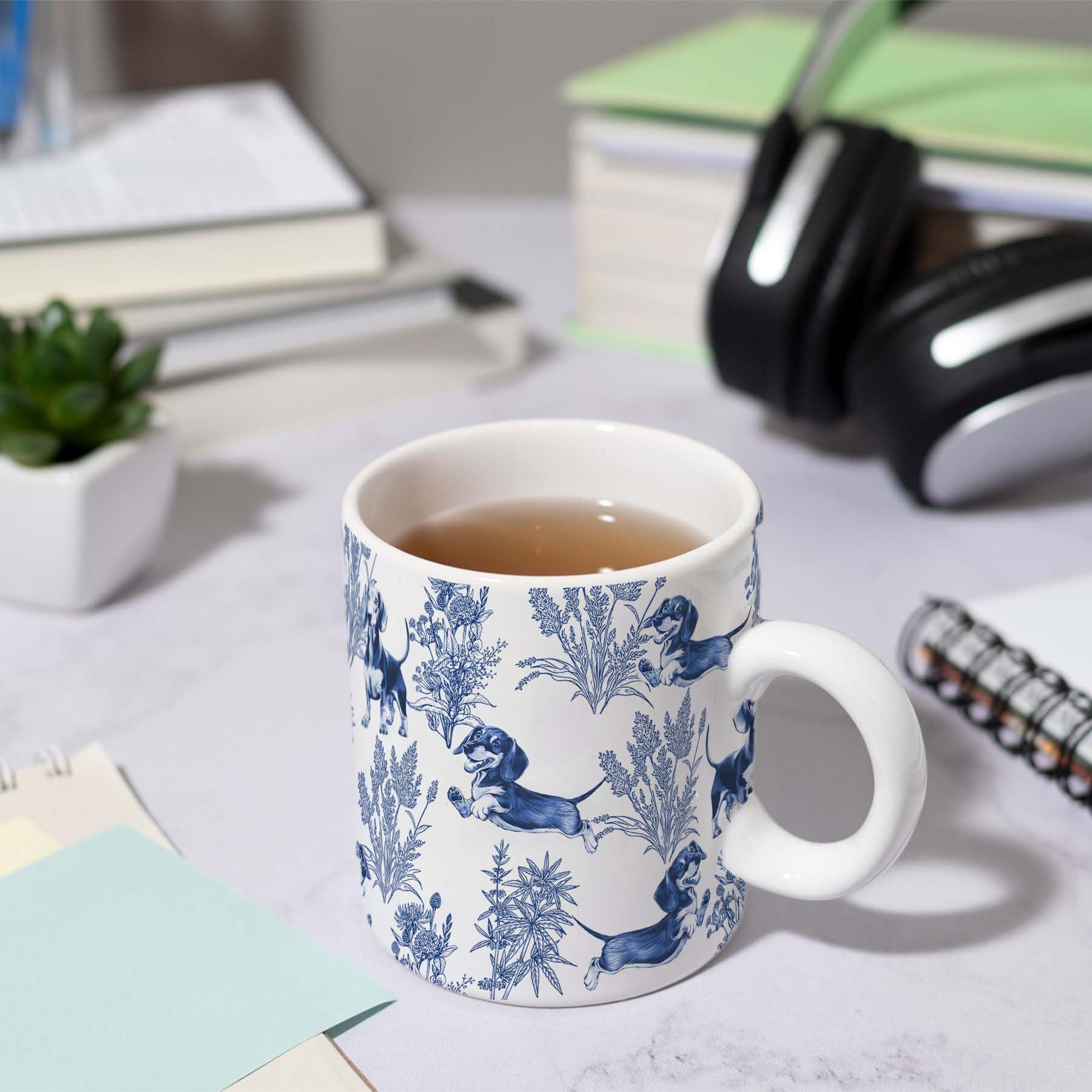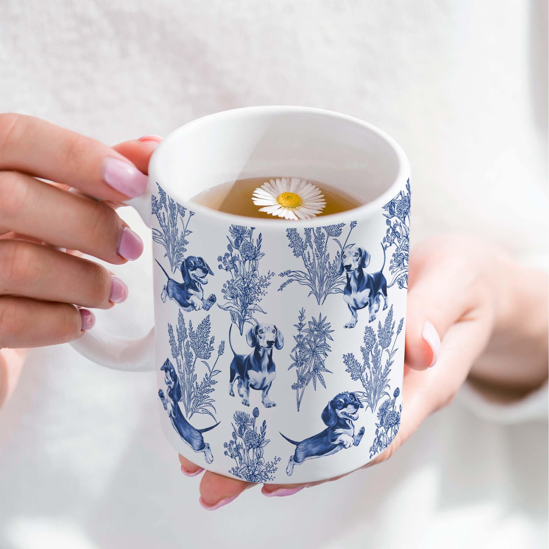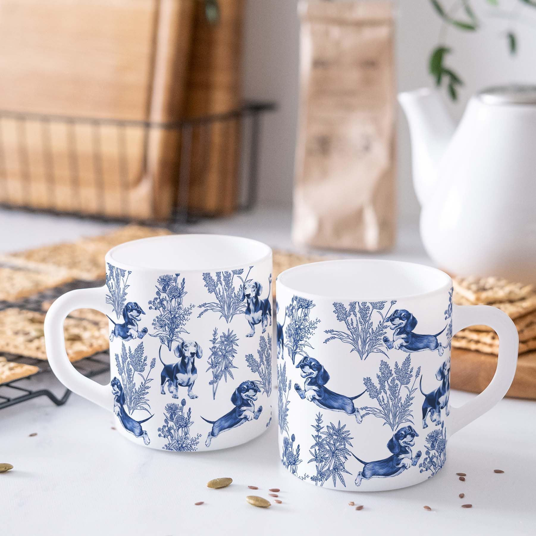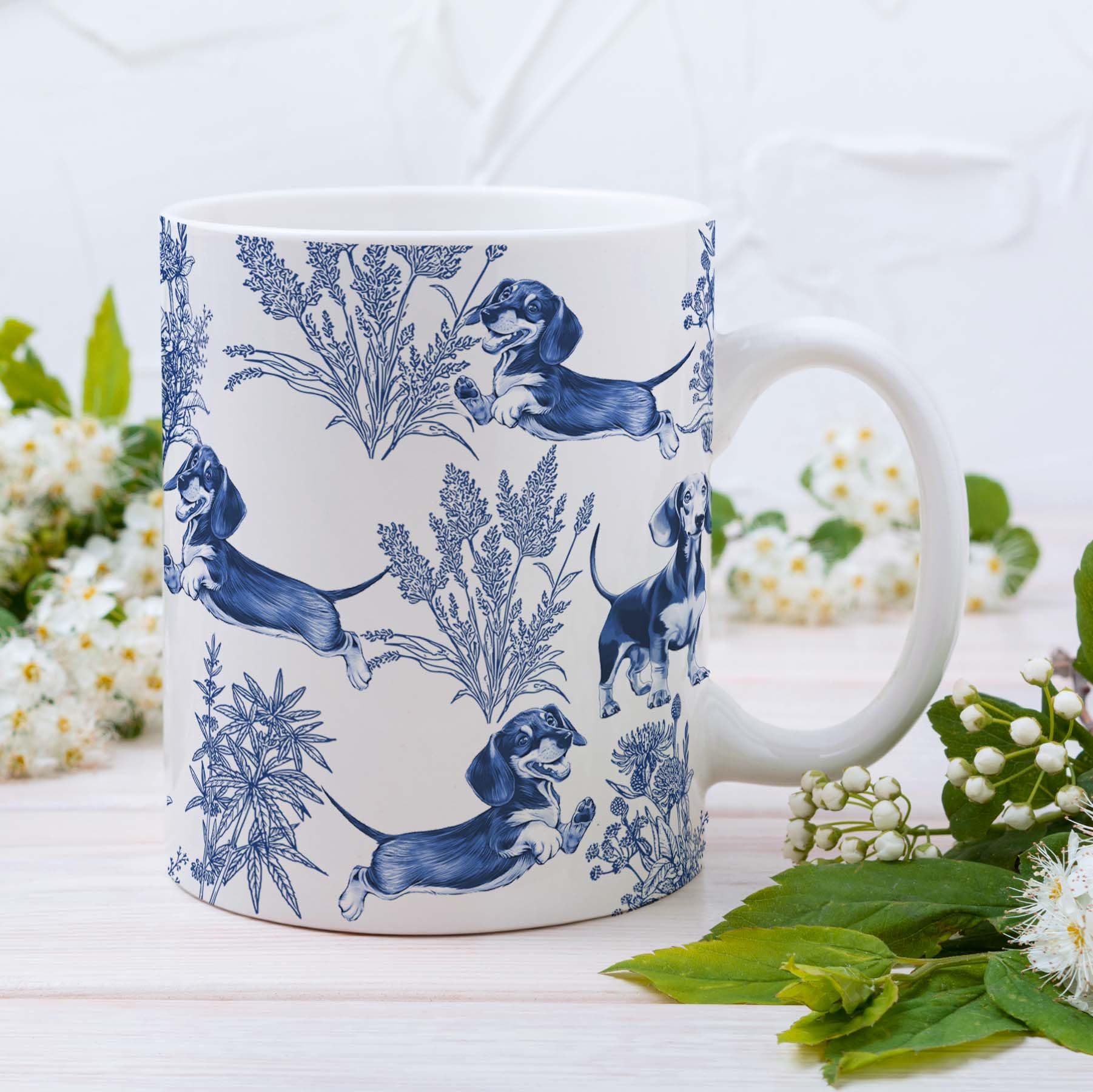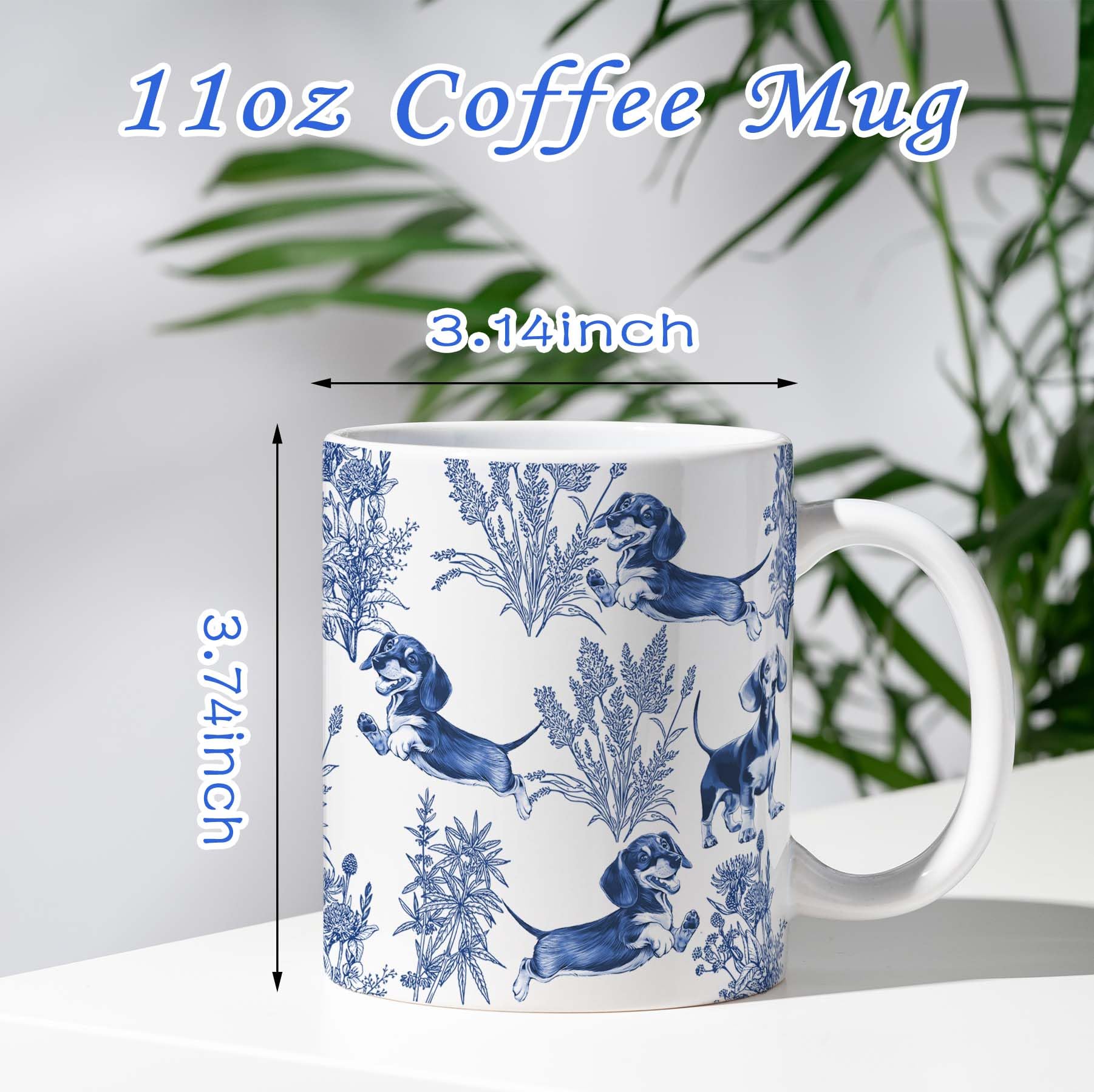 Elegant French design: Our sophisticated Dachshund blue French Toile mug combines classic style with canine charm, making it perfect for any Dachshund lover! Featuring a blue Toile pattern of the Dachshund, this mug adds an air of timeless elegance to your coffee or tea. The exquisite French design makes it a unique addition to any collection or a thoughtful gift.