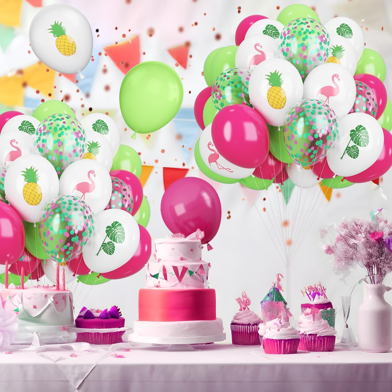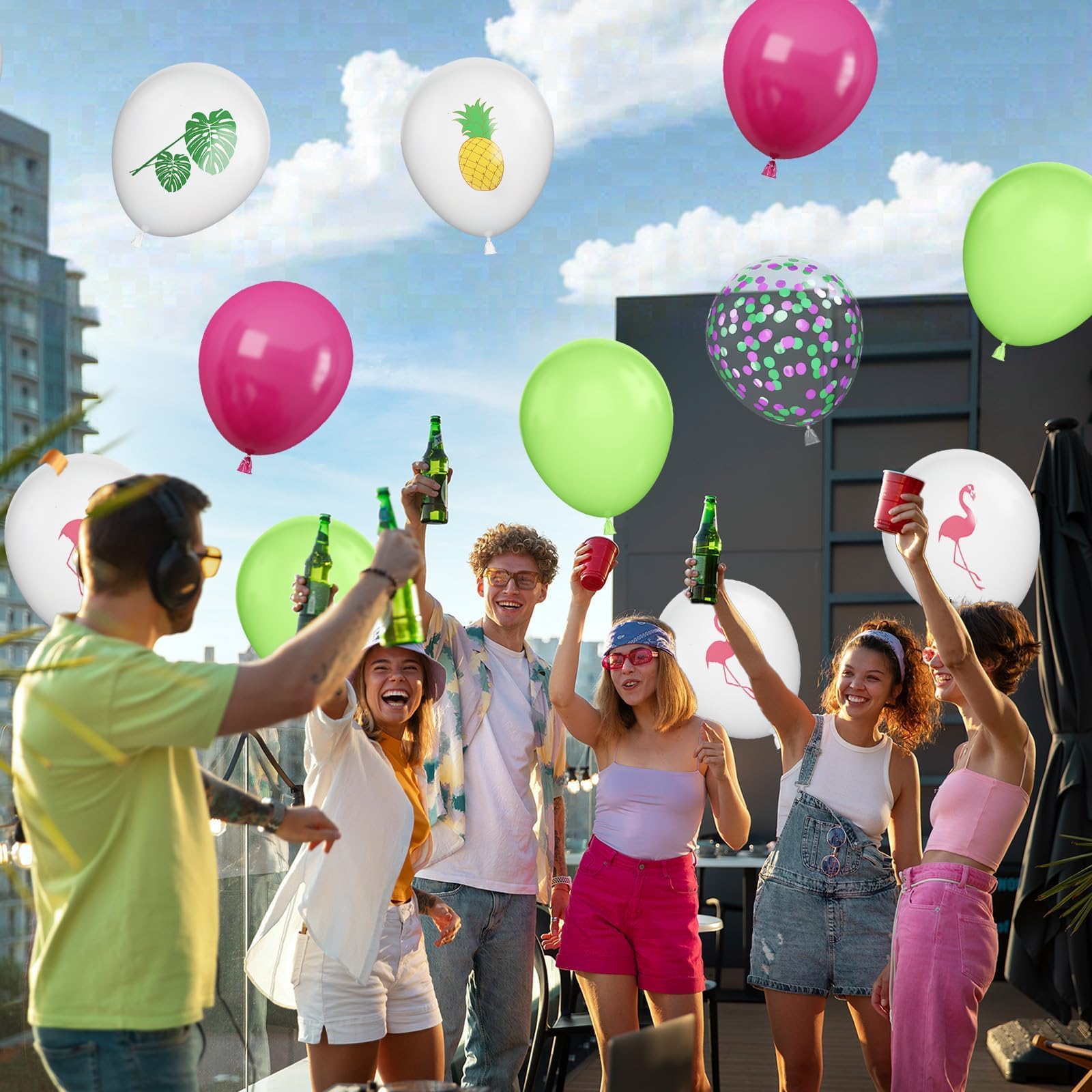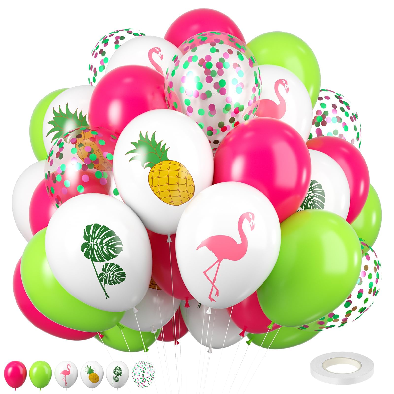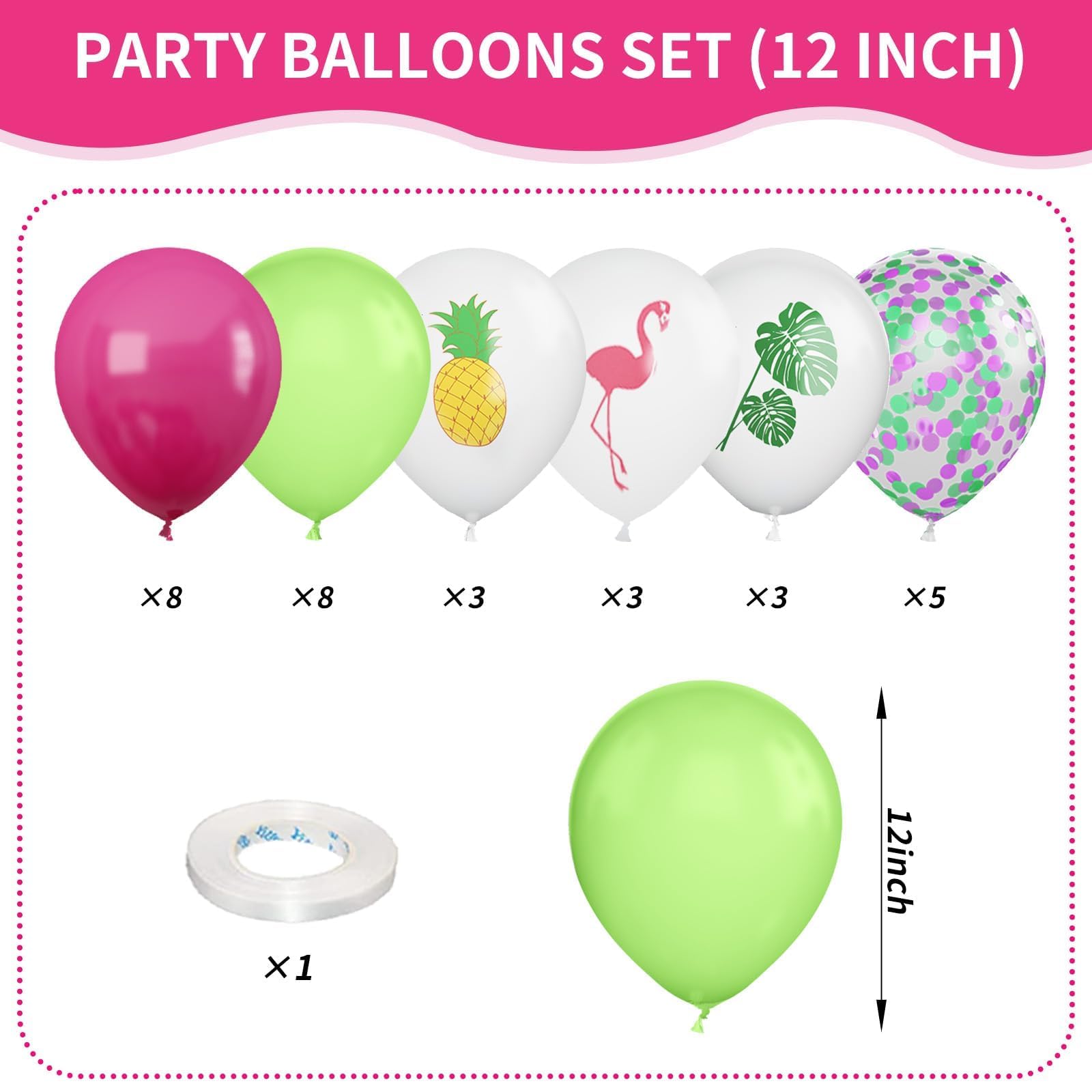 12 inch tropical balloons set: Package contents include flamingo printed balloons, pineapple balloons, leaves balloons, hotpink balloons, green balloons, green pink confetti balloons, a balloon ribbon. The color combination satisfies all your party imagination and starts a wonderful party carnival.