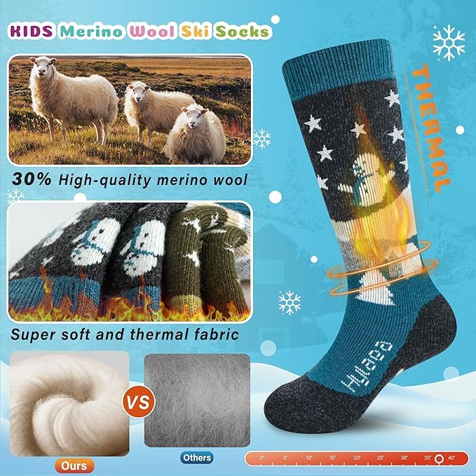 Merino wool Socks for boys and girls: These kids skiing socks are made from merino wool, a breathable, odor resistant, moisture wicking and thermal fabric, which can keep your kid’s feet warm in cold weather to enjoy more outdoor activities in winter