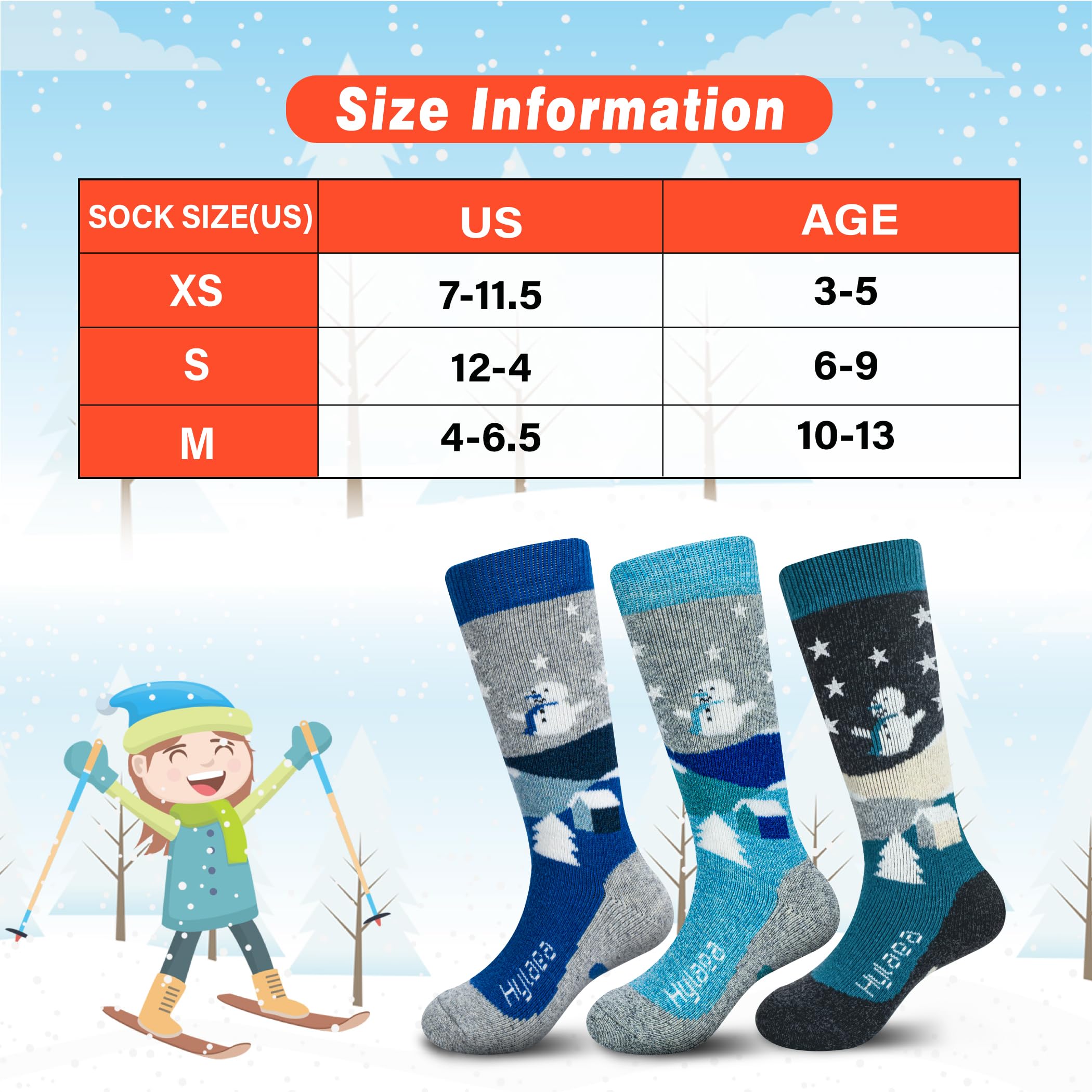 Size Chart: Please read the size chart carefully in the image. Our children's ski socks are perfect for boys, girls, toddlers, youth. X-Small fits US size 7-11.5 (3-5 years old); Small fits US size 12-4 (6-9 years old); Medium fits US size 4-6.5 (10-13 years old)