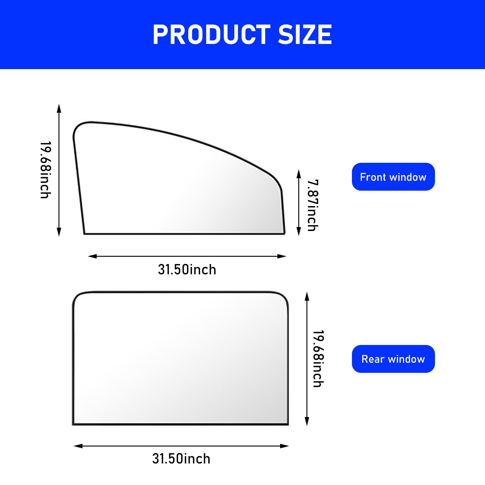 Product Specifications: The size of this car front window sunshade mesh is 31.49In x 19.68In x 7.87In, and the size of the rear window heat insulation mesh is 31.49In x 19.68In. After purchase, you will receive 2 x car front window sunshade nets and 2 x rear window heat insulation nets, which are enough for daily use.