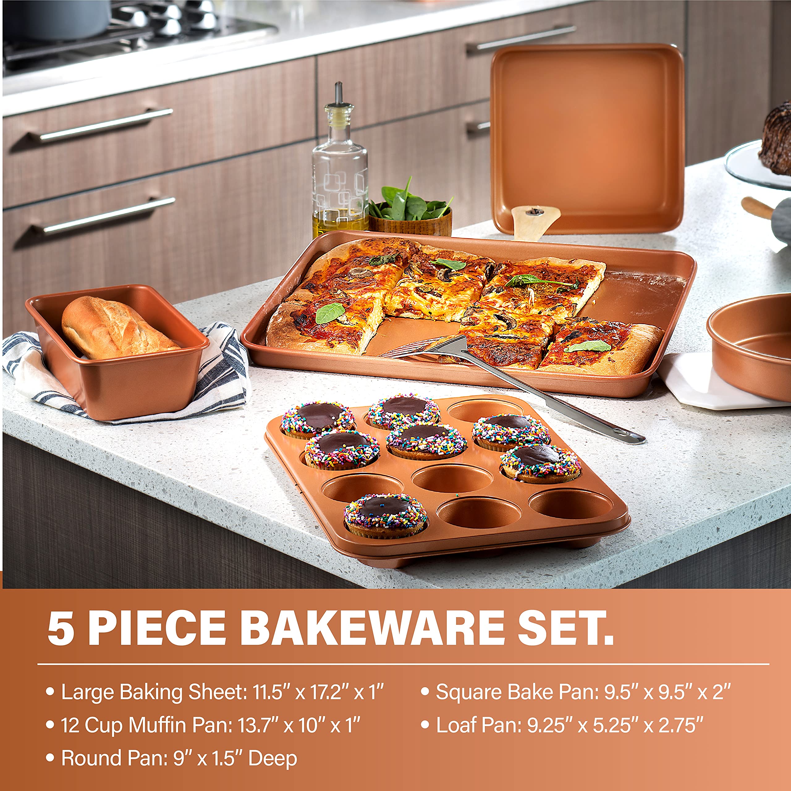 CONTENTS: this set includes 8.5" fry pan, 10.25" skillet with tempered glass lid, 1.5-quart sauce pan with tempered glass lid, 2.5 quart sauce pan with lid, 5 quart stock pot with lid, stainless steel steamer rack, 9.5" square shallow pan, 9.5” deep square casserole pan with tempered glass lid, stainless steel frying basket, steamer insert, 12” x 17” XL cookie sheet, 9.5” x 9.5” square baking pan, loaf pan, 9.5” round baking pan, 12 cup standard sized muffin pan.