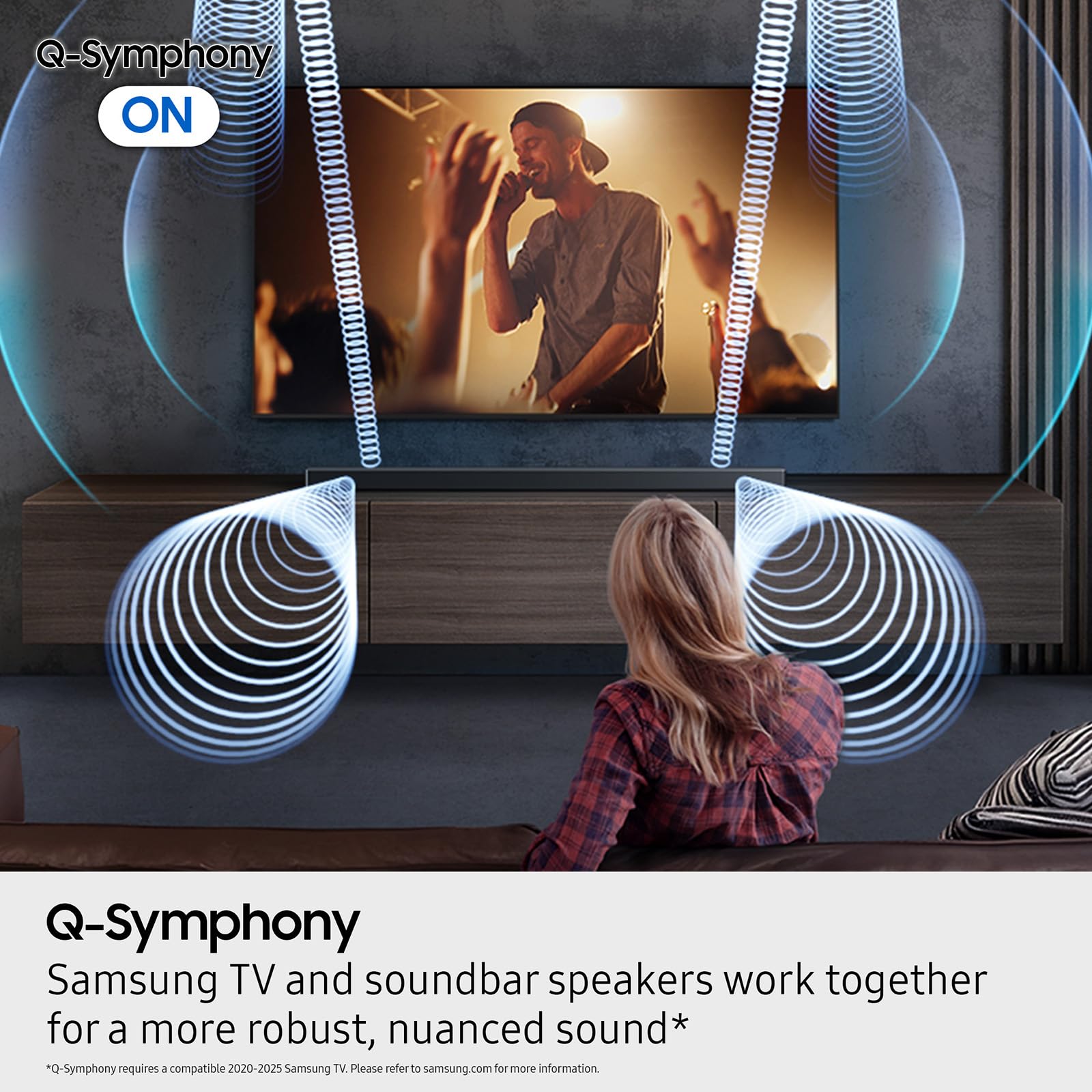 Get swept away into any film, concert or soundtrack with Dolby Atmos 3D sound that reveals rich depth and intricate details. Be surrounded by sound and feel at the center of it all with up-firing channels that project audio overhead, a dedicated center channel for clear dialogue and a wireless subwoofer that delivers room-shaking bass. Pair the soundbar with a Samsung TV to experience powerful, robust audio wit h Q-Symphony** and level up your entertainment a notch - or two or three. *For best 3D sound, Dolby Atmos requires Dolby Atmos source content. **Q-Symphony requires a compatible 2020-2025 Samsung TV. Please refer to samsung.com for more information. ***AI enhanced audio requires a compatible 2023-2025 Samsung AI TV. ****Requires a 2025 Samsung QLED TV (Q8FA models and above), The Frame, The Frame Pro, a 2024 The Serif or a 2021-2024 Samsung QLED TV (Q7 and above) *****Compatible with Gaming Hub and select gaming consoles (e.g., Xbox X, PS5). Gaming Hub requires a compatible TV, high-speed internet and gaming subscriptions.