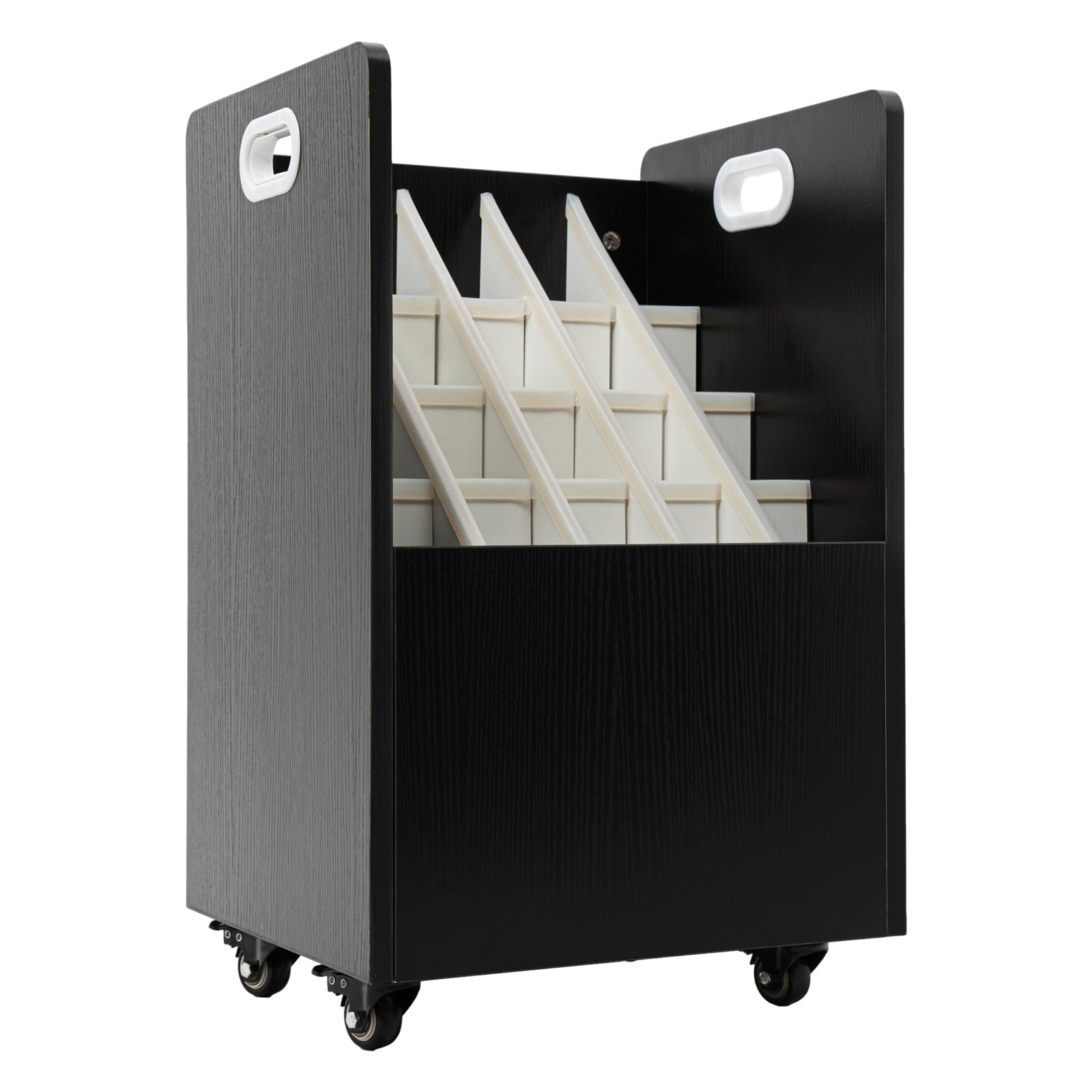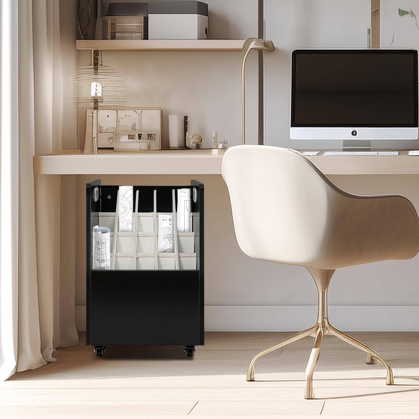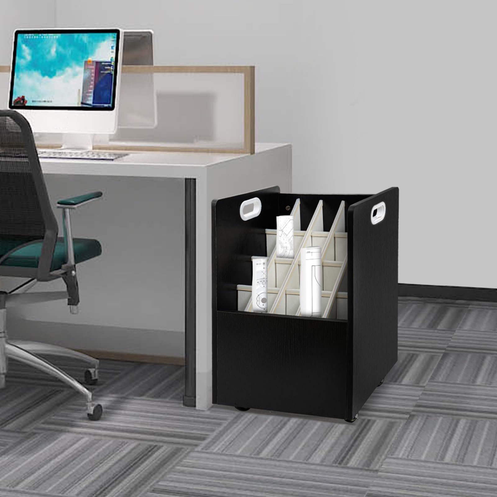 Application It is suitable for offices, living rooms, study rooms, meeting rooms, classrooms, cafes, libraries, and garages, among others. It can also be used to organize letters, documents, books, mail, files, information, cardstock, craft paper, construction paper, and printer paper. Specifications Color: Black Style: Modern Shape: Rectangular Material: MDF, PV Mounting Type: Floor Mount Process: Heat, Steam and Adhesives Number of Compartments: 20 Assembly Required: Yes Load Capacity: 20kg/44.1lbs Gross Weight: 11.5kg/25.35lbs Net Weight: 11kg/24.25lbs Product Size : 38.7×33.7×63cm/15.25×13.25×24.75in Package Size: 66×9×46cm/25.98×3.54×18.11in Package Included 1× Mobile Roll File Storage Rack 1× English Manual Other Accessories for Assembly