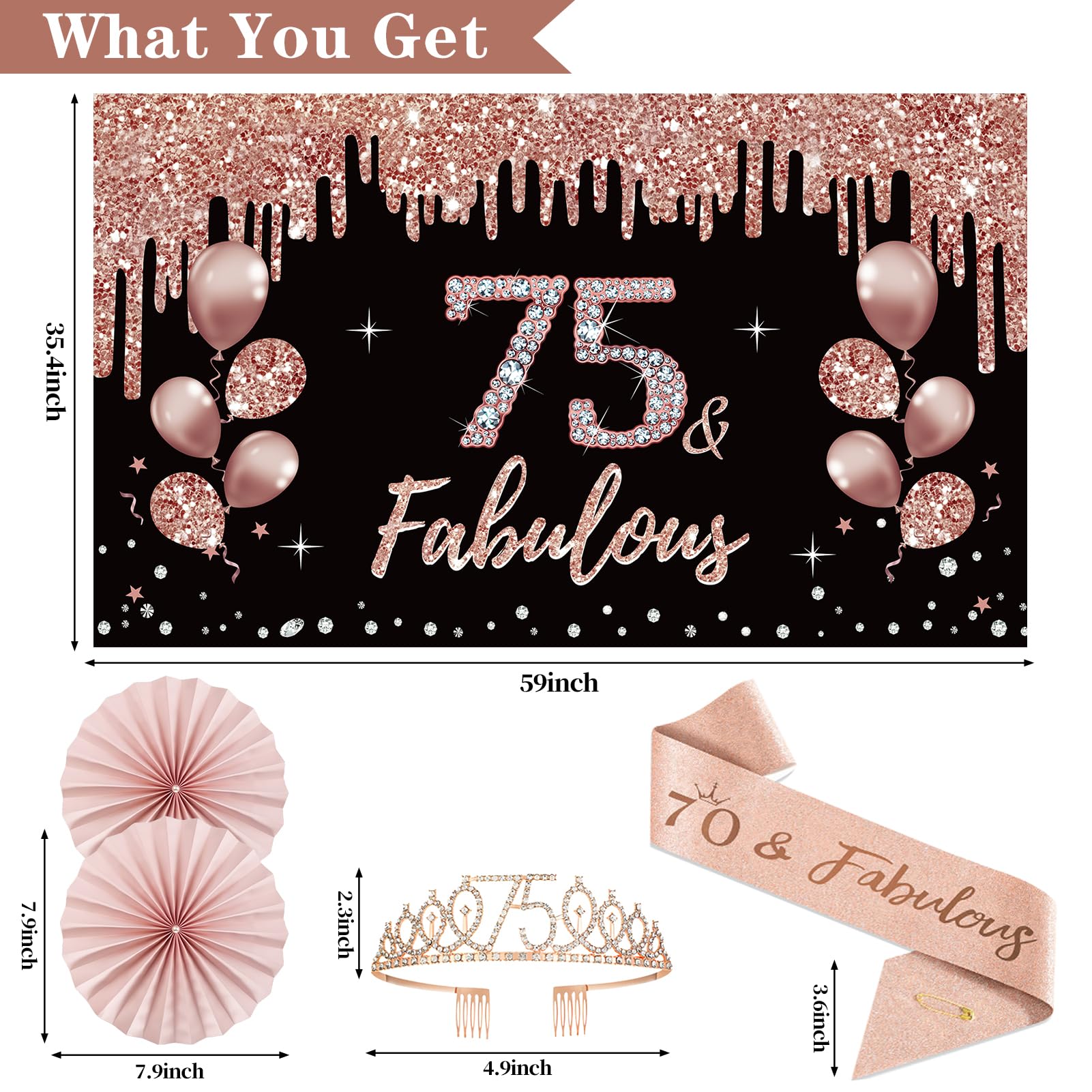 75th birthday decorations for women: Celebrate in style with Uiorgui 75th birthday decor, featuring a complete 33 pieces set including a crown, sash, banner, backdrop, 21 latex balloons, 6 hanging swirls, and 2 paper fans for a 75 birthday party