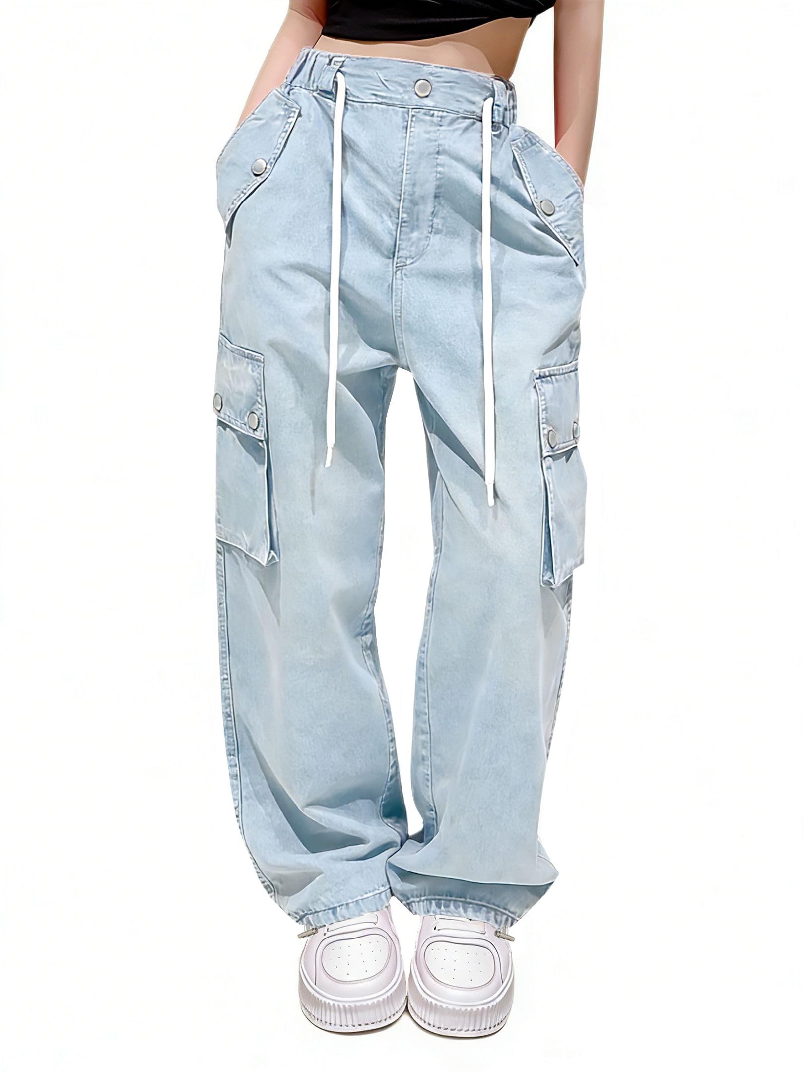 Design:Y2K cargo pants featuring a baggy oversized silhouette with color-matched elastic drawstring waist, adjustable ankle drawstring cuffs, ankle-length cut, and 4 functional cargo pockets for essentials storage.