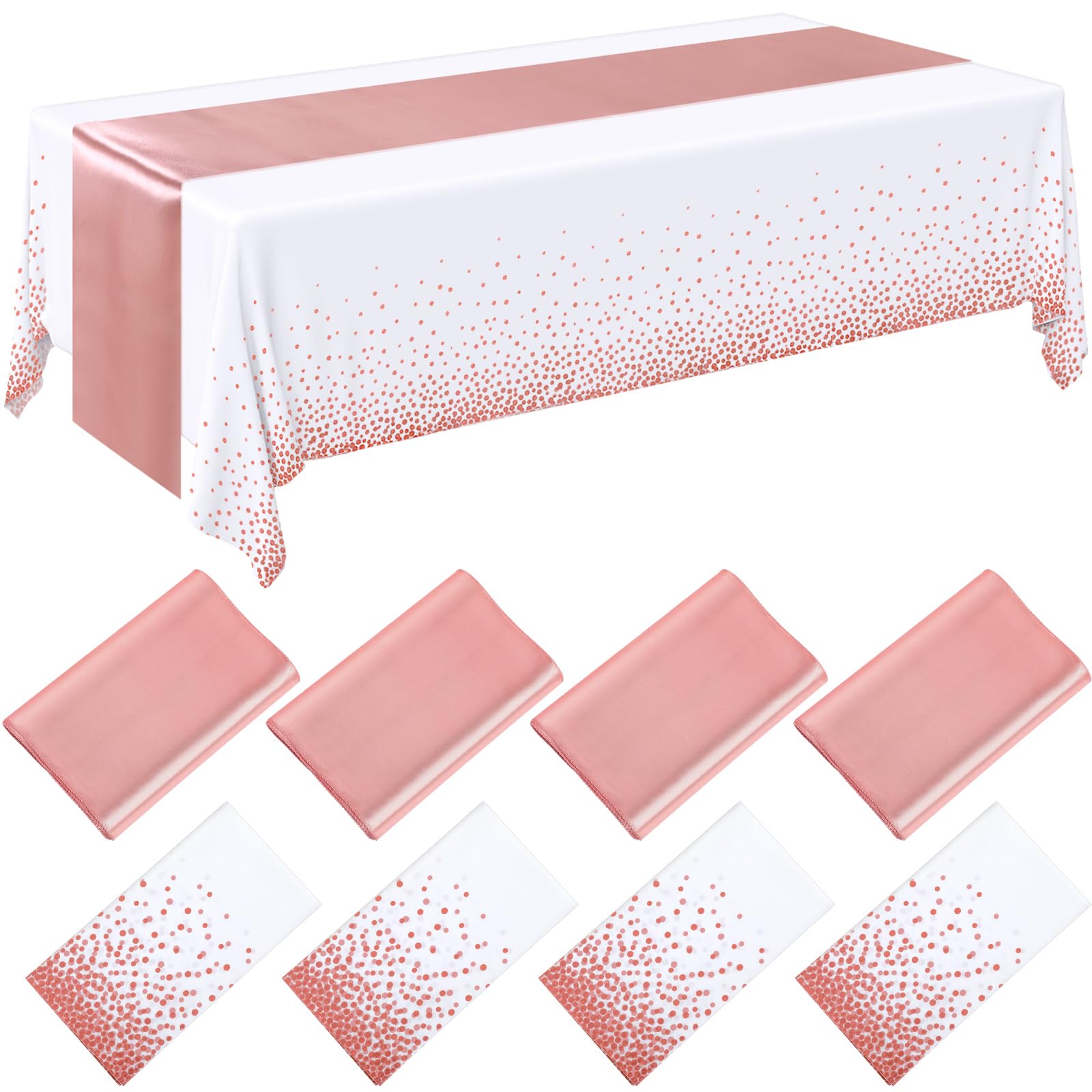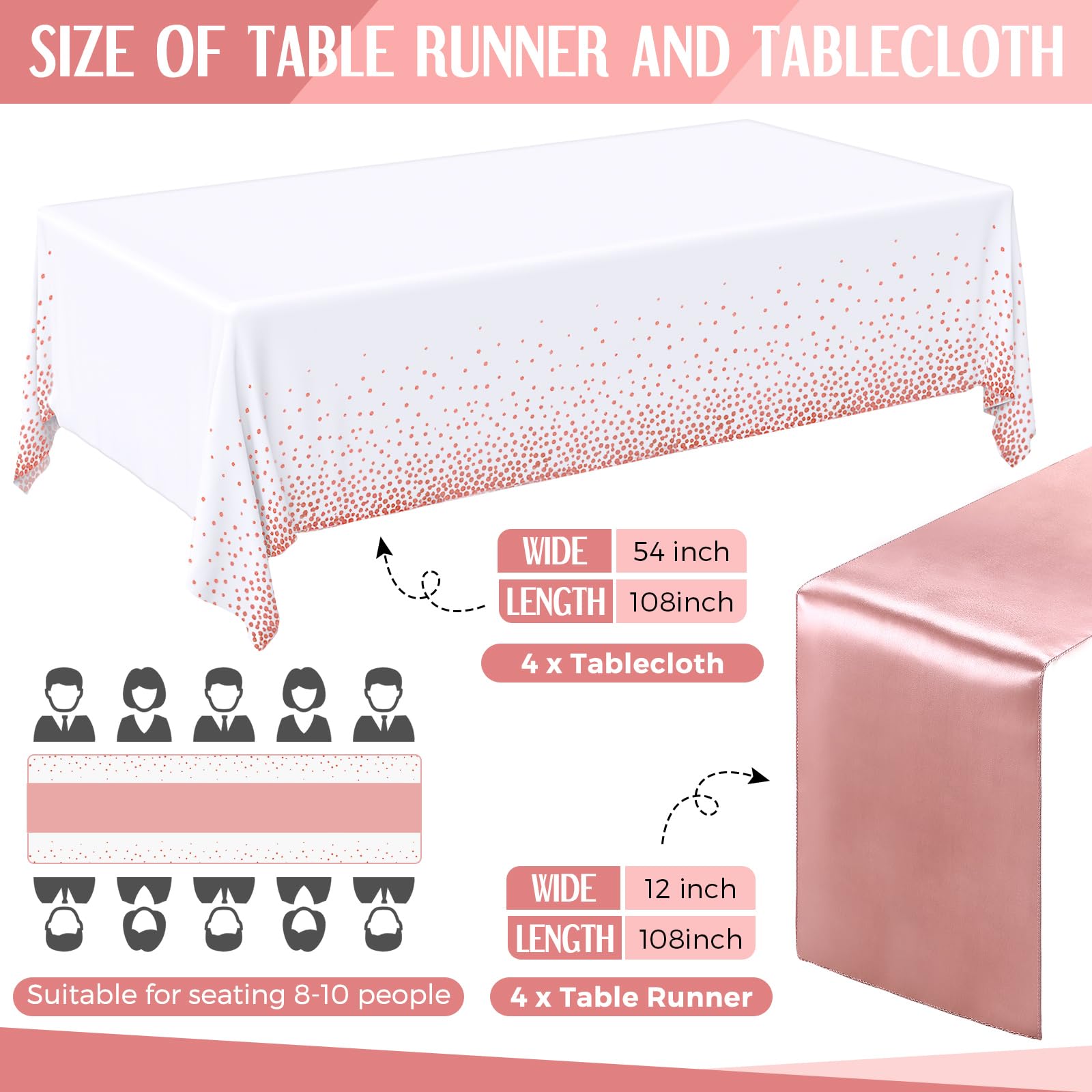 Sufficient Quantities: what you will receive are 8 packs of table covers, containing 4 pieces of plastic tablecloths and 4 pieces of satin table runners; Besides, the sets of table decorations can reduce your selection time and meet your replacement needs