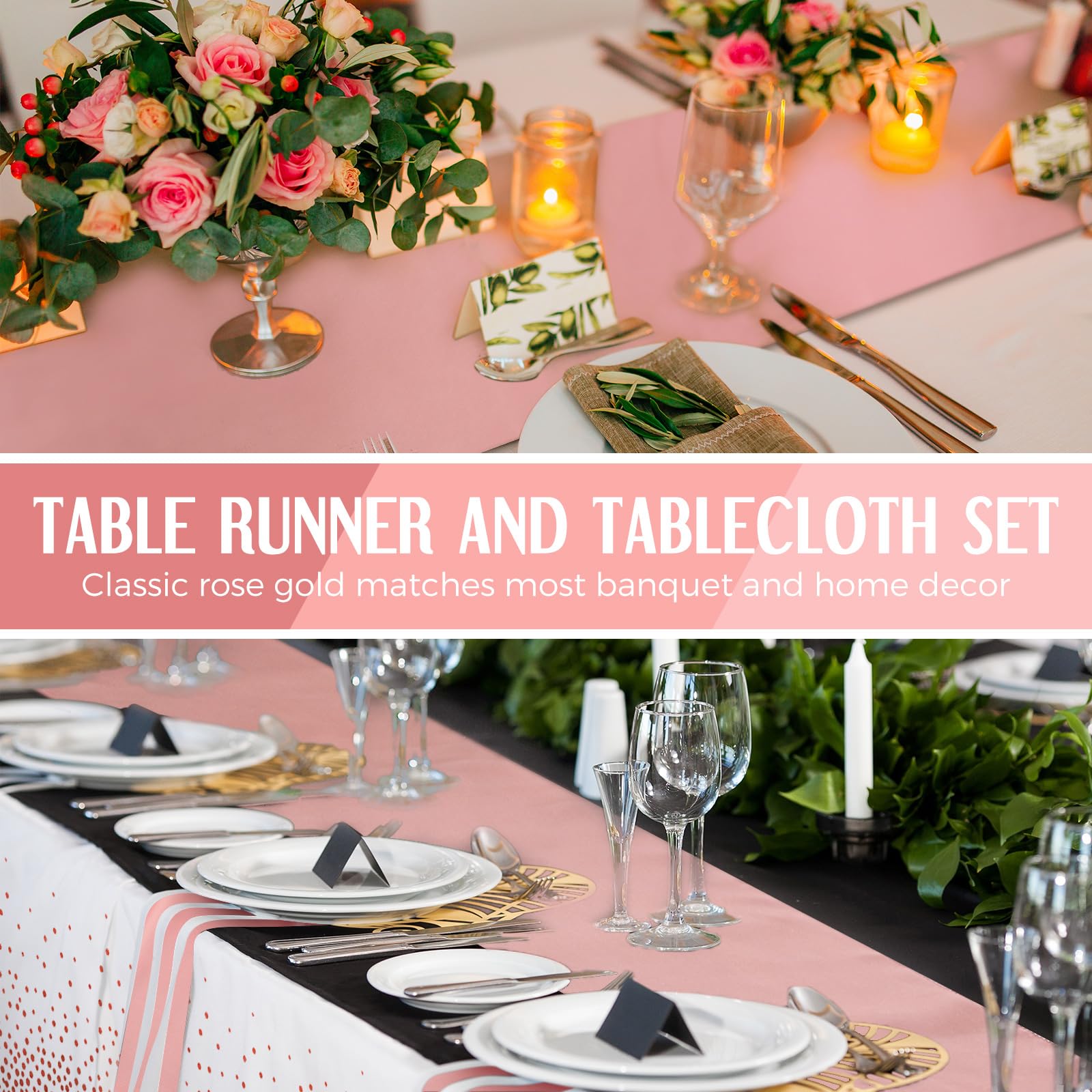 Appropriate Sizes: the disposable table cloth measures approx. 54 x 108 inches and the satin table runners are approx. 12 x 108 inches; Large enough to cover rectangle desks and round tables, or cut into whatever shape you want for decorating
