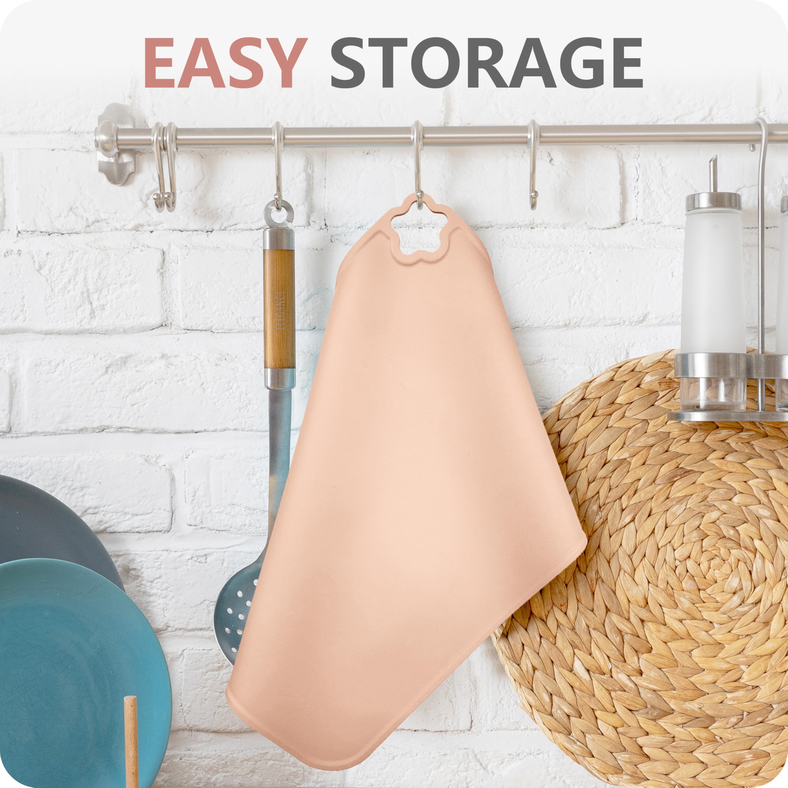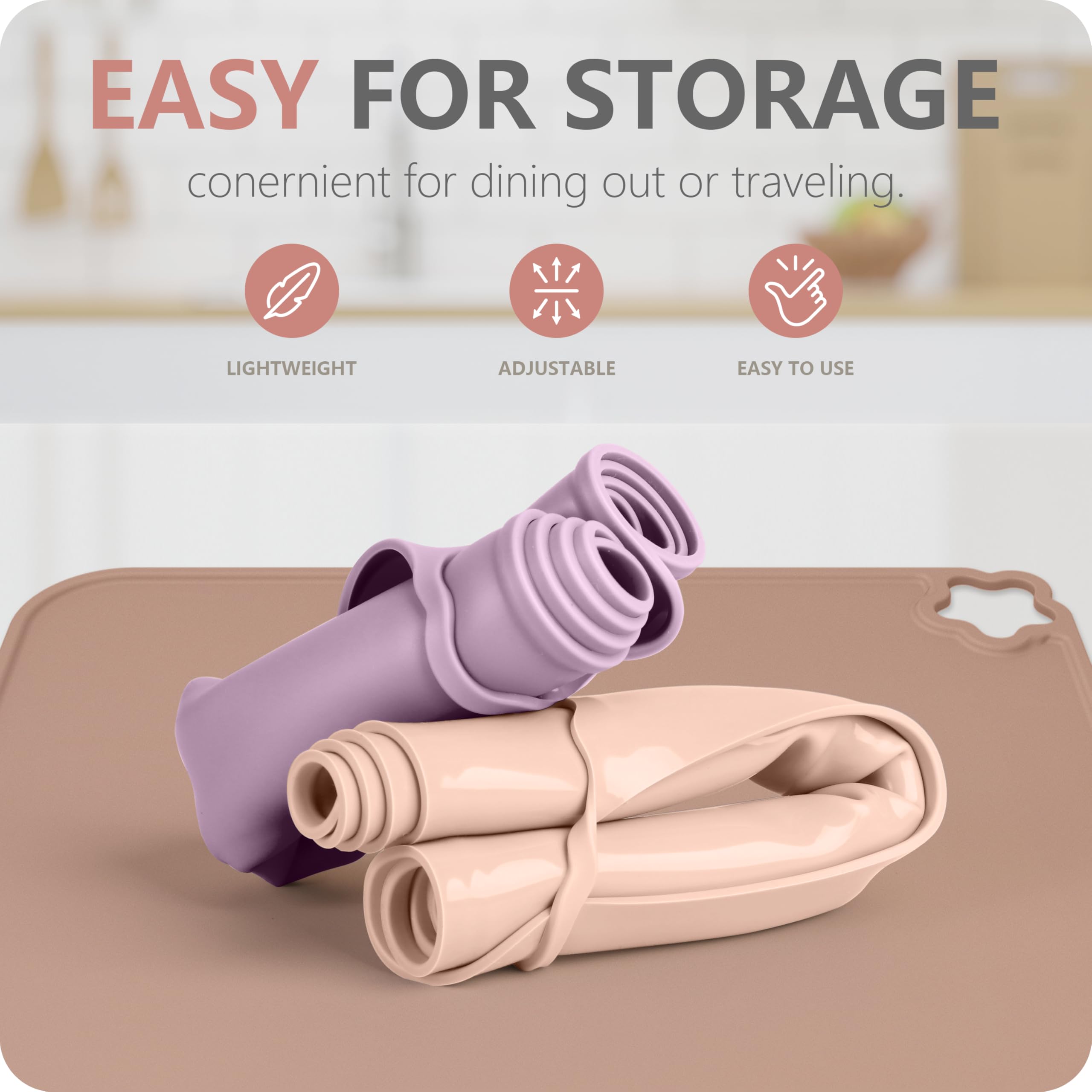 Foldable & Portable: The unique design of the flower hollow in the upper right corner of the placemat makes it more portable, you don't need to use any strap. And these soft and flexible silicone mats are thin enough to roll up easily and fit in any bags, great for using at restaurants or travel