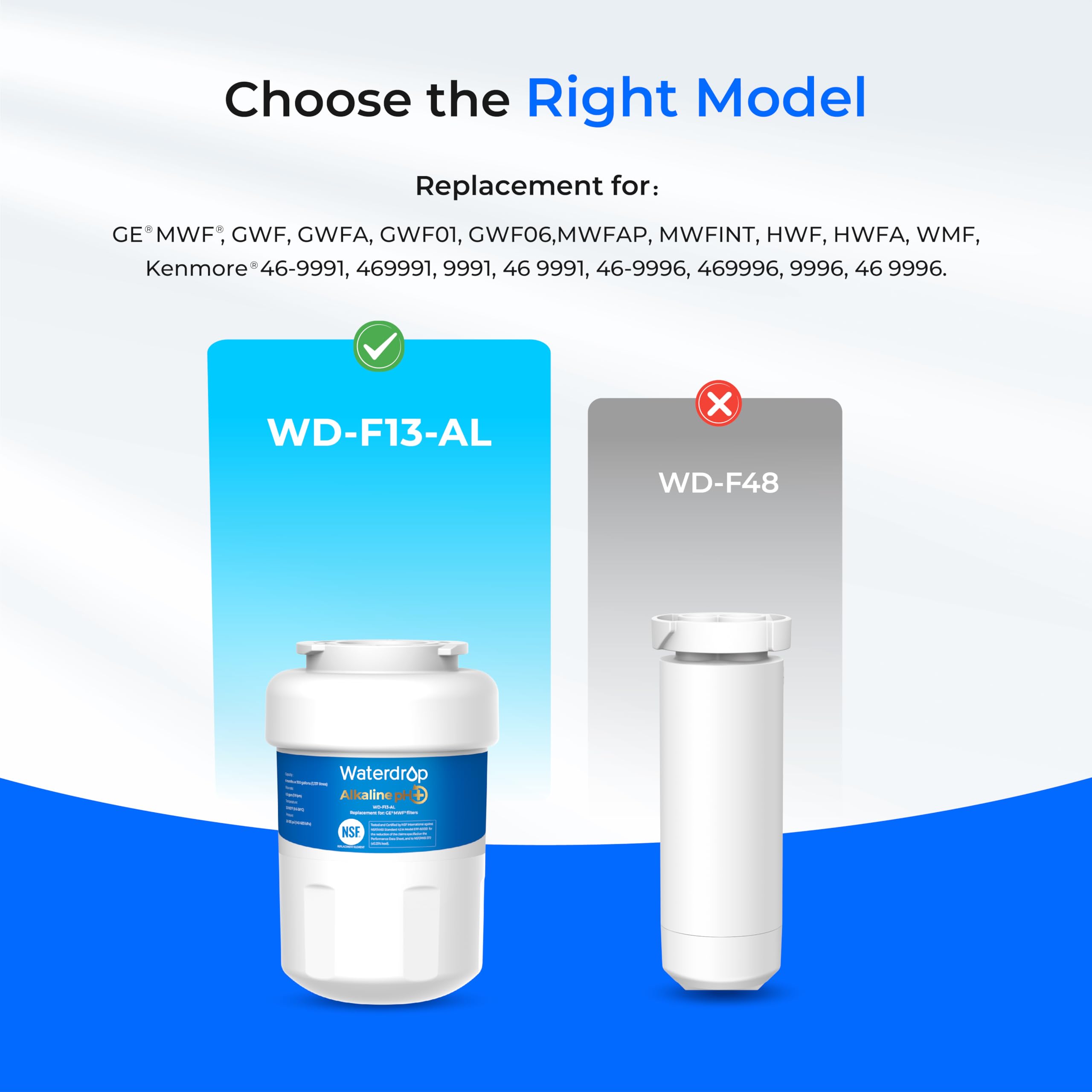 Replacement for filter models: GE GWF, GWFA, GWF01, GWF06, MWFAP, MWFINT, HWF, HWFA, WMF, Kenmore 46-9991, 469991, 9991, 46 9991, 46-9996, 469996, 9996, 46 9996, PL-100, GF-MWF, WD-F13, EBL7771, CF8, WFC1201, AQF-FF13, RWF0600A, RWF0600AH, PP-RWF0600A, FL-RF13, WS613B, MB-F13, PF8, RWF1060, CWMF031, WSG-1,CLCH102, GE MWF, CW-G1.