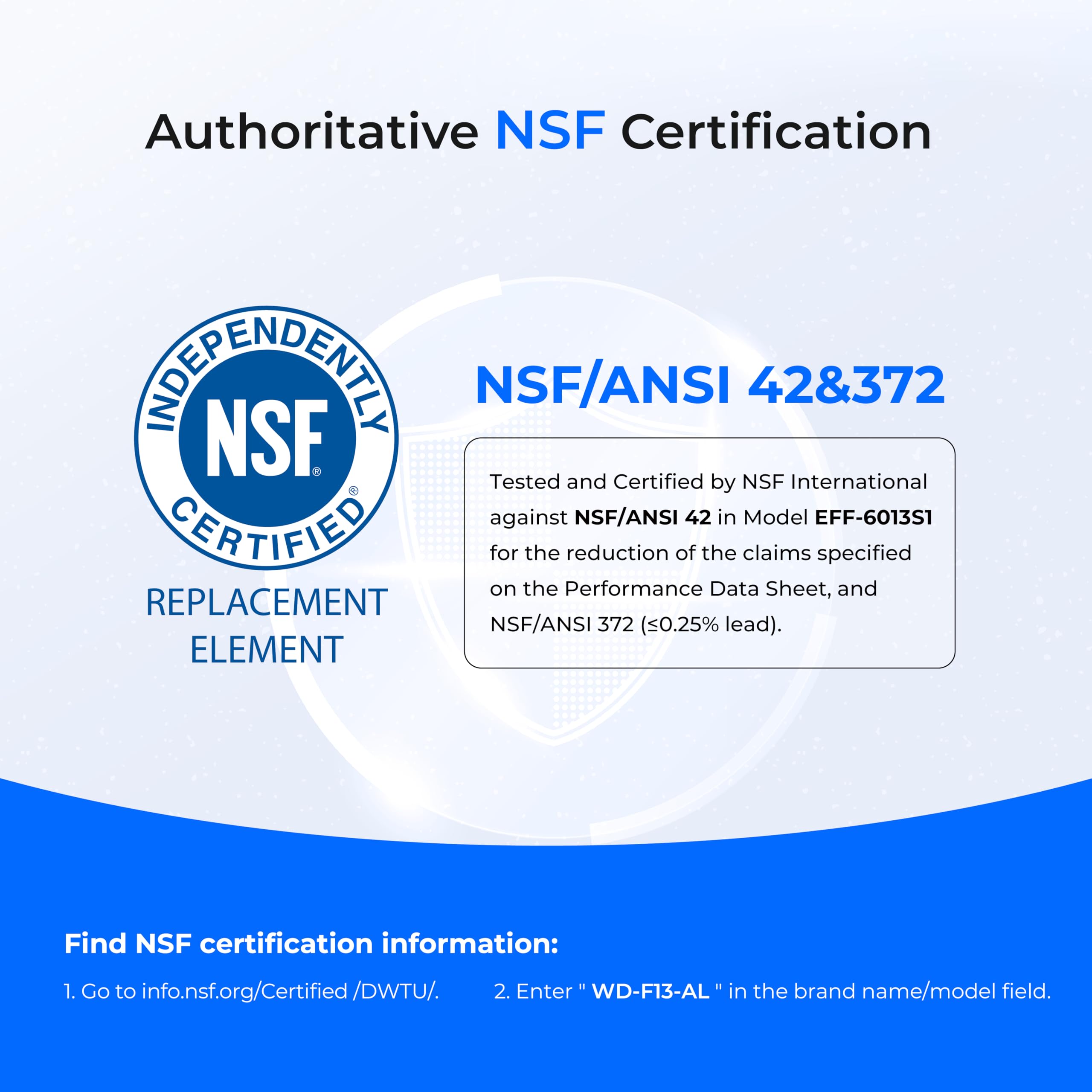 This Waterdrop refrigerator water filter replacement for GE GWF, important certifications from the well-known regulatory body in the industry, NSF 42 and NSF 372 certificates.