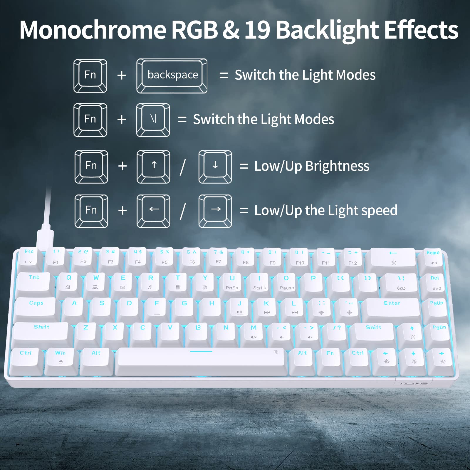 Classic Blue LED Backlight:The T68se mechanical keyboard offers a variety of static and dynamic lighting effects with bright and vivid colors. You can switch between 19 built-in lighting modes and adjust the brightness and speed of the lighting using dedicated keys.