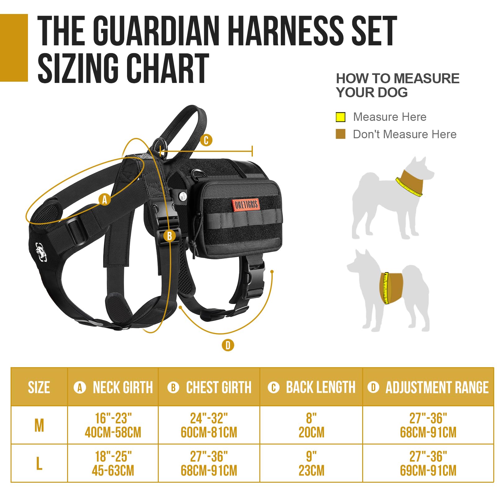 Size Chart: Size M - Neck Girth 16”-23”; Chest Girth 24”-32”; Weight: 30 - 60lb; Back Length 8” Size L - Neck Girth 18”-25”; Chest Girth 27”-36”; Weight:60 - 90lb; Back Length 9”