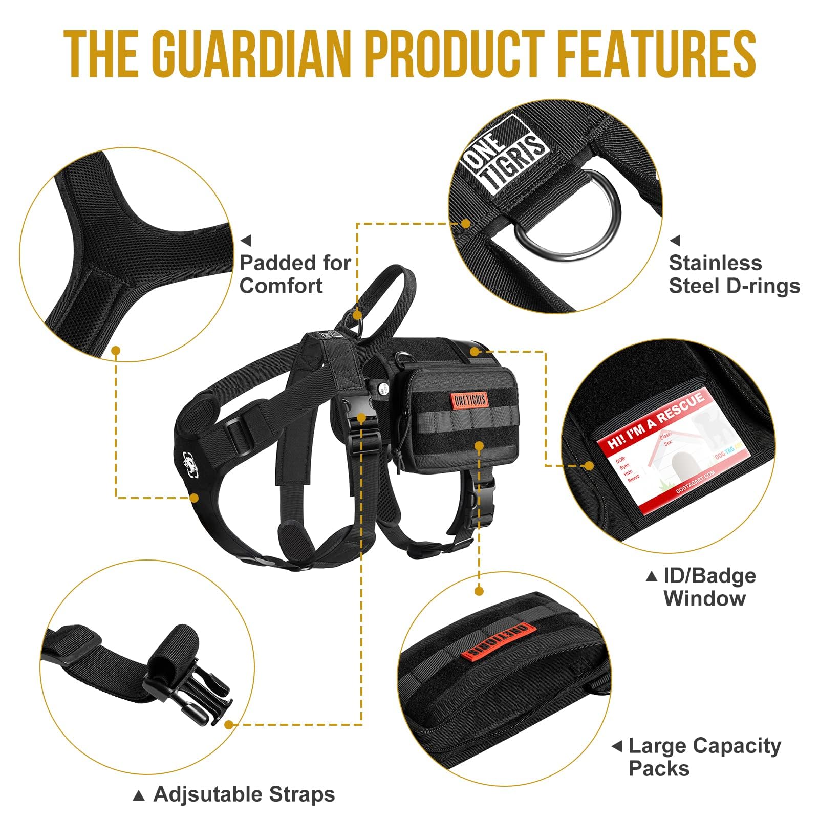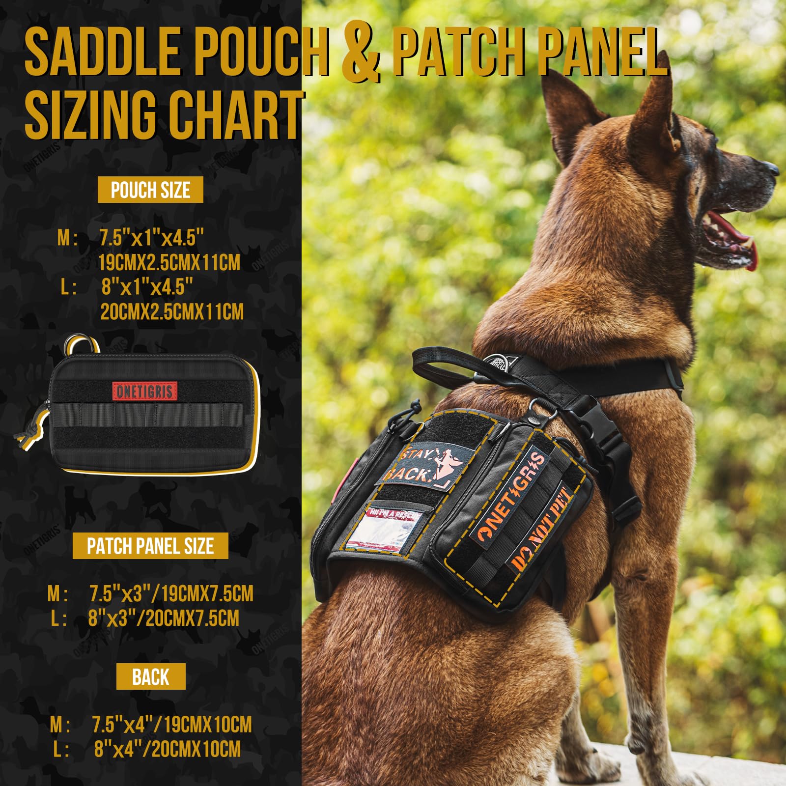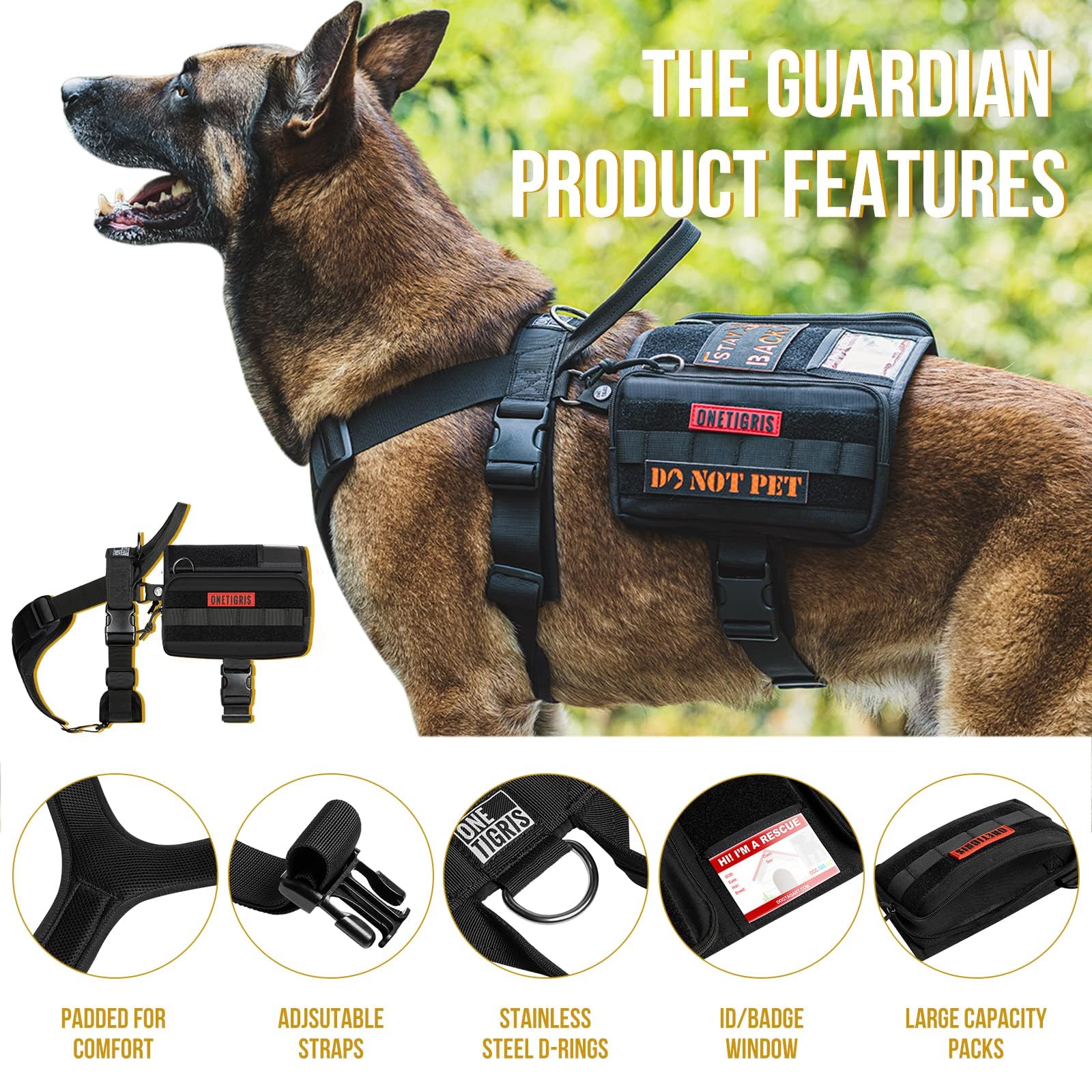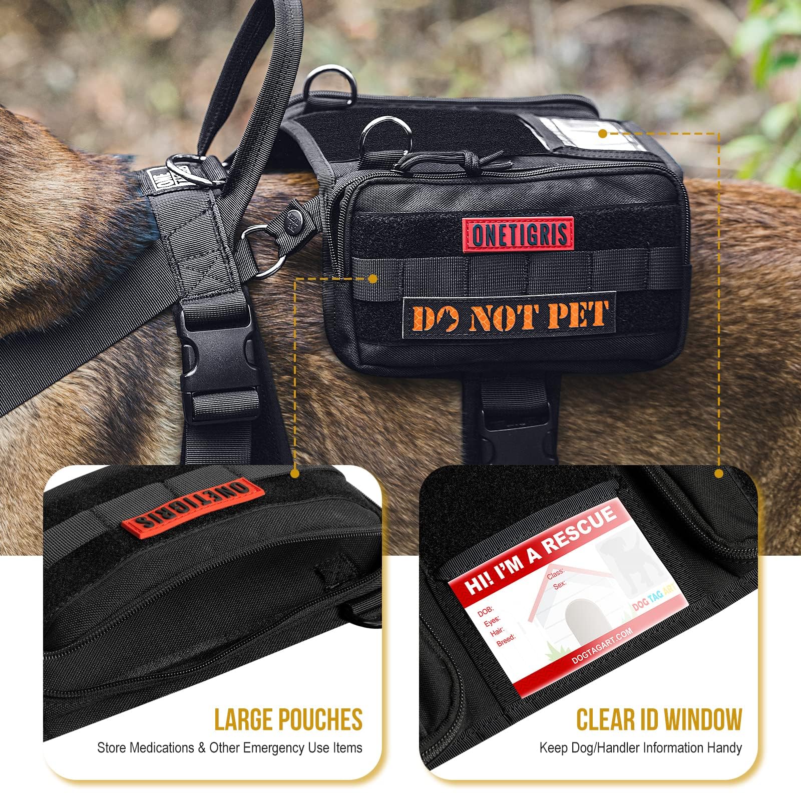 Comes with an ergonomic strapped harness, saddled canine EDC pouches, with leash clips, MOLLE compatibility, patch panels, clear ID window, and service dog handle attachment D-rings.