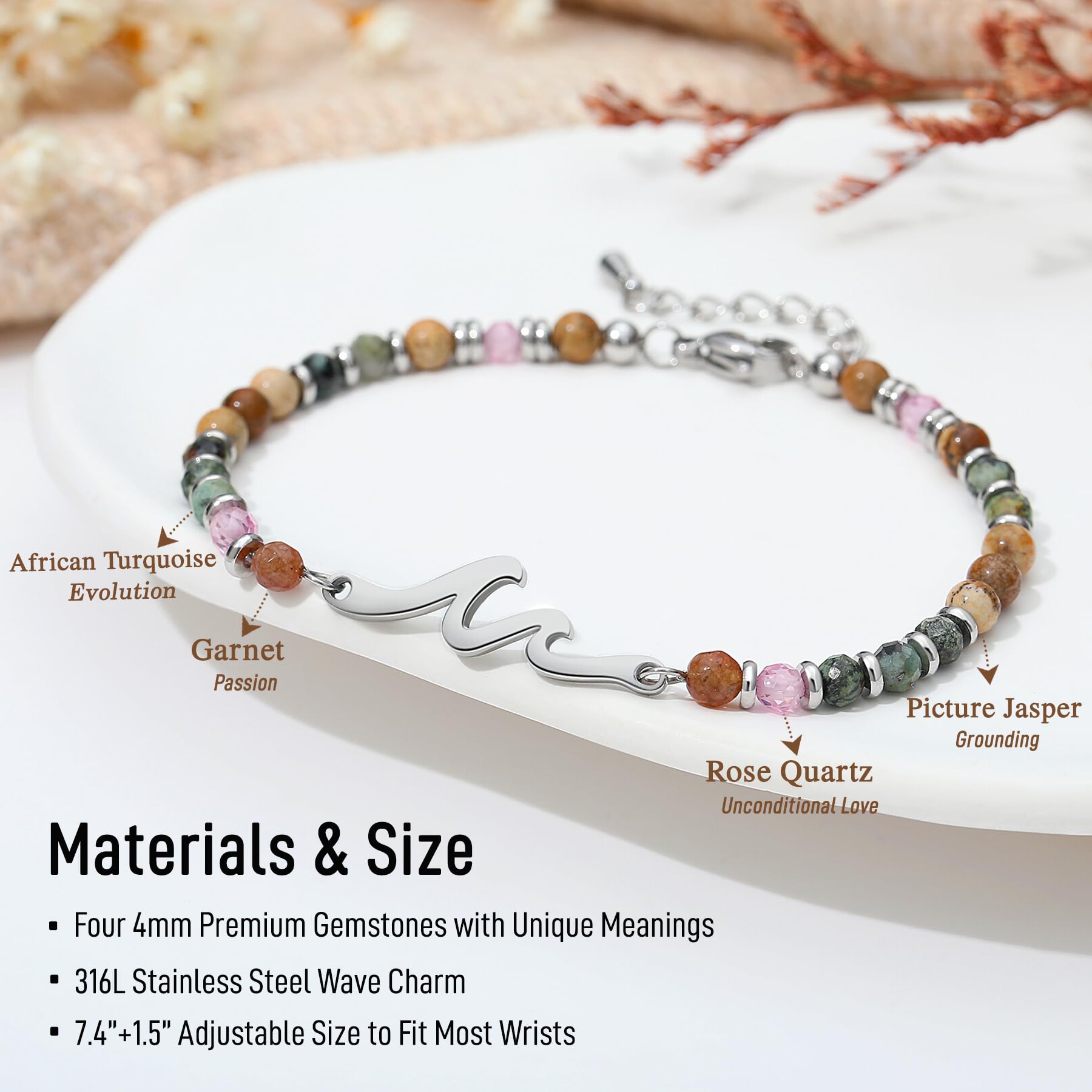 【 Premium Quality & Adjustable Fit 】Expertly crafted for comfort, this 7.4" beaded wave bracelet features a 1.5" extension chain for adjustable fit (fits wrists 6.5"-8"). Handmade with 4mm earthy-toned natural stone beads and hypoallergenic 316L stainless steel, it's lightweight, tarnish-resistant, and designed for everyday wear - just like your love, always there when needed.