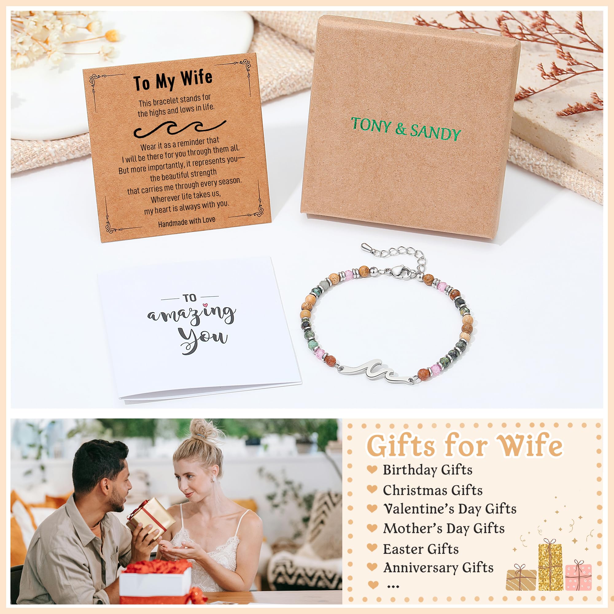 【 Birthday Gifts for Wife 】This elegant wave bracelet embodies your journey as a couple. Its curves represent the challenges you've overcome together, while the earthy-toned beads symbolize your unbreakable bond. Designed to bring a heartfelt smile, it conveys how deeply you cherish her. The perfect birthday gift for your wife or lifelong partner—expressing a love that grows stronger each year.