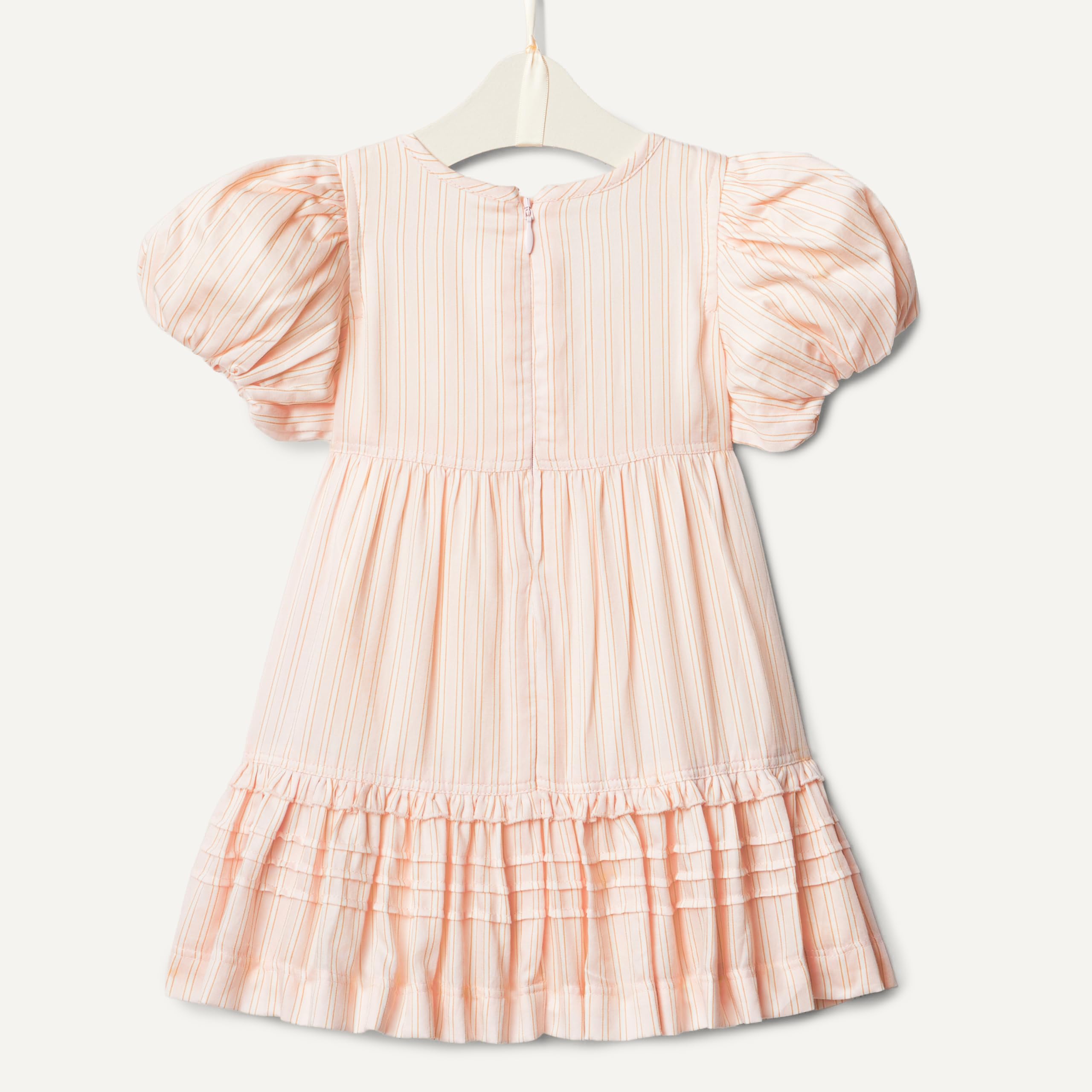 DETAILS: Tiered flounce dress with puff sleeves, delicate ruffle and pintuck detailing, back invisible zipper, fully lined