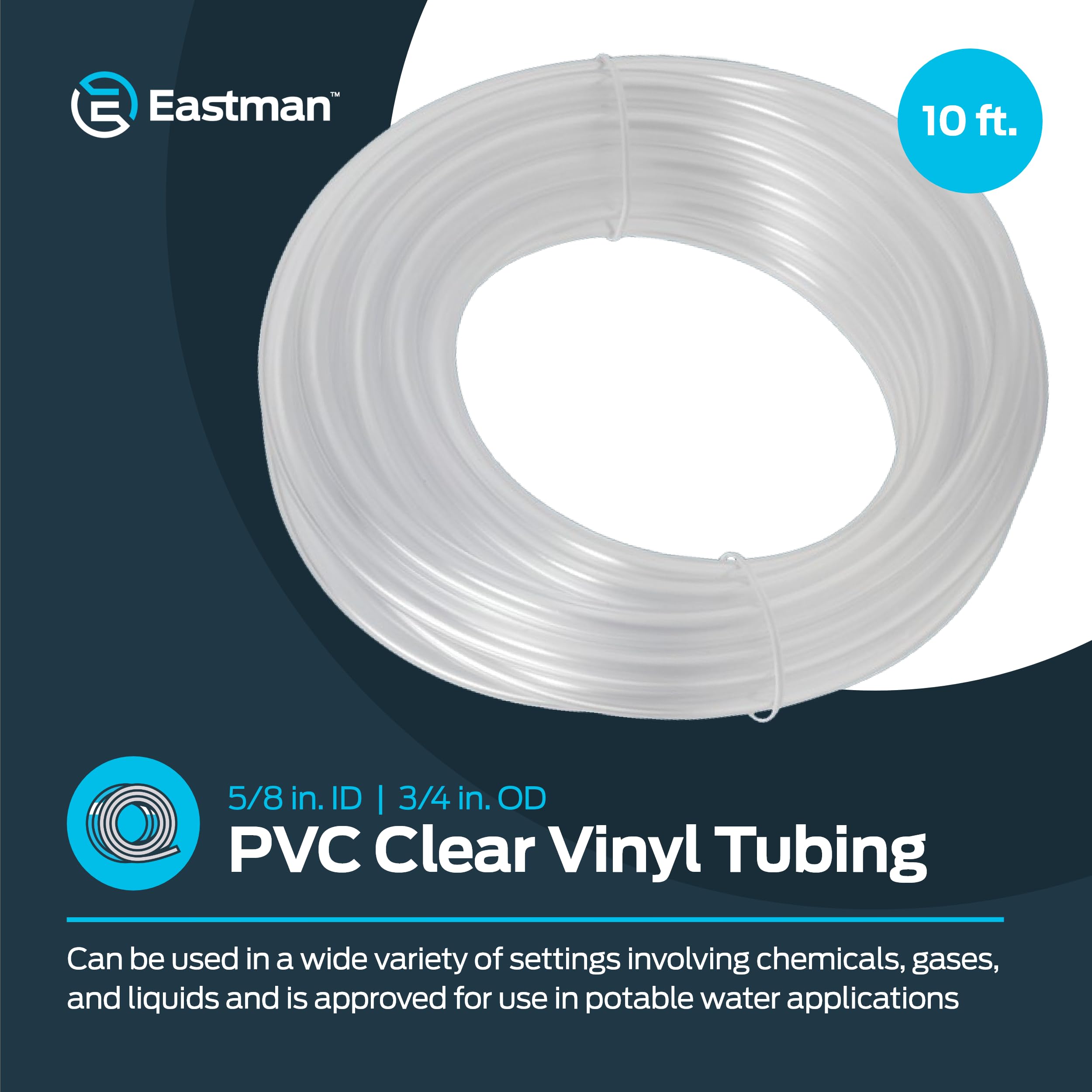 Simplify your plumbing and home improvement projects with the Eastman PVC clear vinyl tubing. Composed of clear, durable PVC, this tubing can be cut to size as needed and is suitable for drainage lines, potable water, beverage dispensing, laboratory use, and aquarium setups. Clear vinyl tubing is a flexible, versatile option that handles chemicals, gases, and liquids in low-pressure applications. Tubing wall thickness is 1/16 inches with a pressure rating of 19 to 55 PSI and a maximum temperature of 170 degrees F. Made with FDA-compliant materials. Not recommended for ice makers.