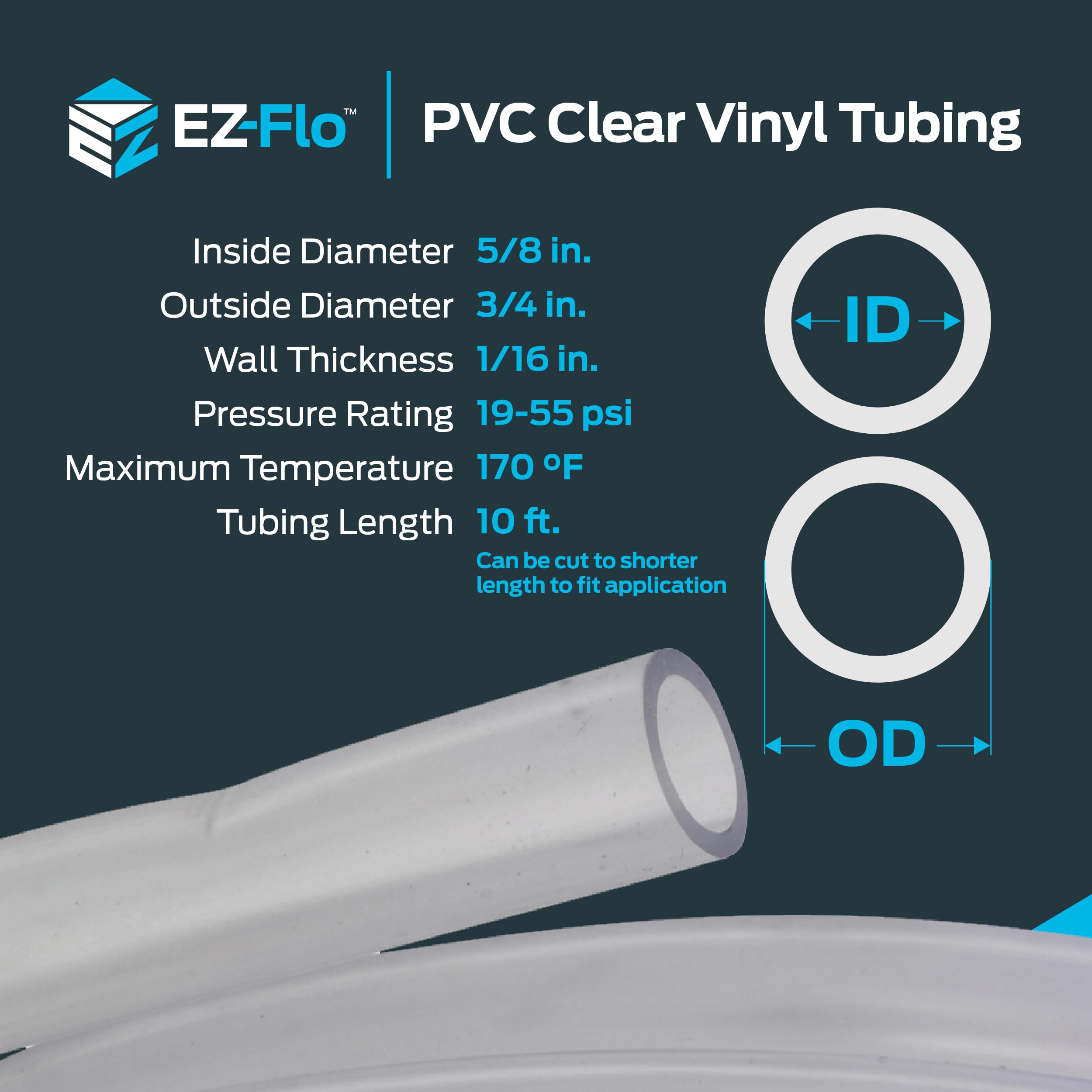 SPECS: This 10 ft. versatile tubing features 5/8 in. ID x 3/4 in. OD with 1/16 in. wall thickness, a pressure rating of 19 to 55 PSI, and a maximum temperature of 170 degrees F; made from FDA-compliant PVC