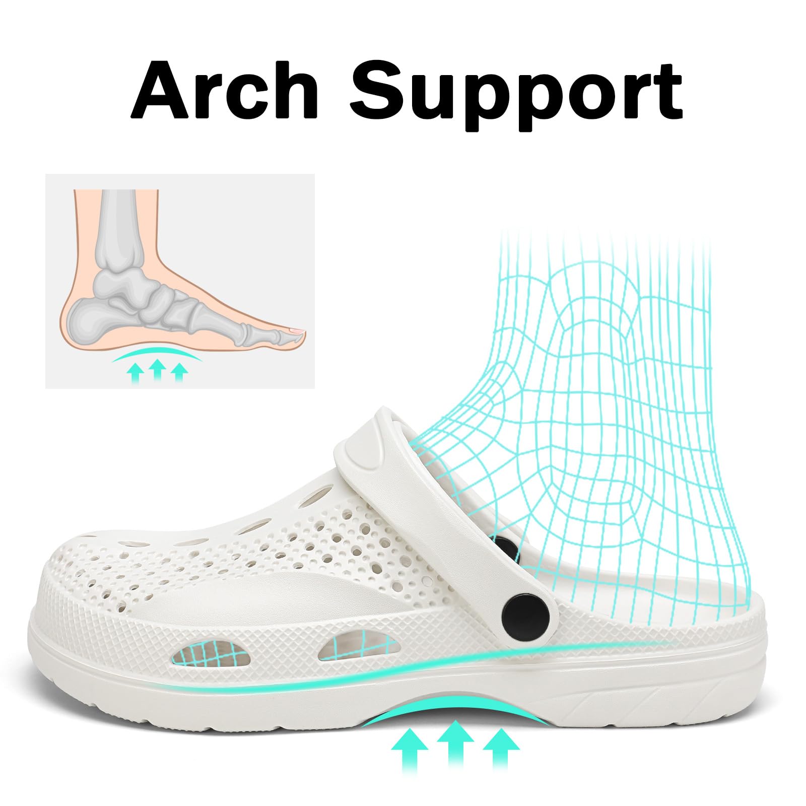 【Great Arch Support 】Womens clogs arch support, these clogs help relieve foot tired provides added stability, helping to absorb shock and reduce stress on your feet. Whether you're gardening, walking at the beach or outdoor activities, these clogs provide the comfort you need