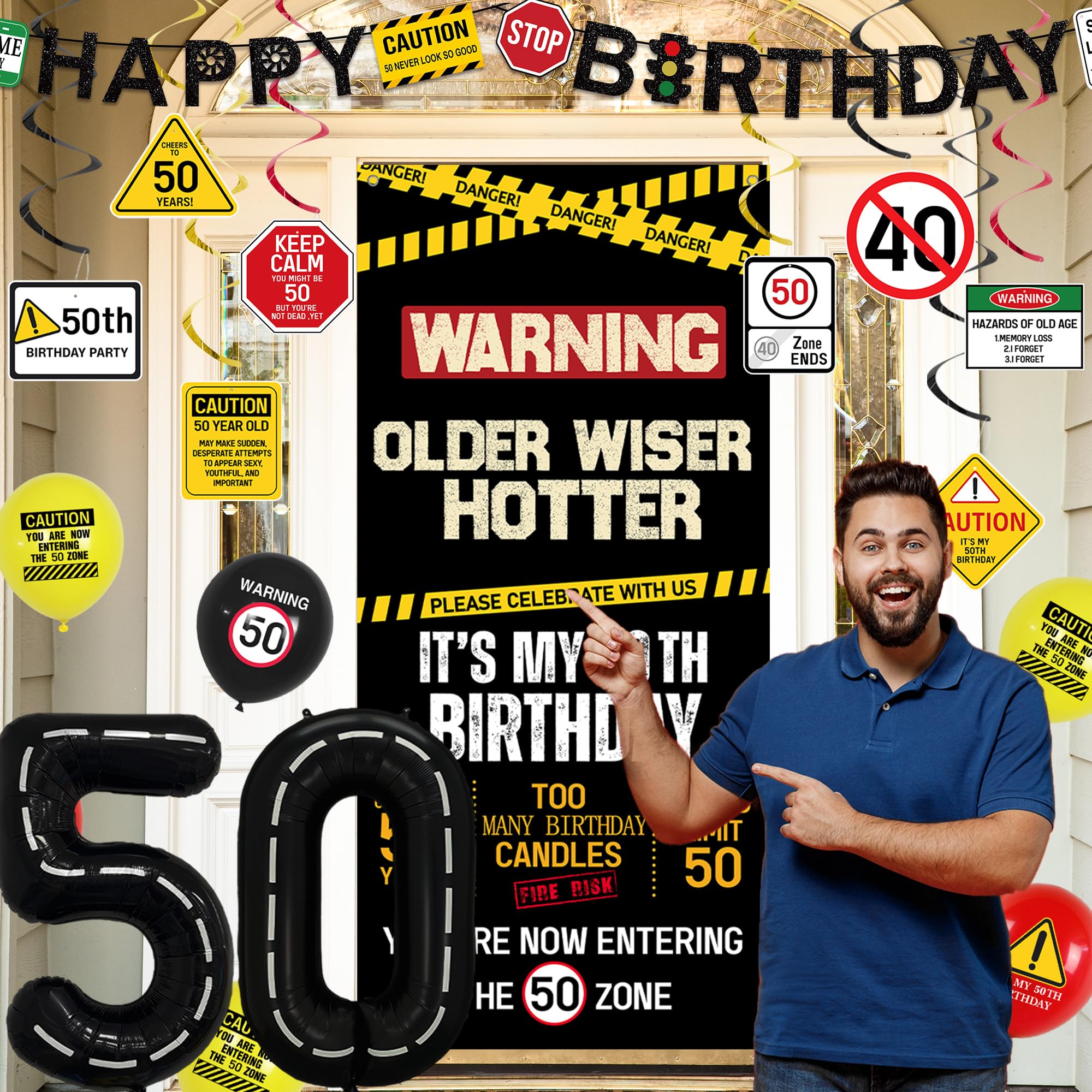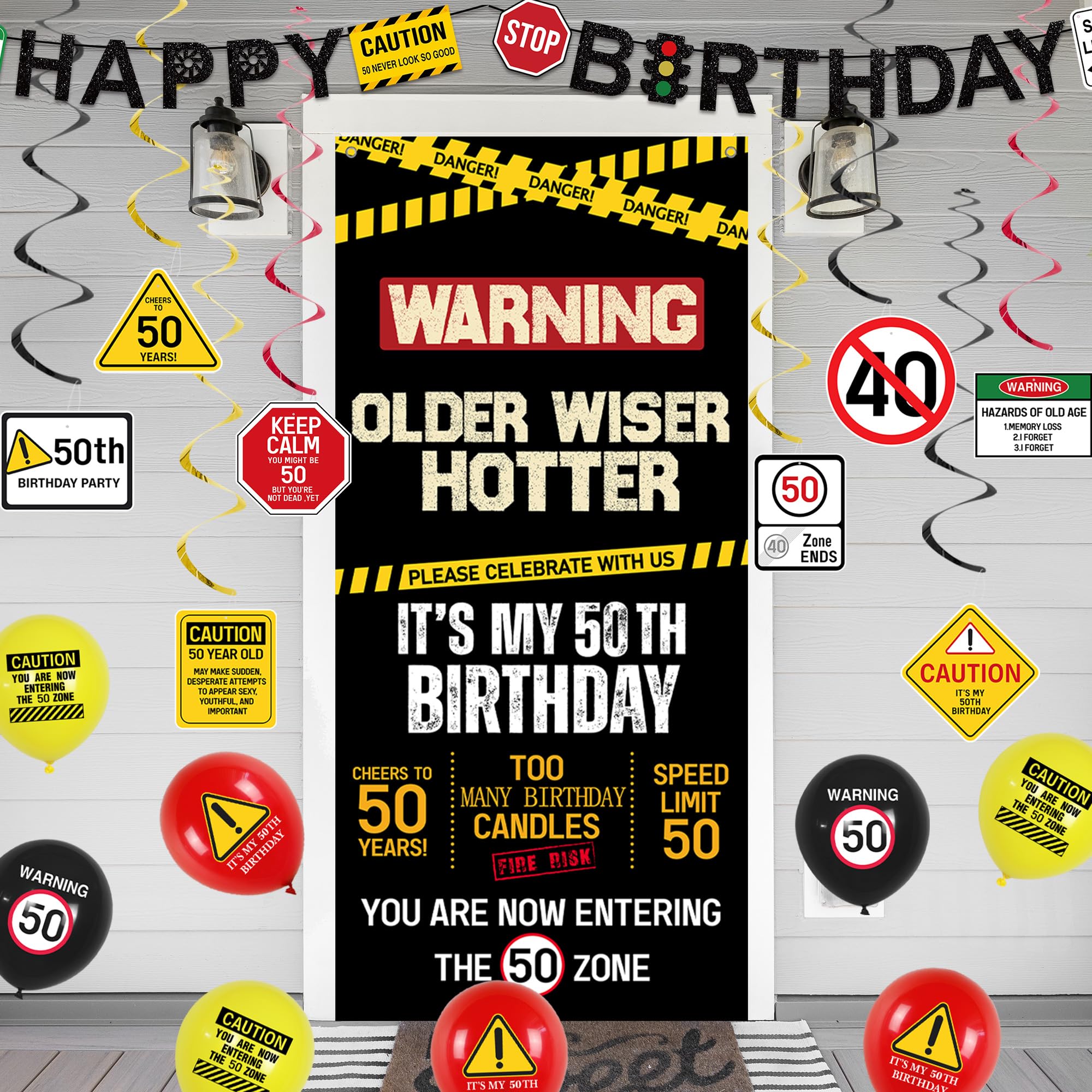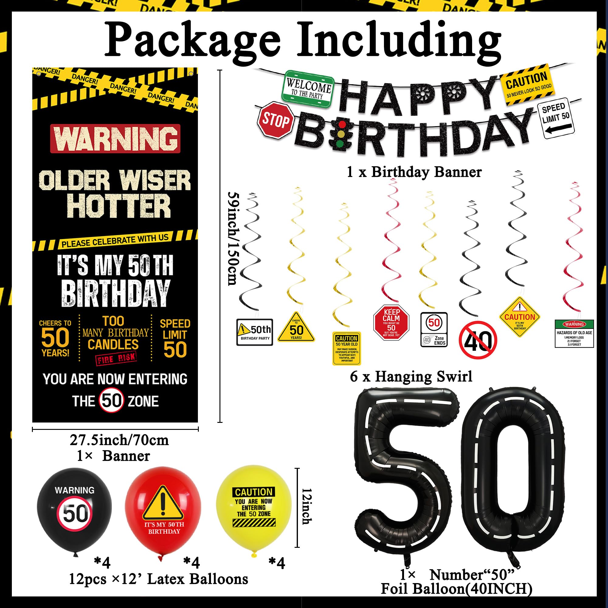 [50th Birthday Decor] - Our 50th birthday party decorations set with caution logos in black, yellow and red includes 1PC "Happy Birthday" banner, 1PC "Happy 50th Birthday" door cover, 8PCS hanging swirls, 12PCS balloons and number "50" balloons. Enough quantity to meet your 50th birthday party decorating needs and perfectly decorate your 50th Bday party
