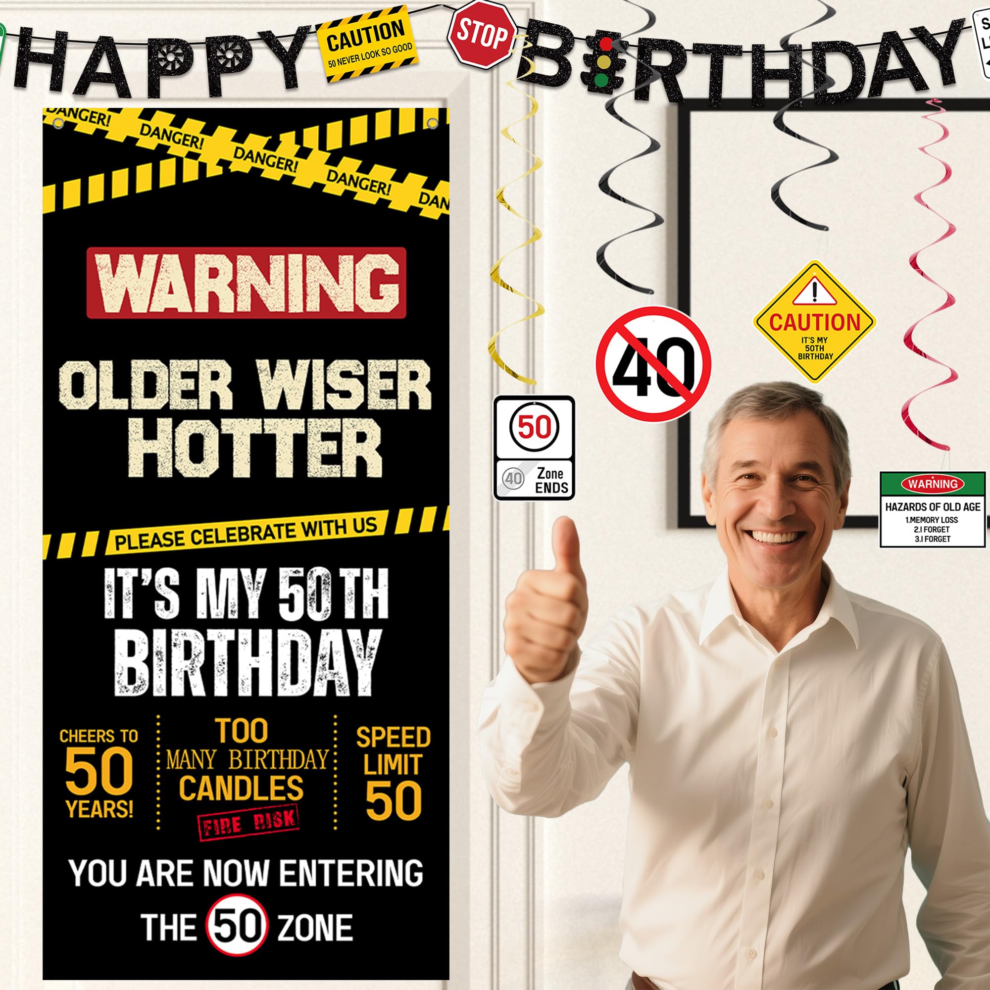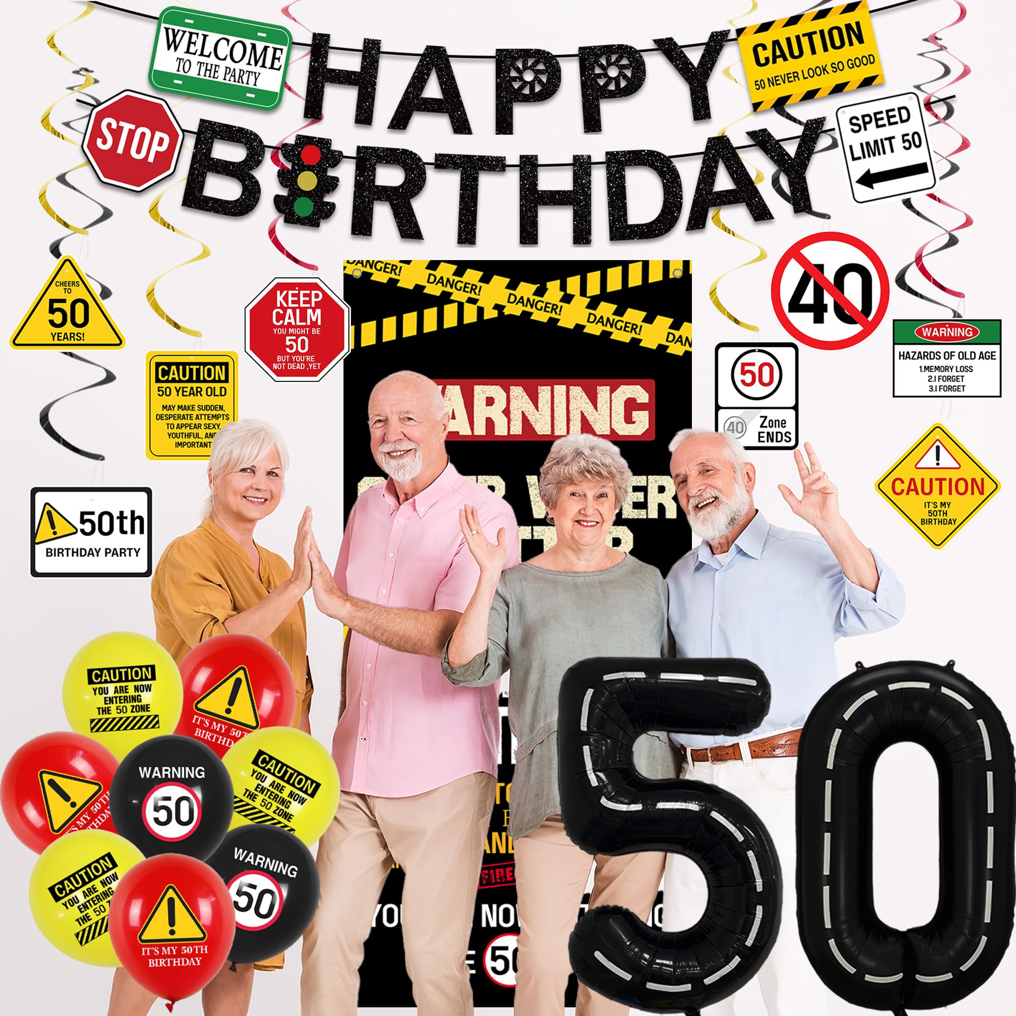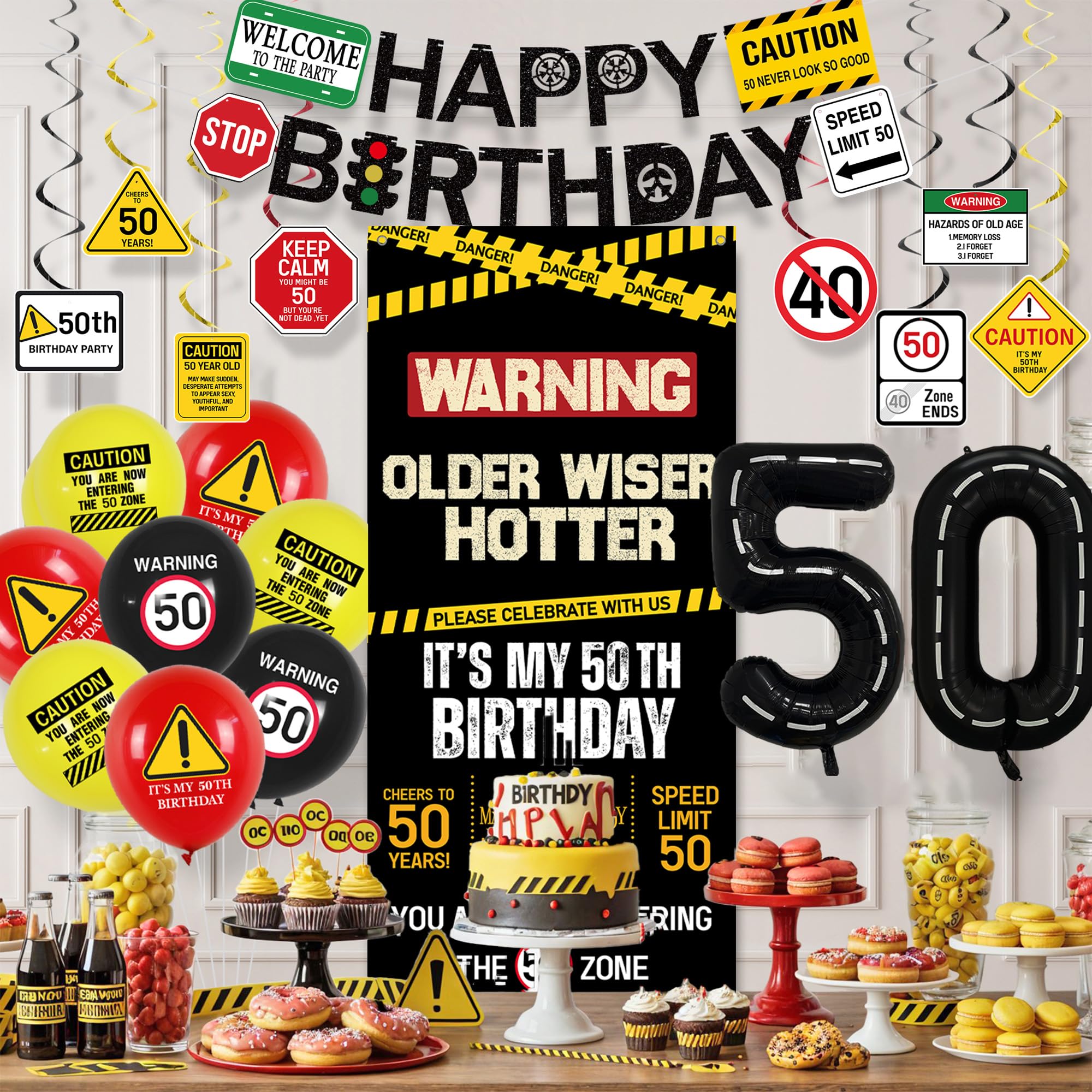 [50th Birthday Decor] - Our 50th birthday party decorations set with caution logos in black, yellow and red includes 1PC "Happy Birthday" banner, 1PC "Happy 50th Birthday" door cover, 8PCS hanging swirls, 12PCS balloons and number "50" balloons. Enough quantity to meet your 50th birthday party decorating needs and perfectly decorate your 50th Bday party