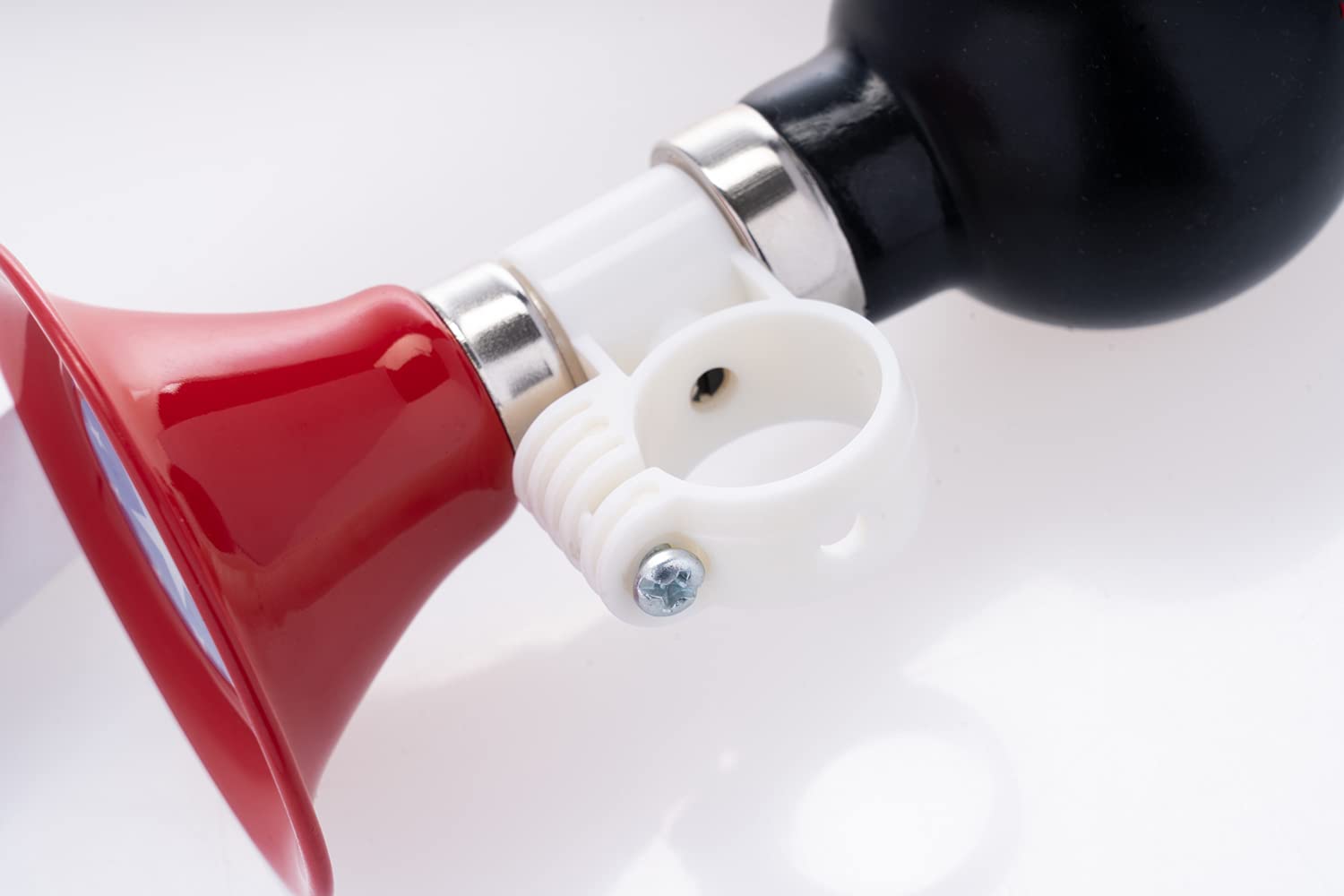 Special screw design, easy to install and remove from the handle bar of a bike. -High quality and well made. No UNPLEASANT SMELL. -Loud and long sound. Funny Loud tells others your coming. -This blue & red bike horn is the best gift for boys. Material: Metal and plastic