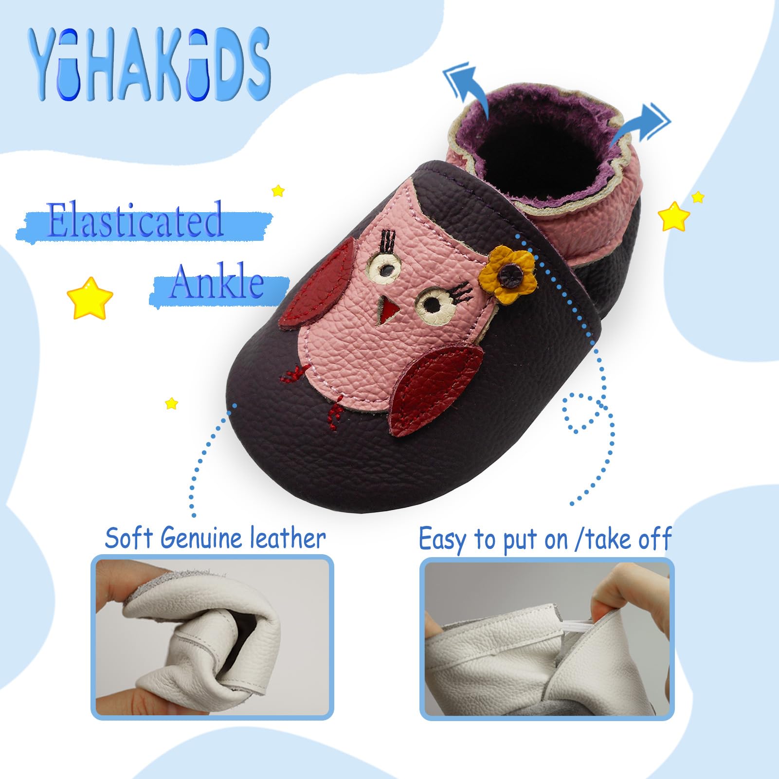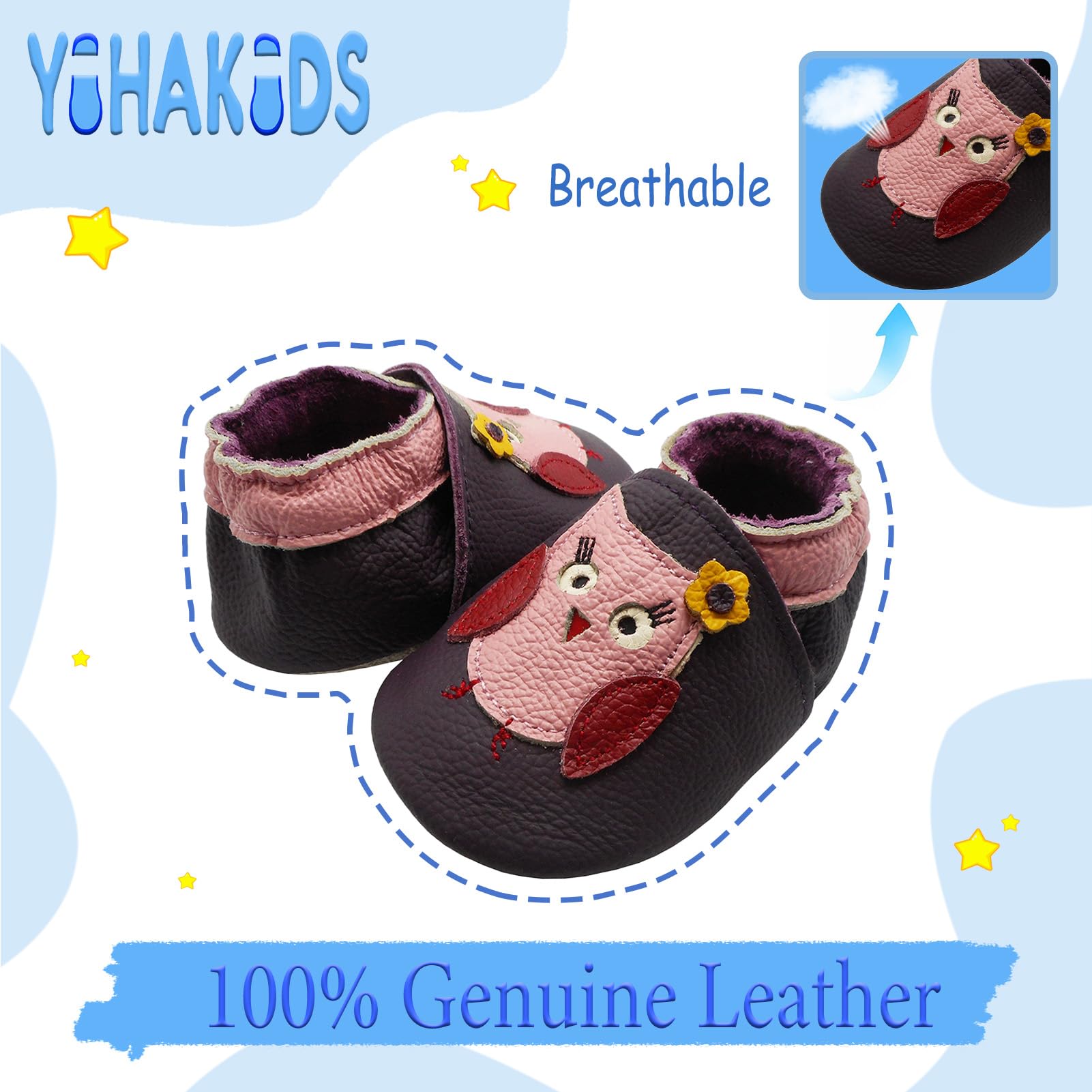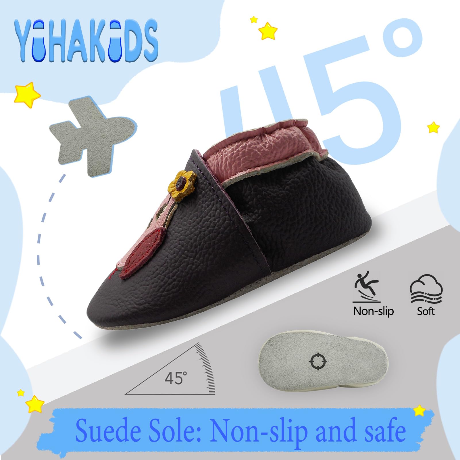 YIHAKIDS baby leather shoes are made of soft genuine cowhide leather with a non slip suede sole, providing a great grip on the floor.