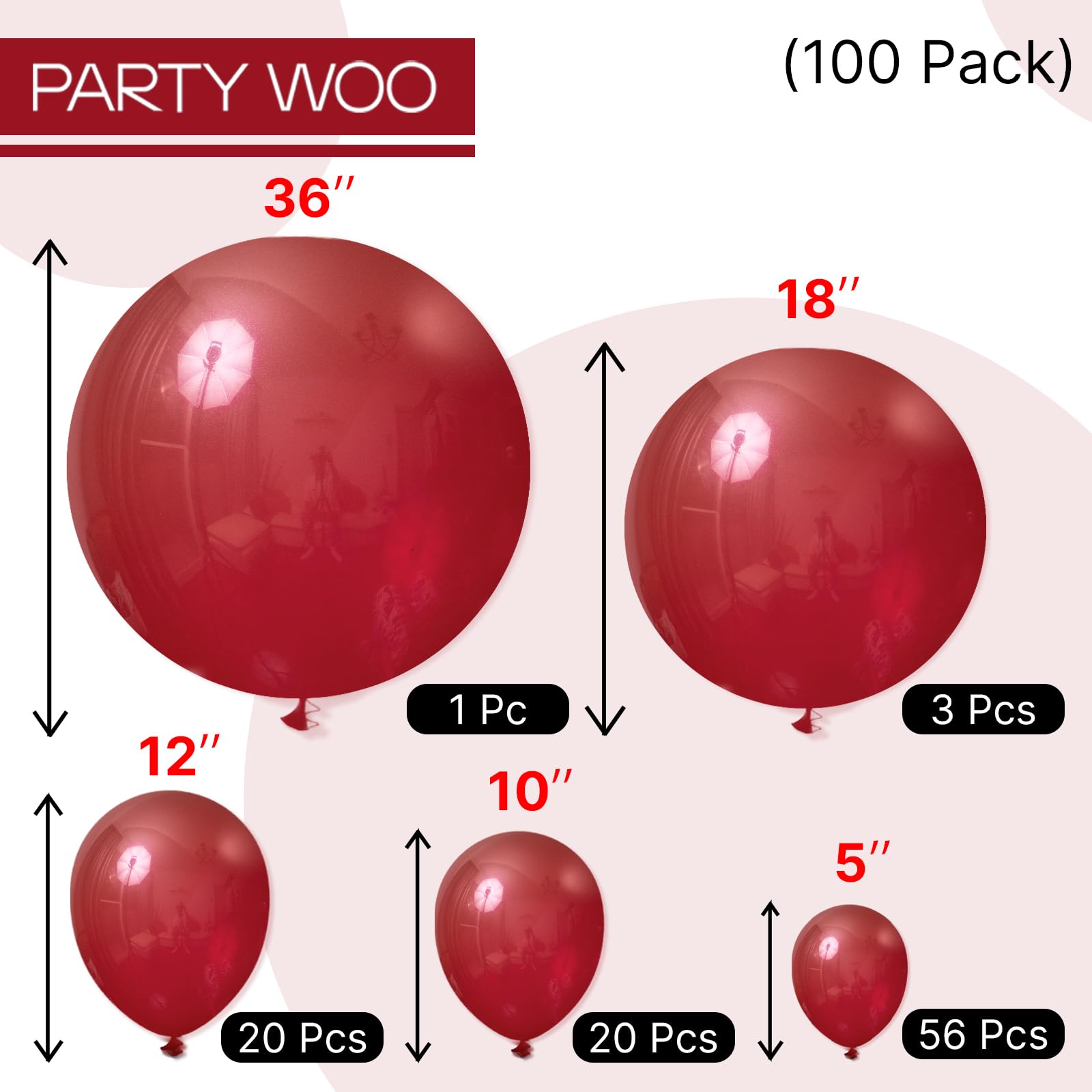 100 PCS RED BALLOONS DIFFERENT SIZES: Package includes 36 inch balloon (1 pc), 18 inch balloons (3 pcs), 12 inch balloons (20 pcs), 10 inch balloons (20 pcs), 5 inch balloons (56 pcs)