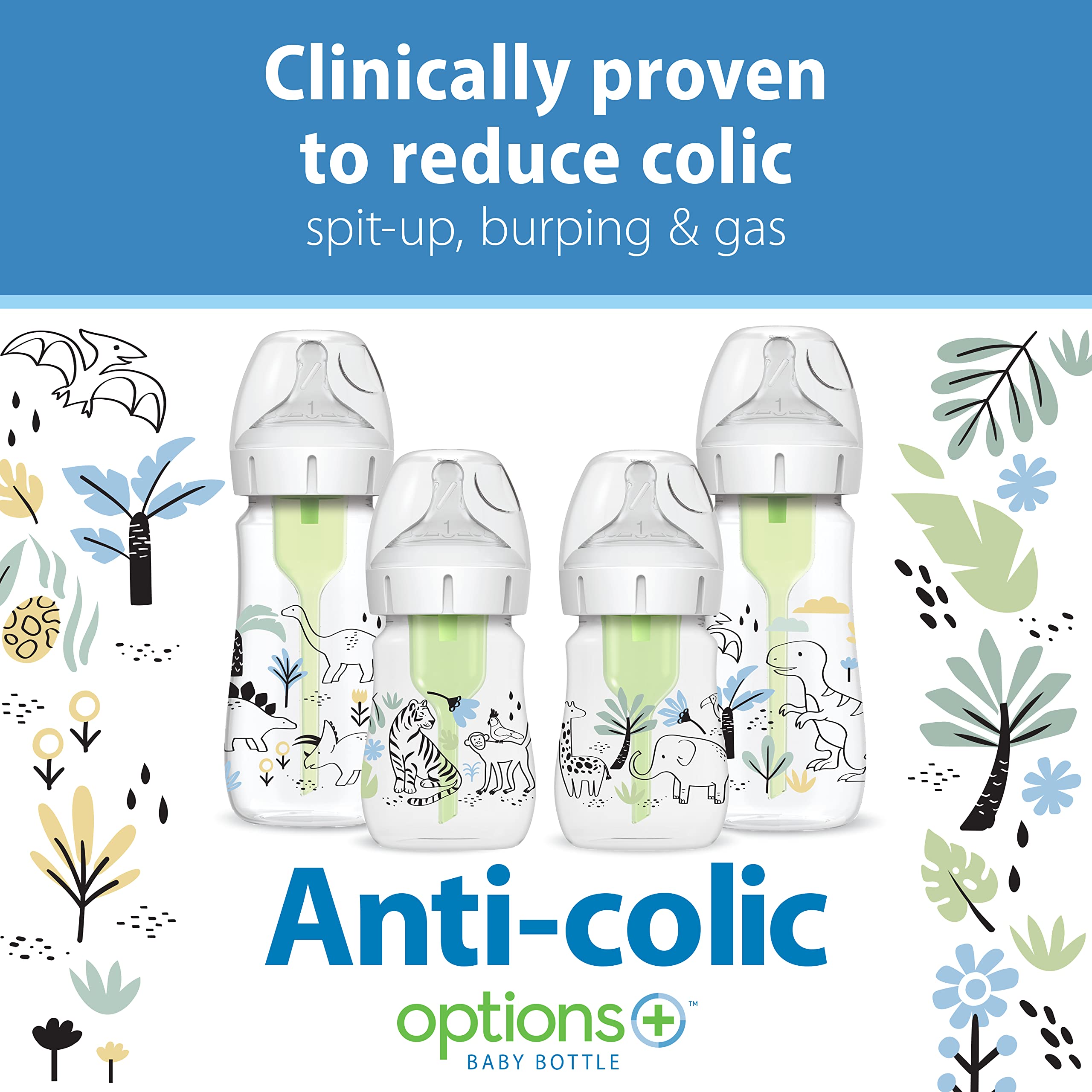 Contains (2) Dr. Brown’s Natural Flow Anti-Colic Options+ Wide-Neck Baby Bottle Designer Edition Bottles, Dinosaur Designs, 9 oz/270 mL, Level 1 Nipple, 0m+ and (2) Dr. Brown’s Natural Flow Anti-Colic Options+ Wide-Neck Baby Bottle Designer Edition Bottles, Jungle Decos, 5 oz/150 mL, Level 1 Nipple, 0m+