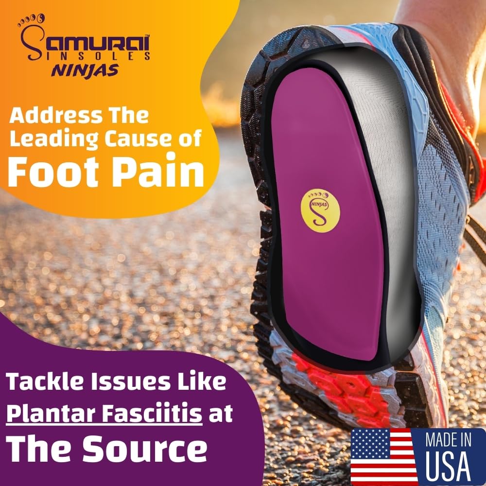FOCUSED RELIEF: Samurai Insoles Ninjas are all about that arch. They go after the real cause of plantar fasciitis, heel pain, bunion discomfort, shin splints, neuromas, tendonitis, and more. Forget cushiony gimmicks - Ninjas provide the solid, springy support that tackles pain at its core. Imagine the relief you'll feel when you finally address the root of your discomfort.