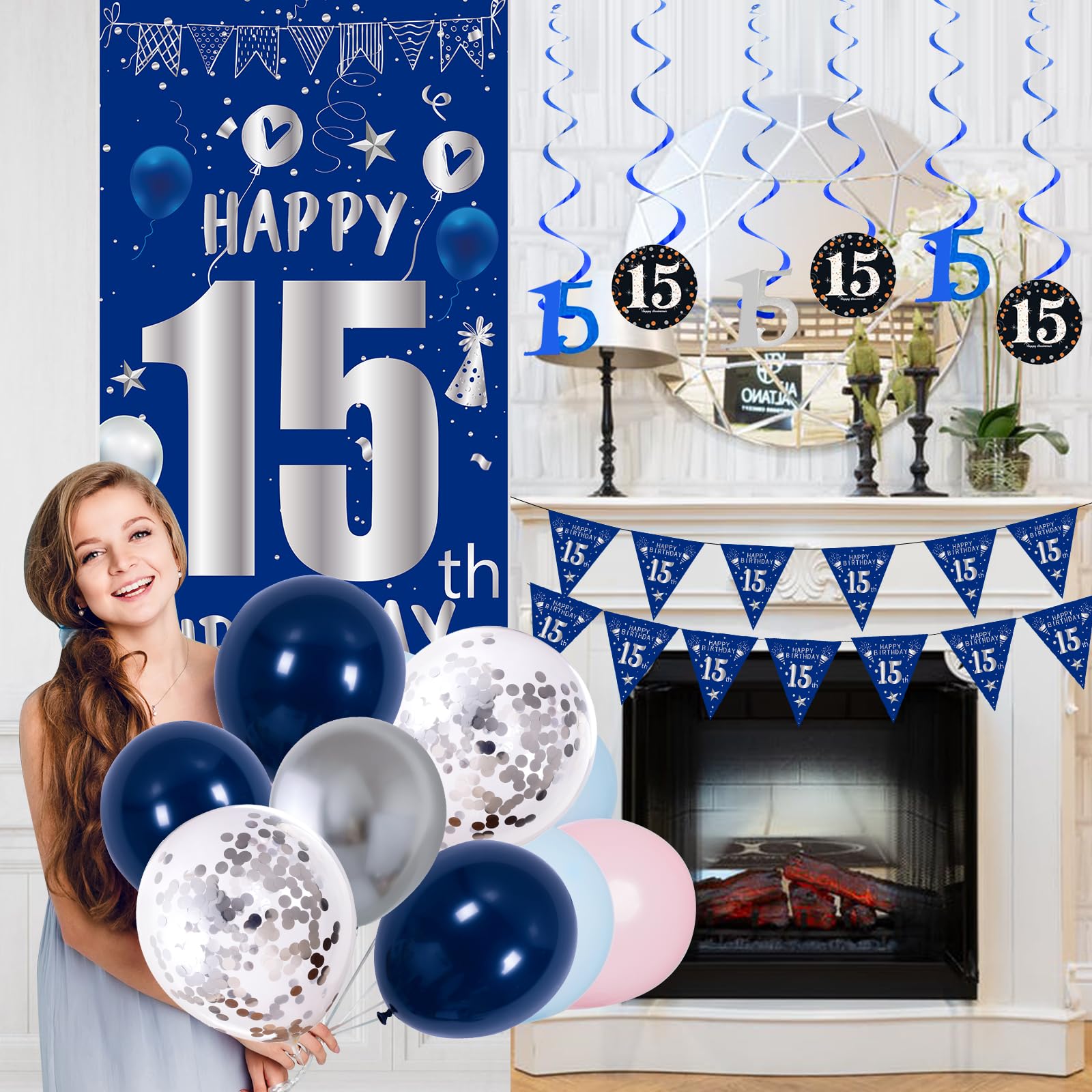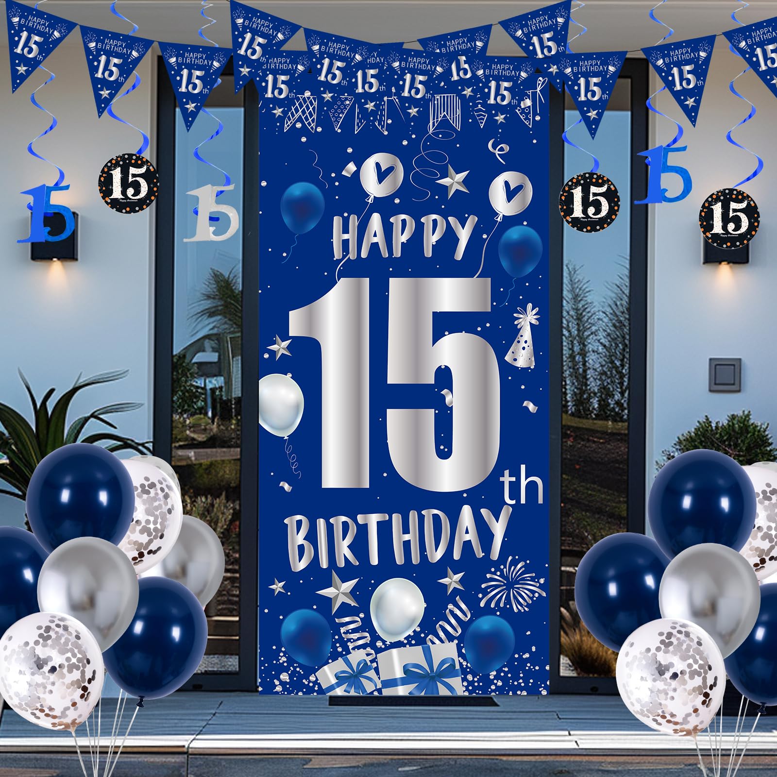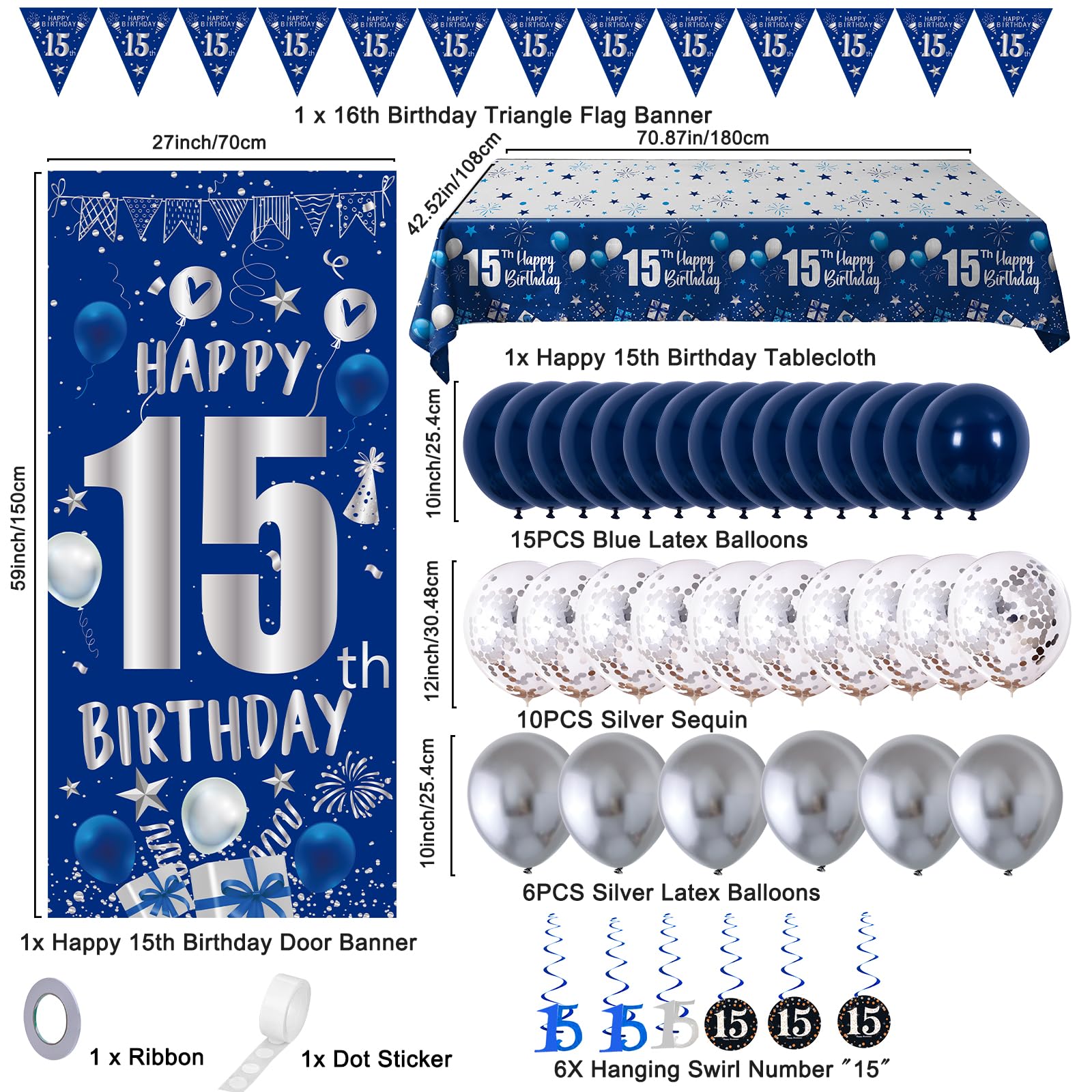 🎉【15th Birthday Decorations for Boys】This blue and silver birthday decorations party supplies are designed for 15 year old boys and girls birthdays; Package list: 15x navy blue latex balloons, 10x silver confetti balloons, 6x silver latex balloons, 6x blue hanging swirls with number 15 pendant, 1x blue silver happy 15th birthday door banner, 1x blue silver 15th birthday tablecloth, 1 set x number triangle flag banner, 1x dot sticker, 1x ribbon