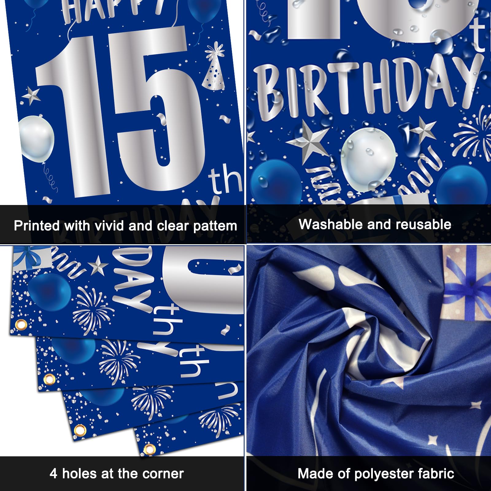 💙【High Quality, Safe & Durable】The happy 15th birthday decorations balloons for boys girls are made of high quality thickened latex material, pressure resistant and durable, not easy to burst, can be used for a long time; The silver “HAPPY 15th BIRTHDAY” sign printed on the tablecloth, triangle flags, and birthday door banner is bright and colorful and won't fade easily