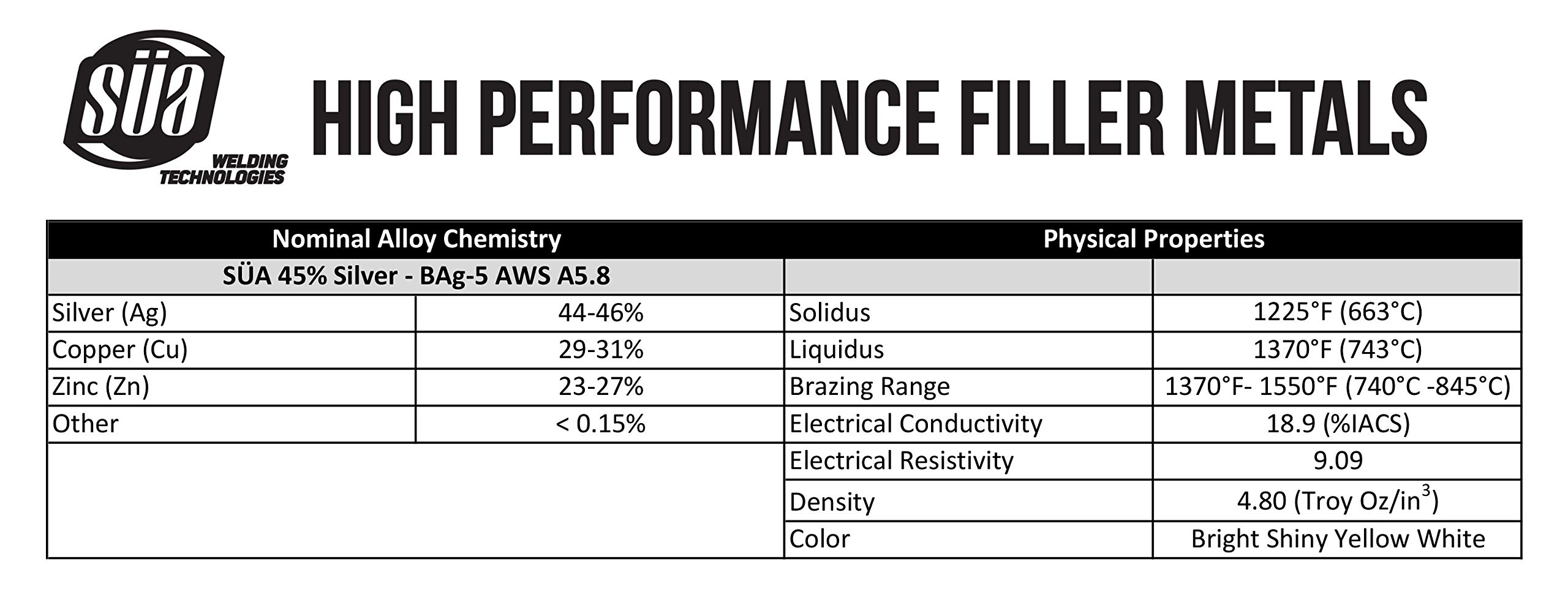 Complies with ANSI/AWS A5.8 ASME SFA 5.8, QQ-B-654A Class BAg-5 specifications. It can be used for brazing of tubular assemblies, brazing of musical brass instruments, brass lamps, aircraft engine oil coolers. SÜA 45% Silver is a general-purpose, brazing filler metal for use where cadmium-free filler metal is required.