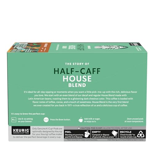 Starbucks Half-Caff House Blend is ideal for all-day sipping or moments when you want a little pick-me-up that's made with the rich, delicious flavor you love. Start with an even blend of decaf and regular Starbucks House Blend and roast them to a glistening dark chestnut color. This coffee is loaded with flavor, balancing notes of toffee and cocoa and just a touch of sweetness from the roast. A true reflection of the very first Starbucks blend, with just enough caffeine. Nestlé uses Starbucks trademarks under license. © 2025 Starbucks Coffee Company. Keurig and K-Cup are trademarks of Keurig Green Mountain, Inc., used with permission.