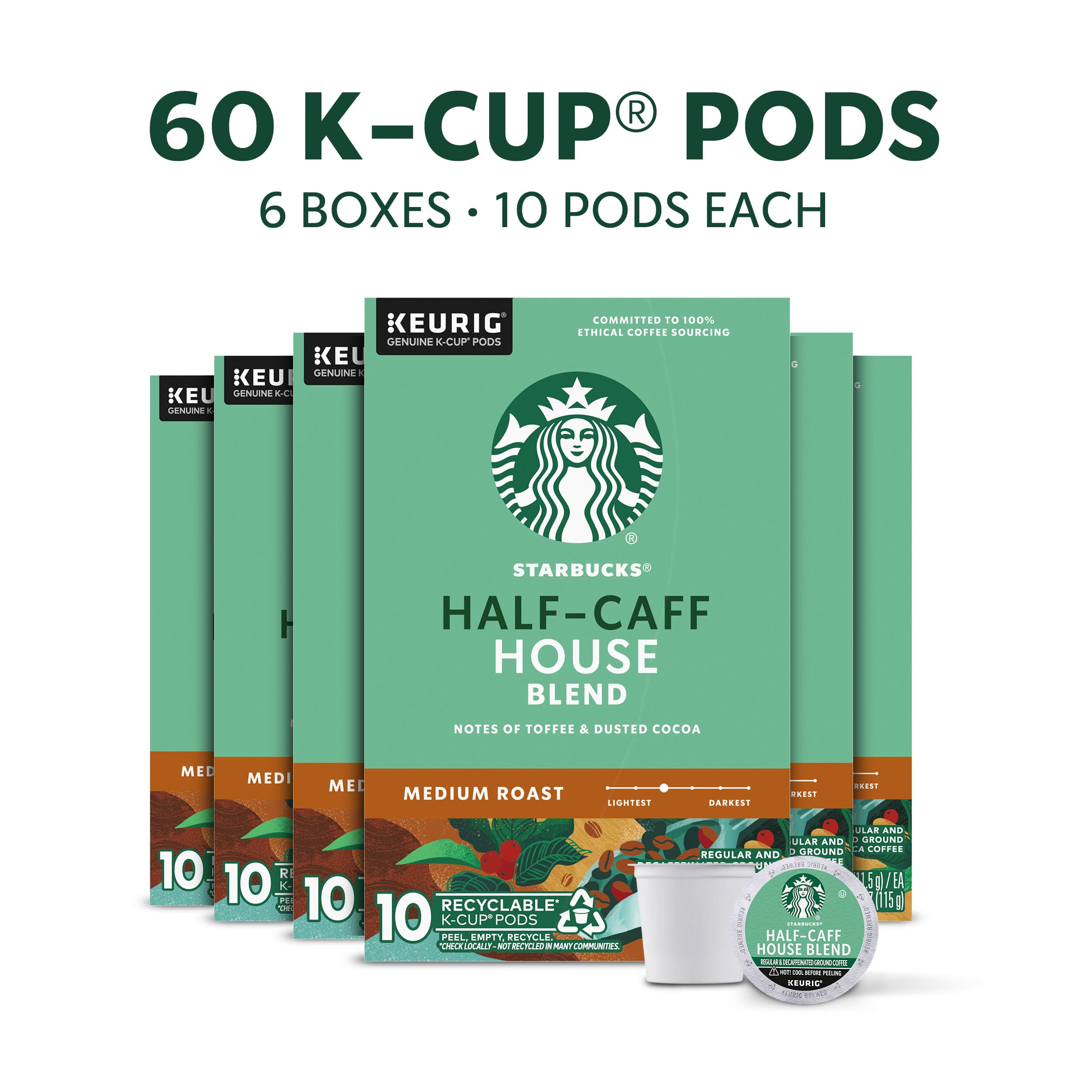 PREMIUM COFFEE IN A K-CUP POD: Enjoy the Starbucks coffee you love at home. These 6 boxes of 10 Starbucks Half-Caff House Blend Medium Roast K-Cup pods feature just enough caffeine and are designed for Keurig coffee makers—60 pods total