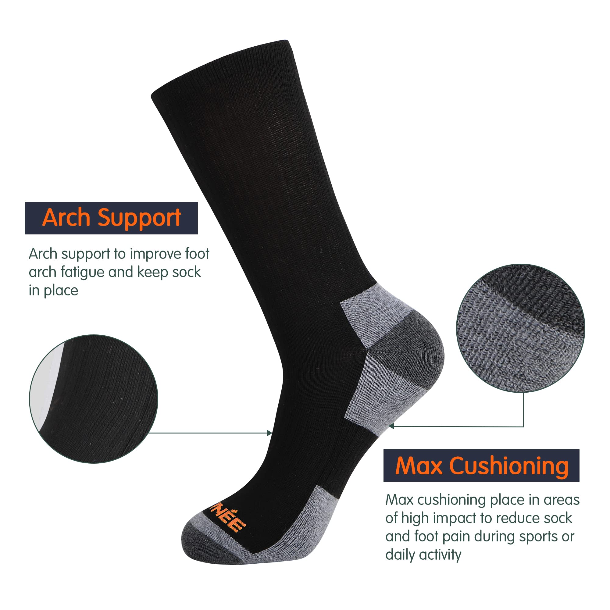 PERFORMANCE: Max Cushioning-Max Cushioning place in areas of high impact to reduce sock and foot pain during sports or daily activity. Deep Heel Pocket-Engineered heel pocket to provide true fit during wear. Arch support-Arch support to improve foot arch fatigue and keep sock in place. Reinforced heel and toe-Reinforcement in heel and toe provide durability in high stress areas to dramatically in improve product life.