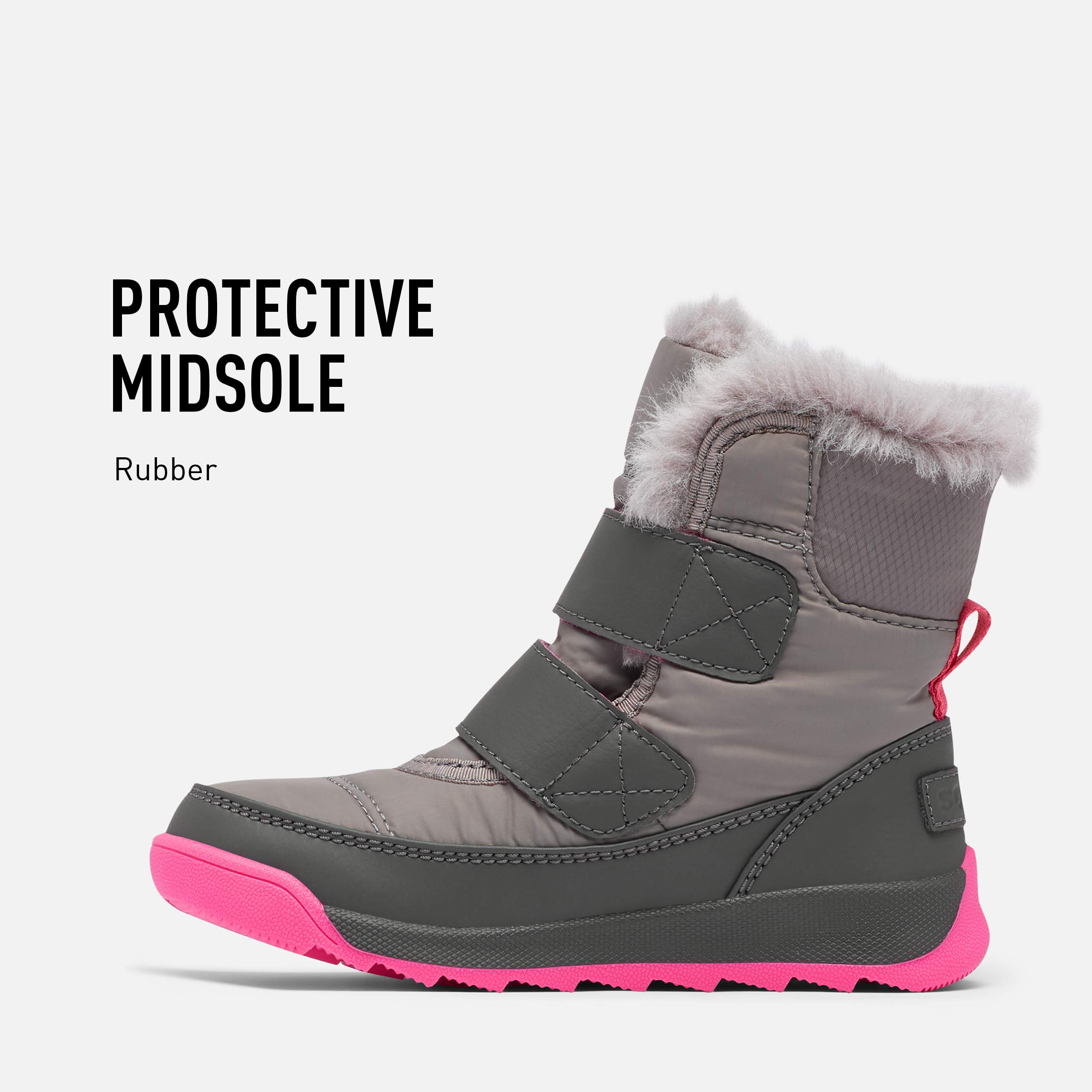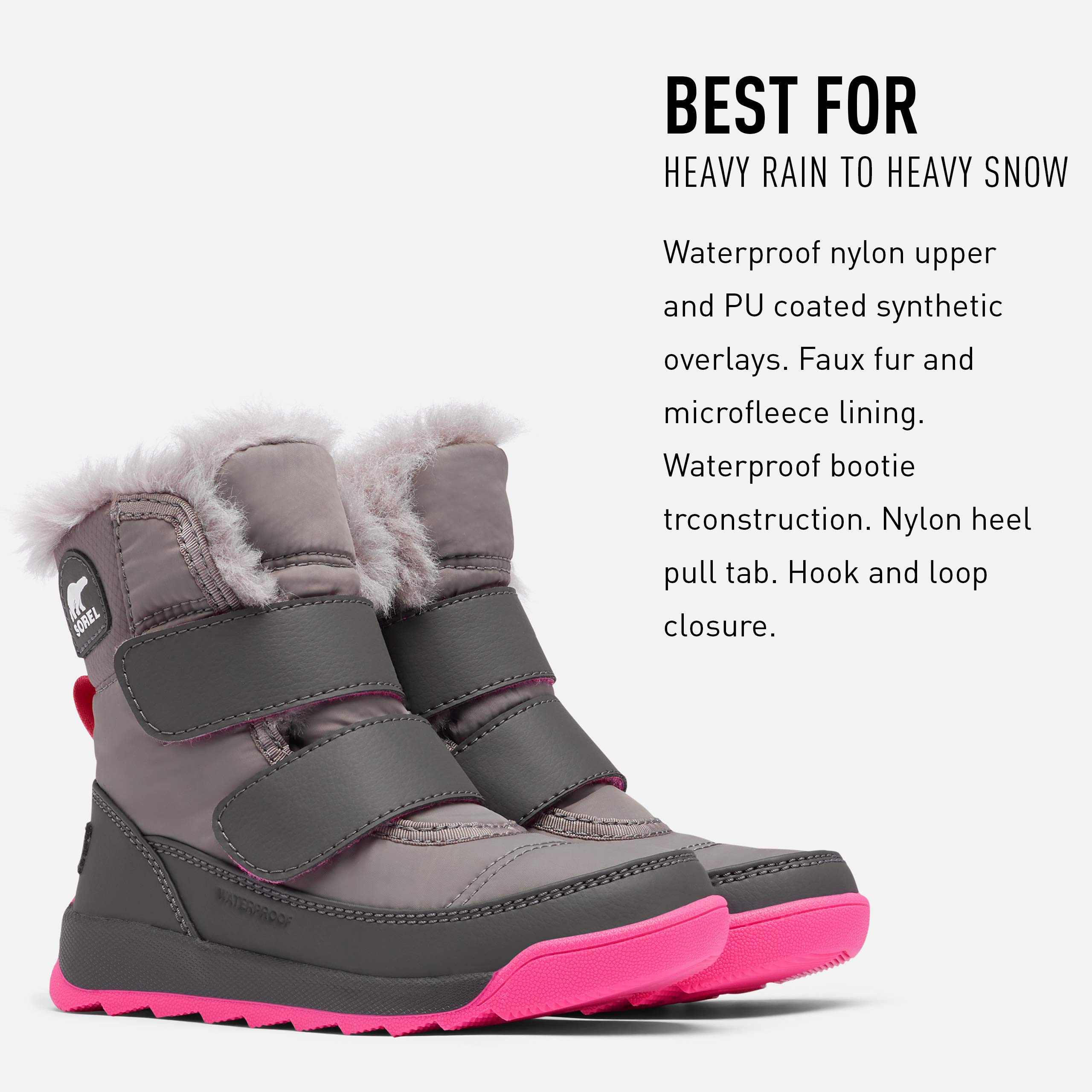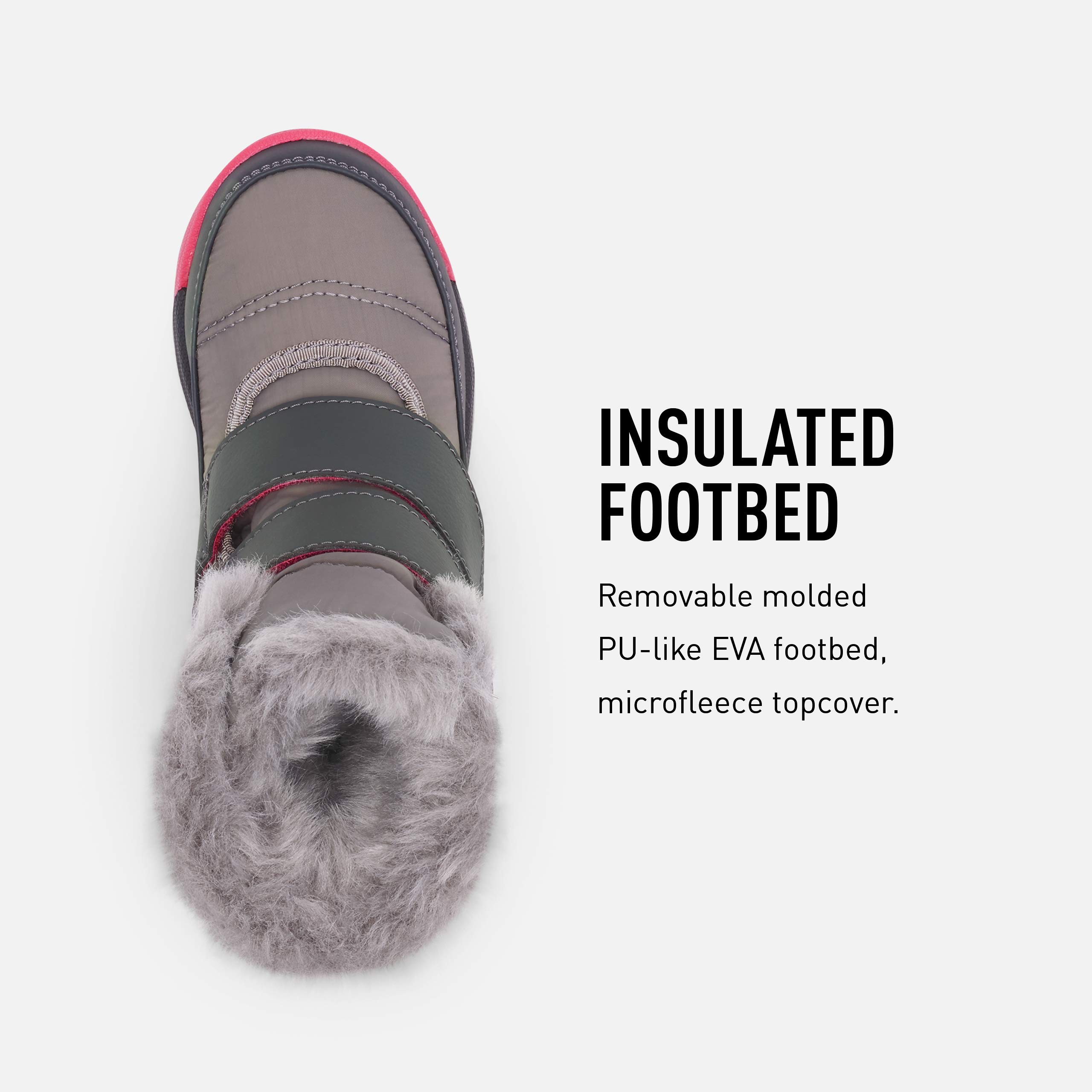 Description An easy choice for winter fun, these boots are cozy, waterproof, and oh-so simple to put on and take off. The durable upper is lined with faux fur and microfleece, plus 200g insulation for even more warmth. Combine that with the EVA footbed and high-traction rubber sole, and you've got the recipe for happy little feet.